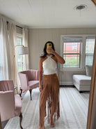 BURNT ORANGE MINI SHORTS WITH FRINGE HEM - SMALL