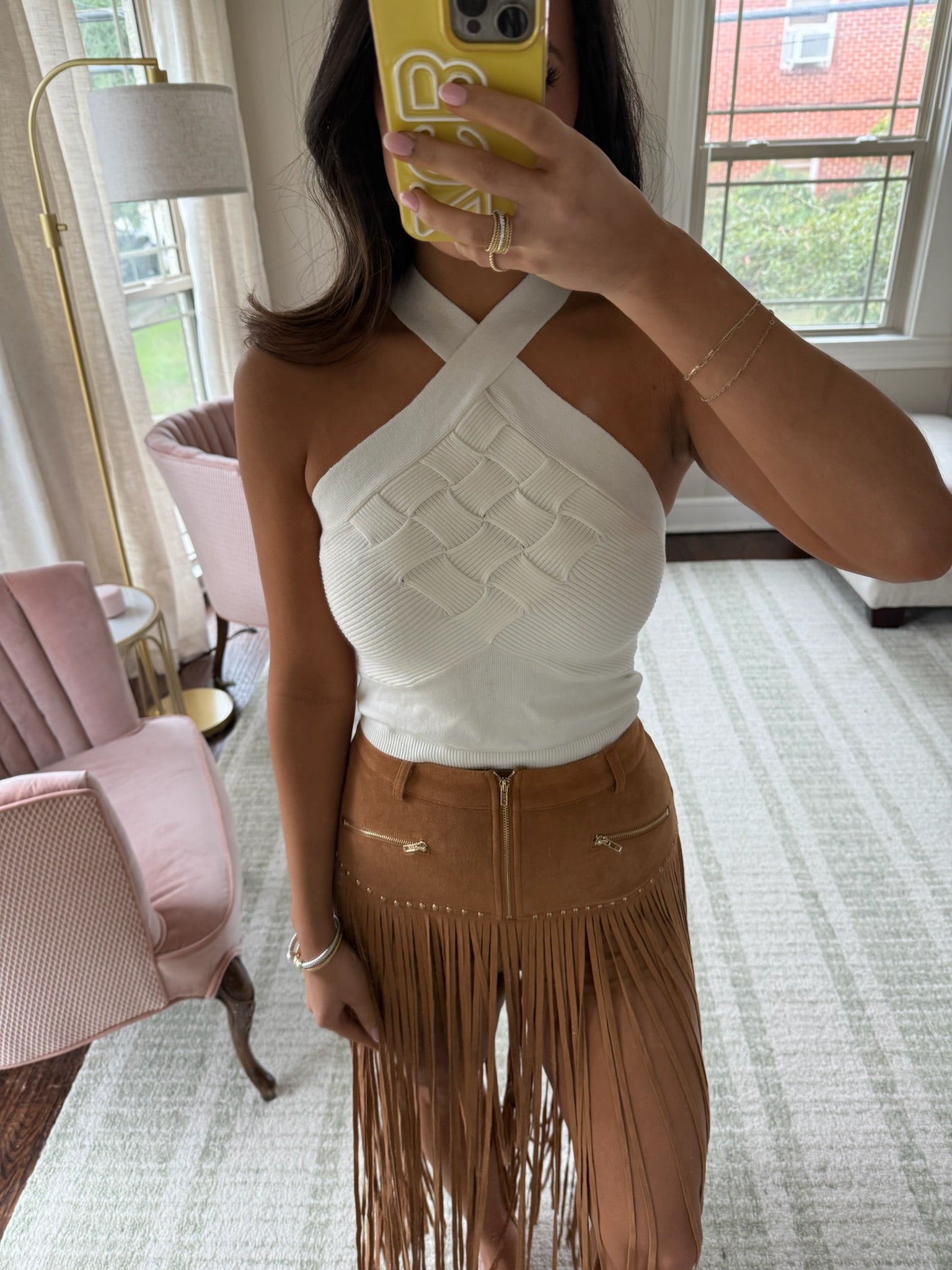 MINI shorts with the fringe overlay.
