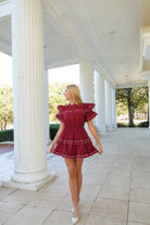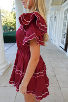 Featuring a dark cherry red with pink and white piping detailing, a cinched waist, and flared ruffled sleeves, this dress is so feminine and girly-- we love it styled with heels for a fun occasion or night out!