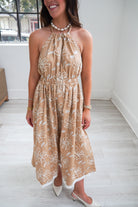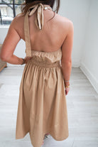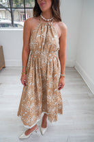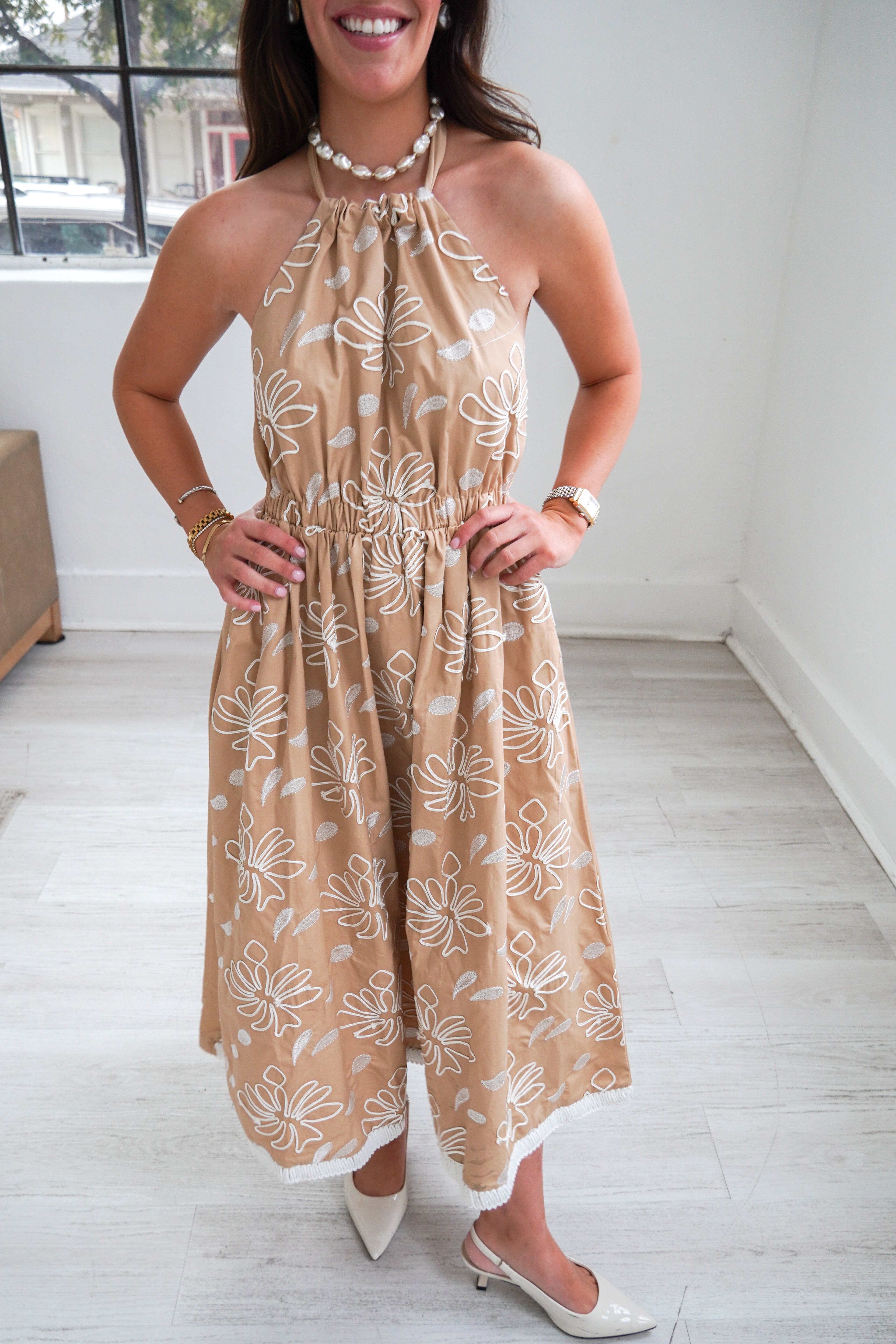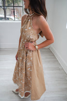 Featuring a soft and feminine halter-neck midi dress!! This dress is perfect for sunny days! With a beige tone, white floral embroidery, and elastic waistband. It is the perfect dress for all of your Spring & Summer weekends, girls night, or picnics!