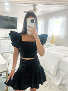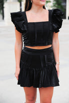 - With ruffled cap sleeves and a precious mini skirt, this two piece set is the perfect gameday set for all schools!!