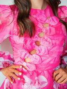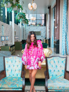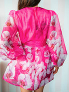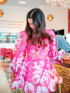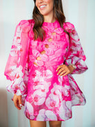 - Featuring a fun pink, the prettiest floral pattern, bows along the front, and sheer puff long sleeves, this mini dress is flirty, fun and our new favorite party dress!!! We are obsessed with this dress for your next birthday, wedding, our party!
