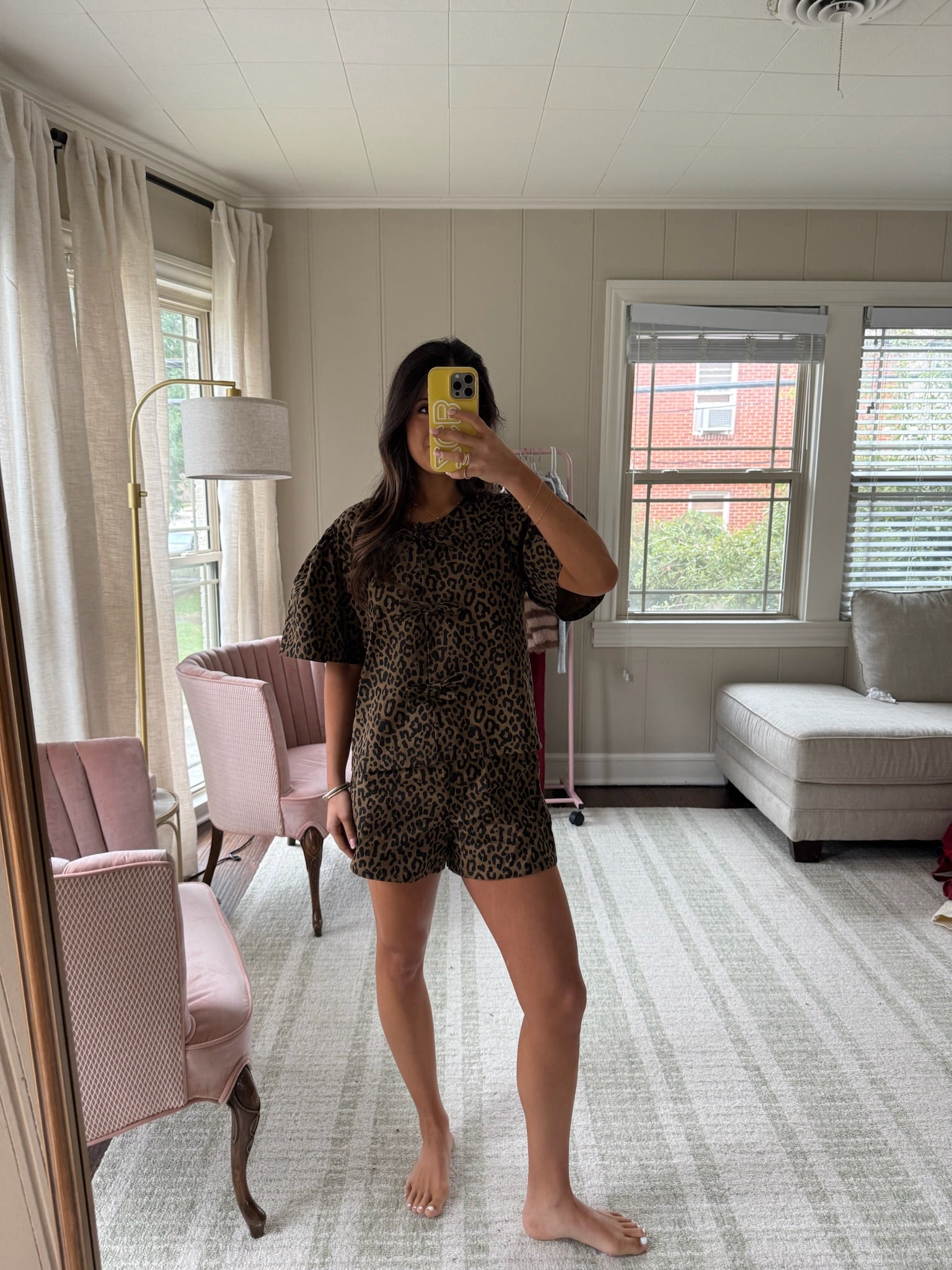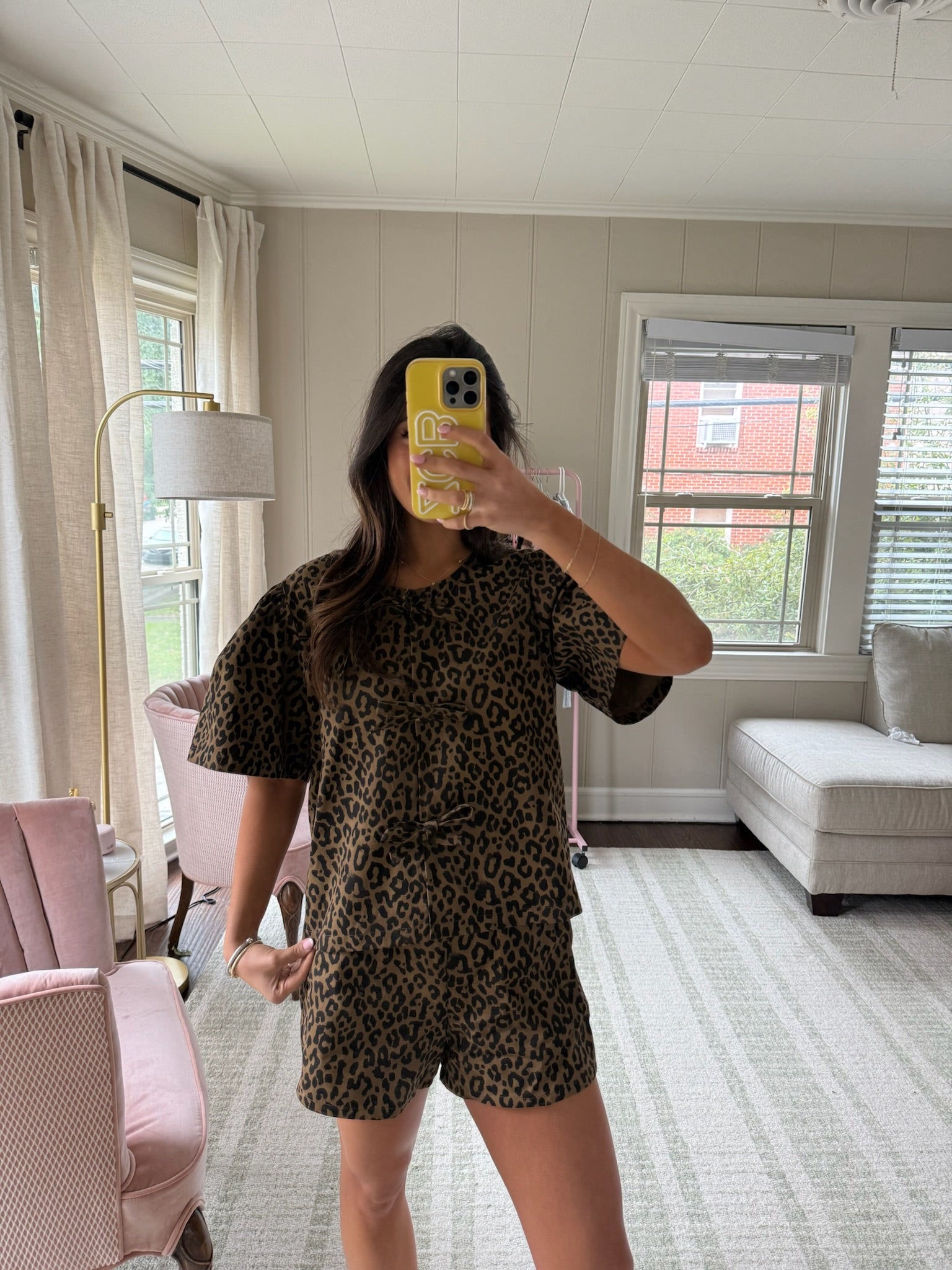 Bows along front of top. Smocked waistband on shorts with pockets.