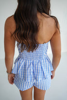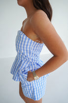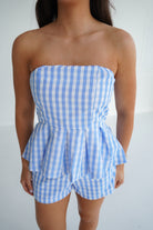 This playful two-piece set features a fresh blue-and-white gingham print that’s perfect for sunny days. The strapless top is designed with a structured, straight-across neckline and a flattering fitted bodice that flows into a soft peplum hem for a flirty, feminine touch.