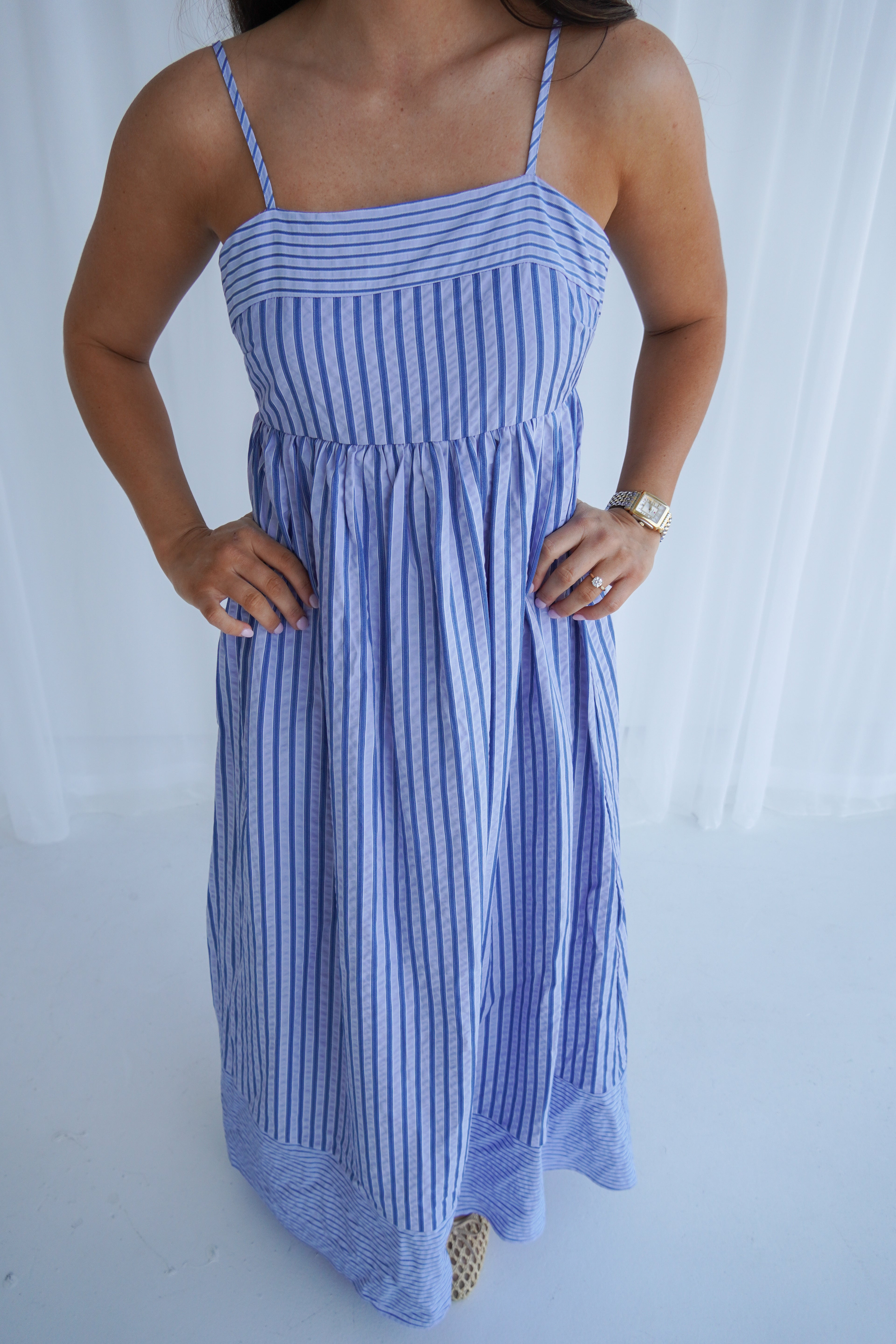This maxi dress features classic blue-and-white vertical stripes for a fresh, nautical vibe. Featuring a square neckline with thin adjustable spaghetti straps, a flowy, maxi-length skirt with a soft hem— this dress is light and breezy, perfect for summer days or tropical vacations.