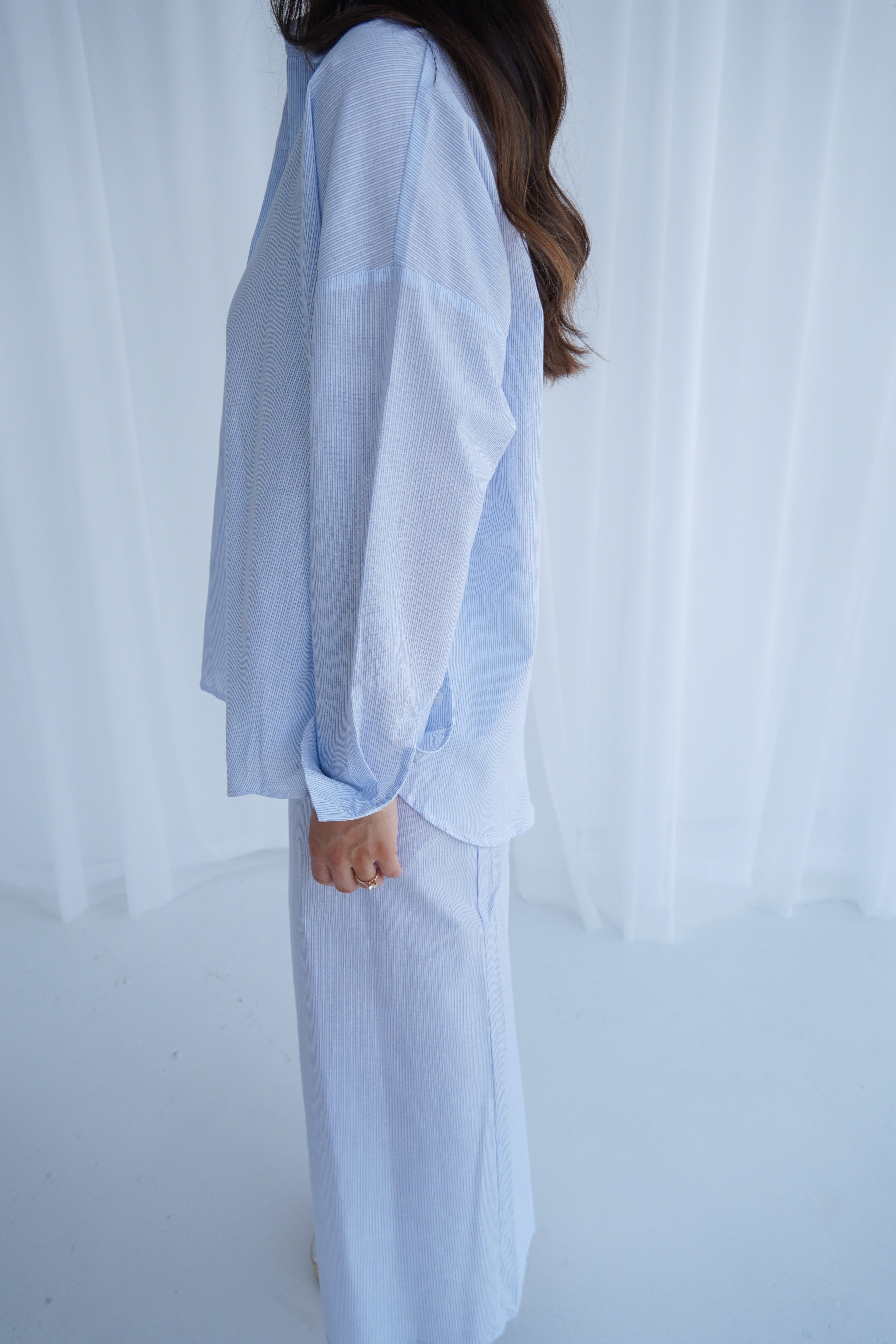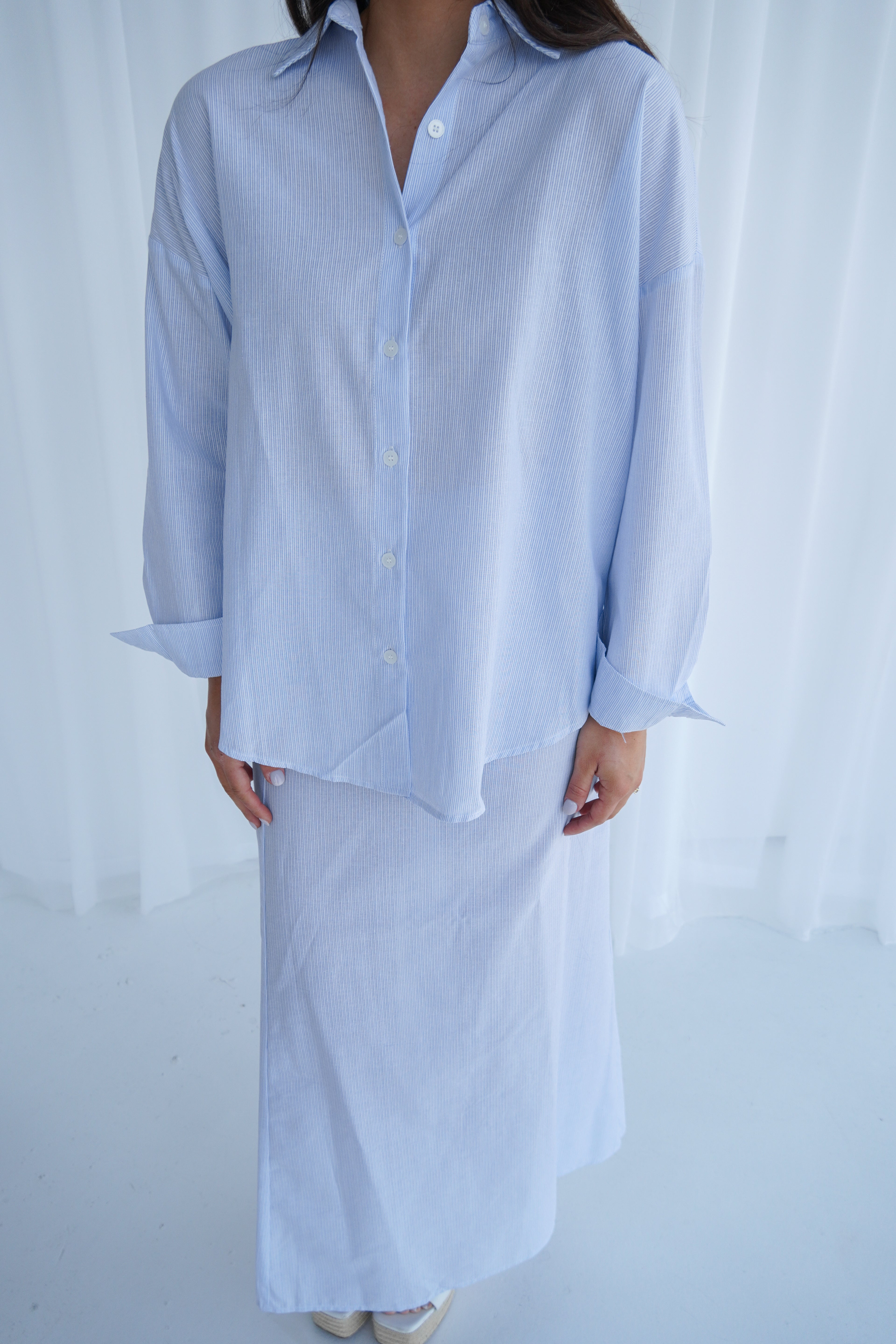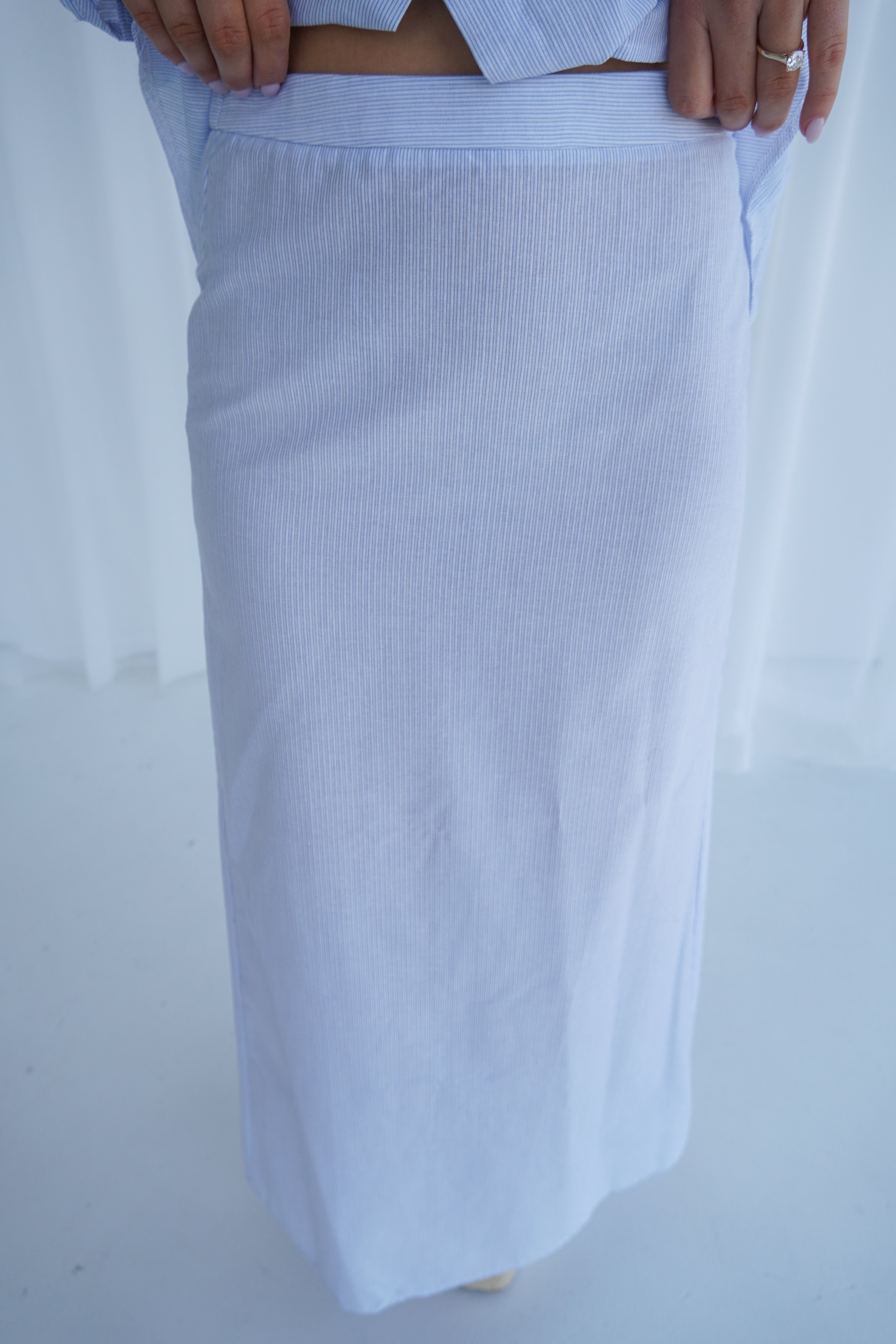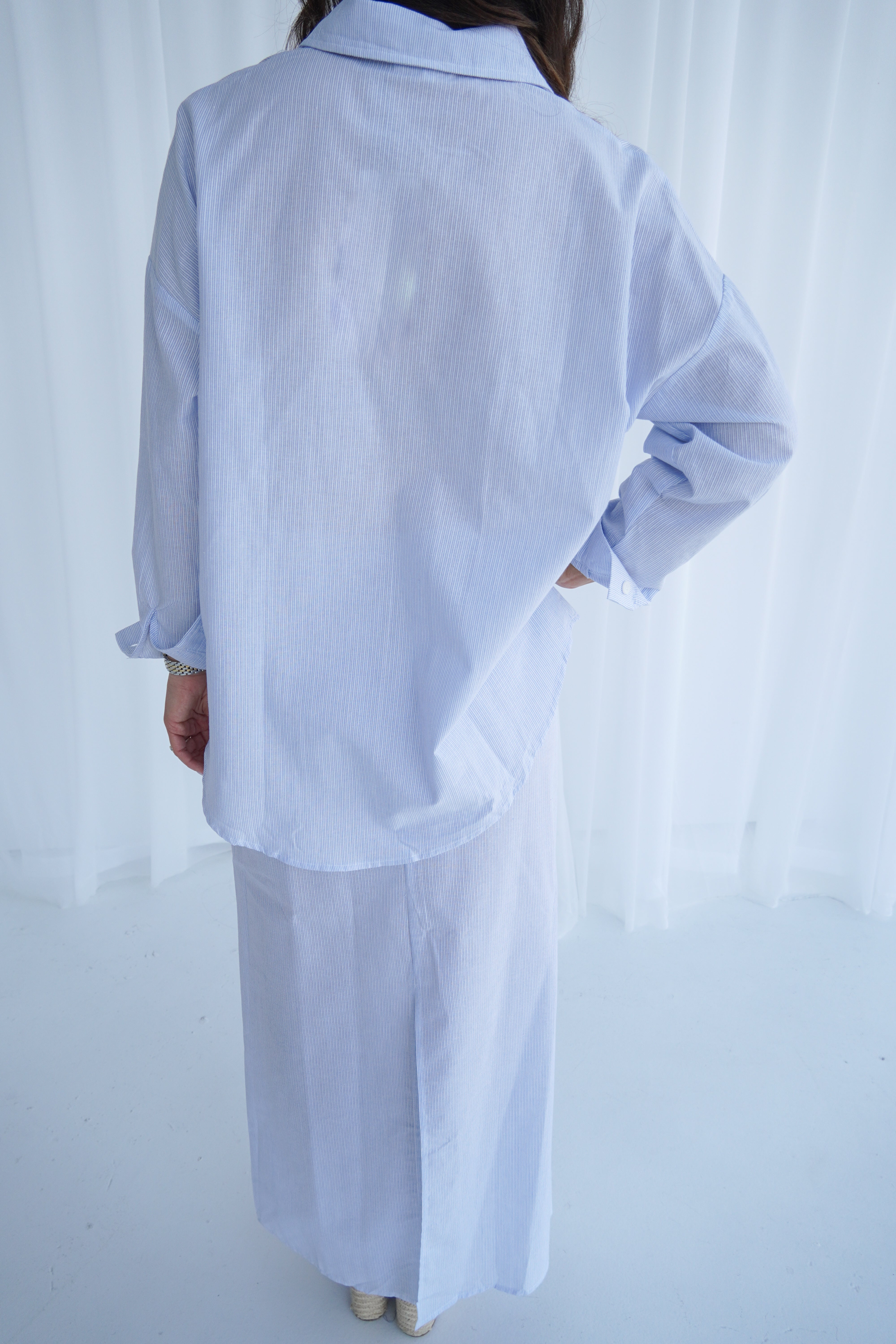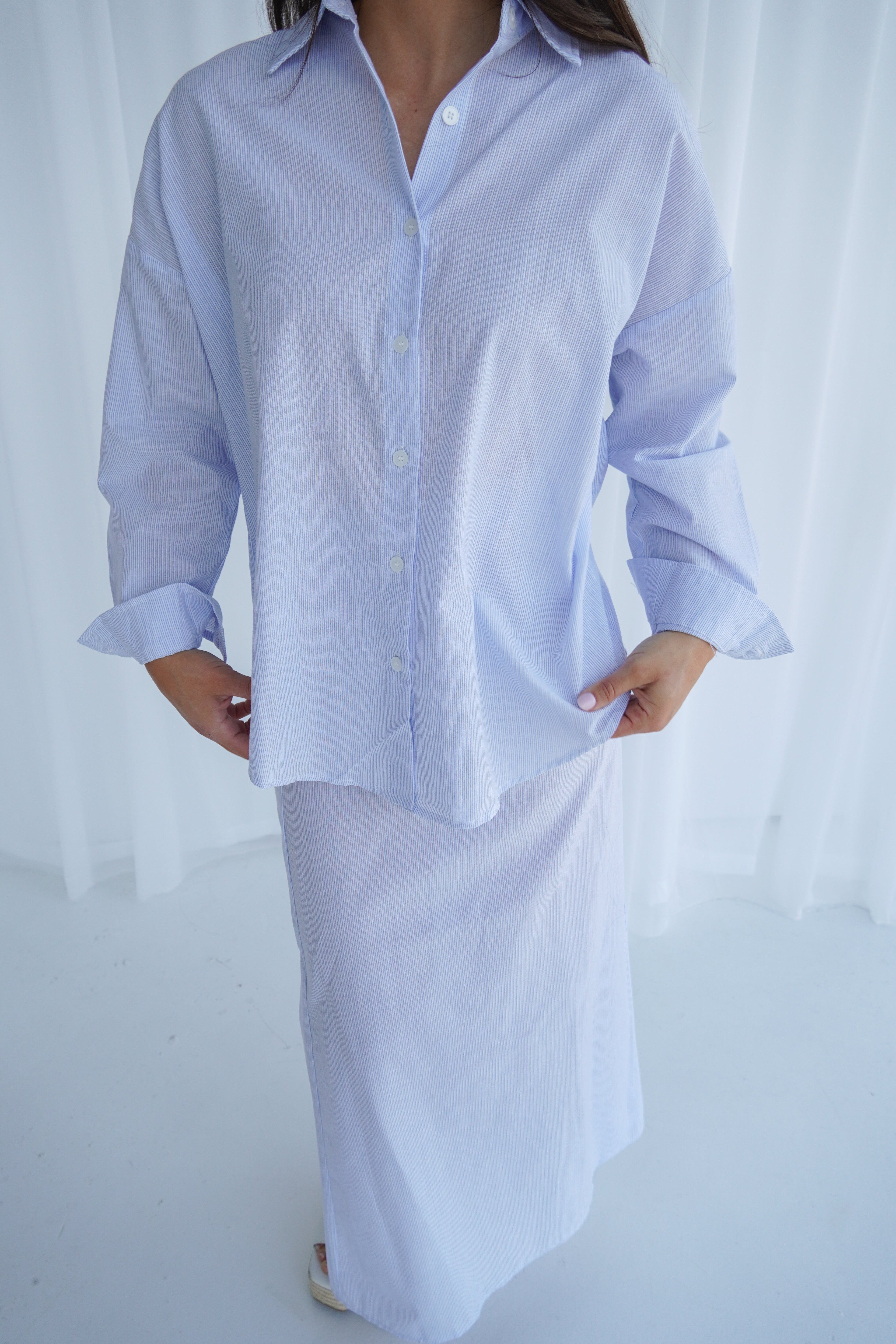 Our new obsession! This effortless two-piece set features a relaxed button-up top paired with a straight fit maxi skirt in chic blue and white fine stripes. Perfect for days when you want to look put-together without the fuss—just slip it on and you're out the door! Love it styled with sandals or wedges this Spring and Summer.