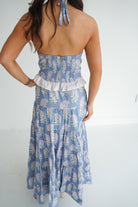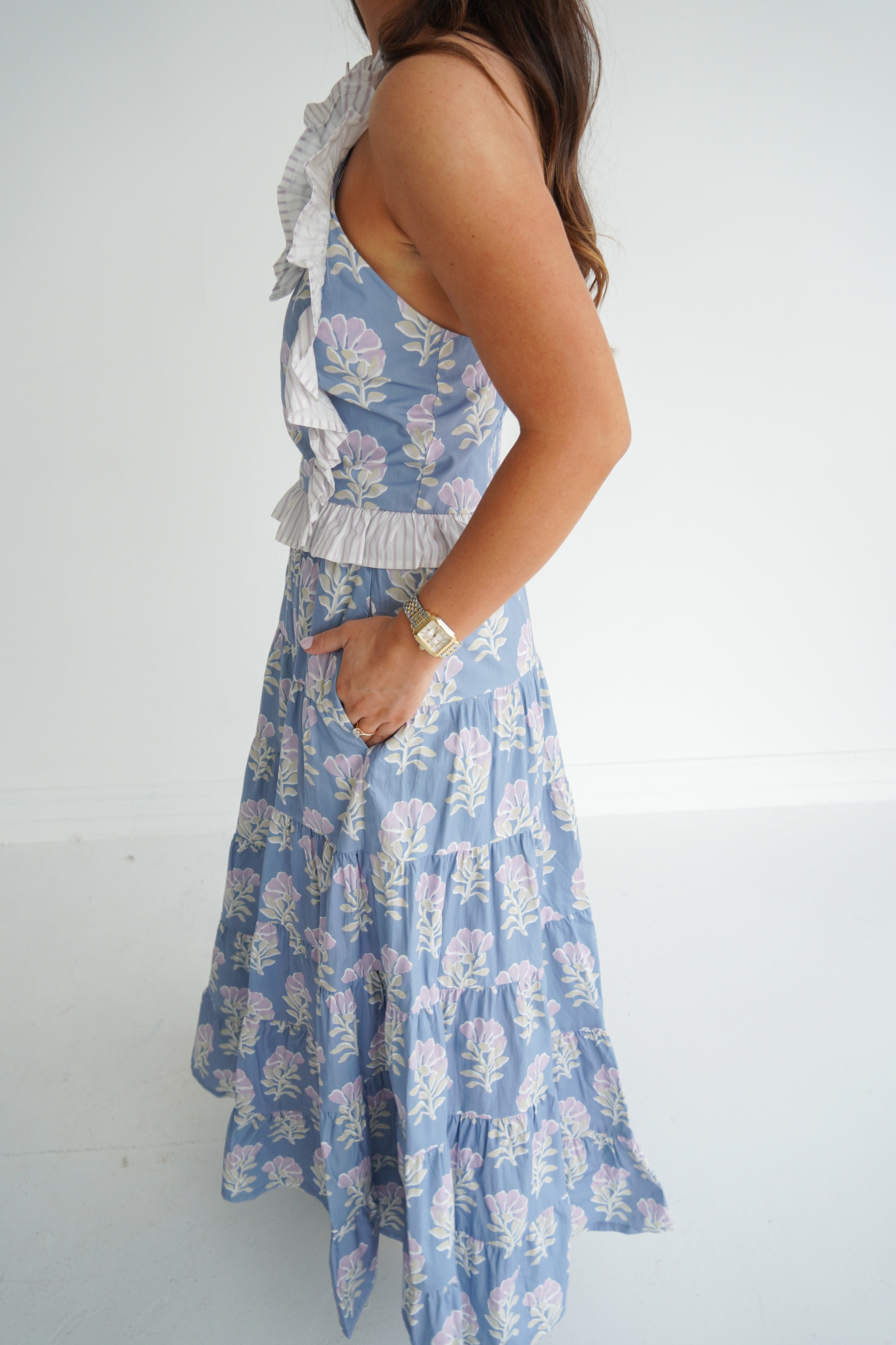 This romantic two-piece set features a soft dusty-blue base adorned with a delicate lavender and ivory floral print for an effortlessly feminine feel. The halter-style top showcases a statement ruffled neckline with a keyhole cutout at the center, adding a touch of drama and charm. Layered ruffle trim frames the bodice, creating beautiful texture and movement while flattering the silhouette.