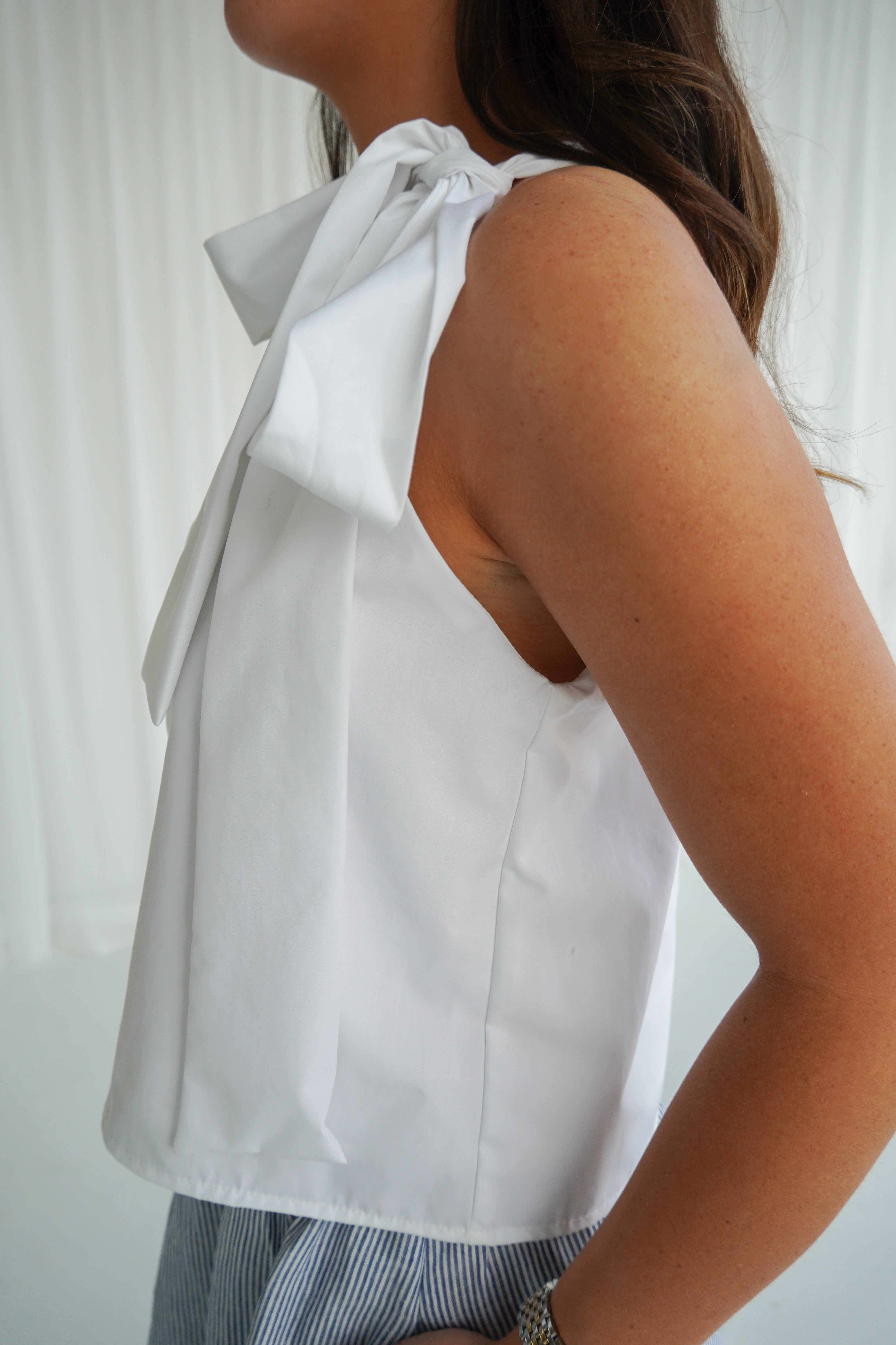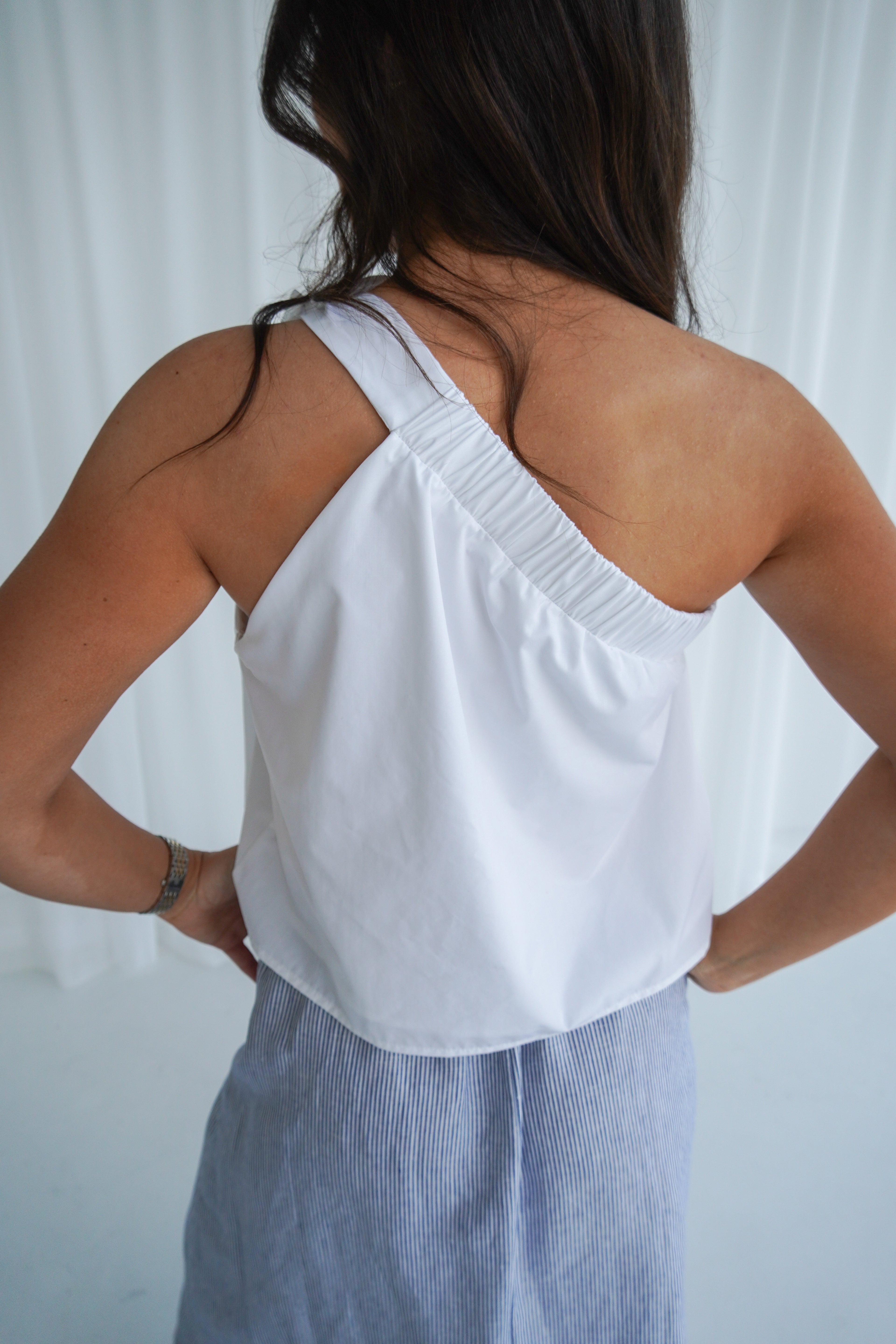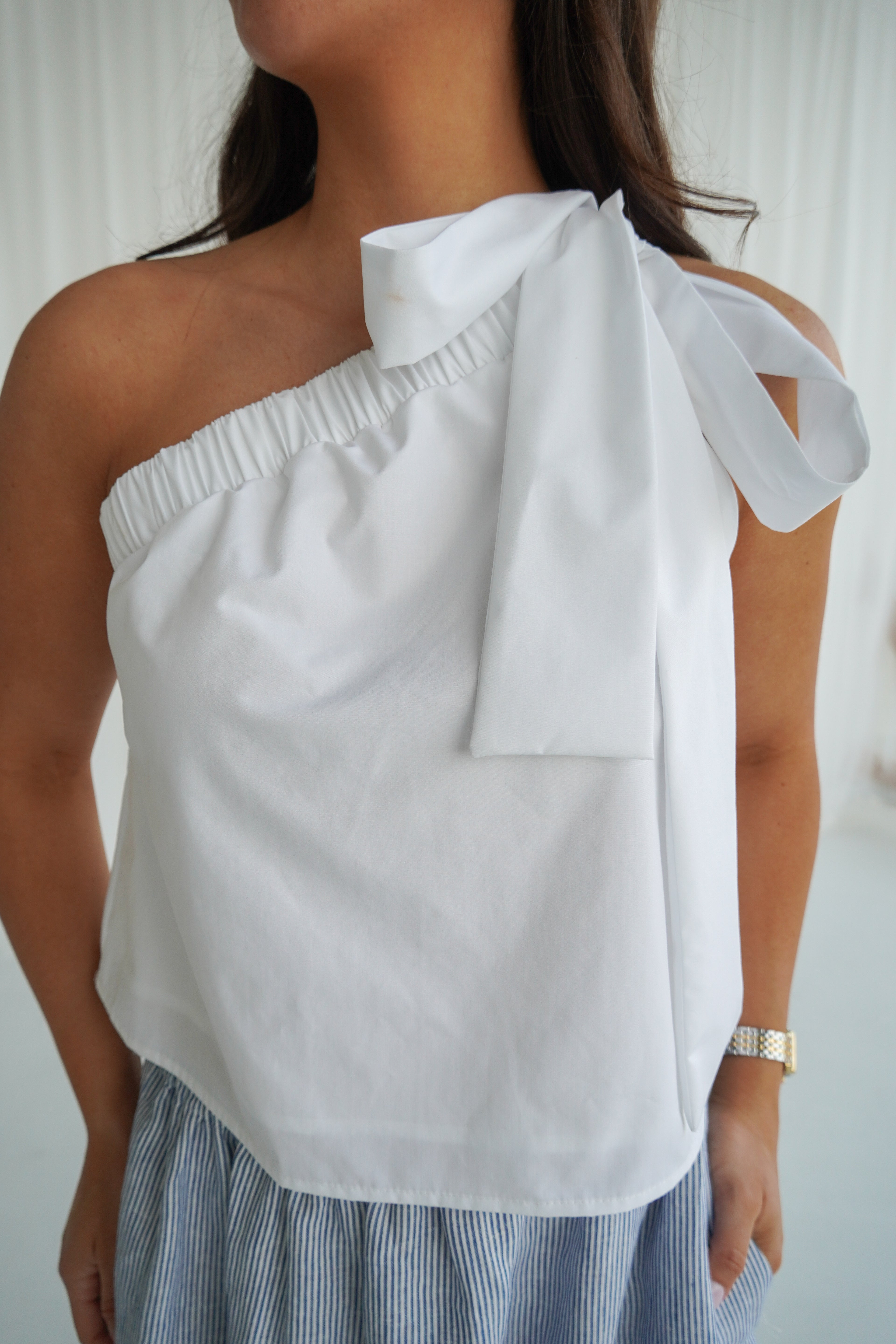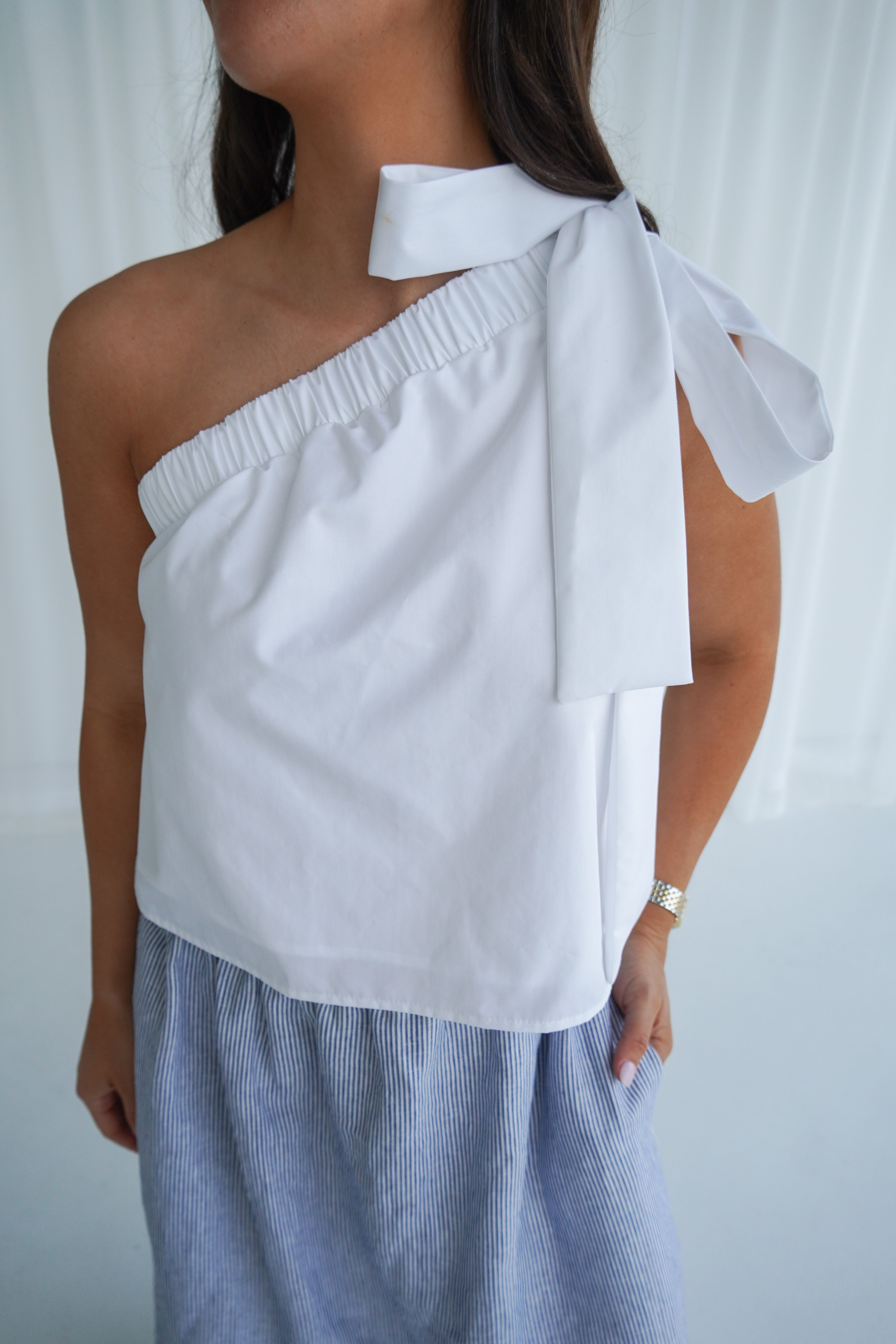 Chic with a touch of romance, this one-shoulder top is the definition of effortless elegance. Designed with a softly gathered neckline and an adjustable shoulder tie, it drapes beautifully for a relaxed yet refined silhouette. The statement bow detail adds a feminine finish, while the breathable fabric keeps it light and comfortable for warm days.
