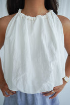 Light, airy, and effortlessly feminine, this top is a warm-weather essential. Designed with a soft halter neckline and delicate rope- like trim, it drapes beautifully for a relaxed, flowy silhouette.