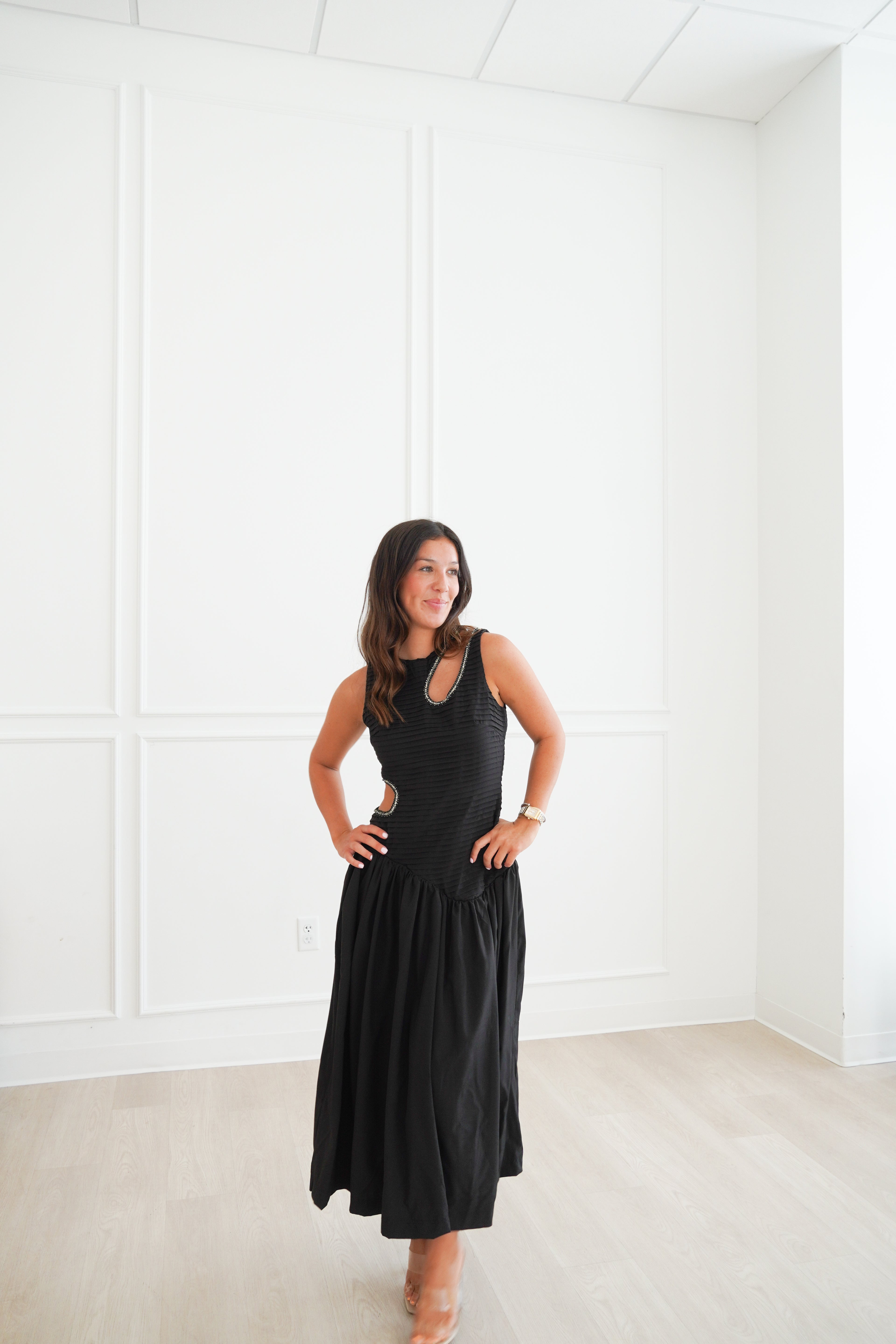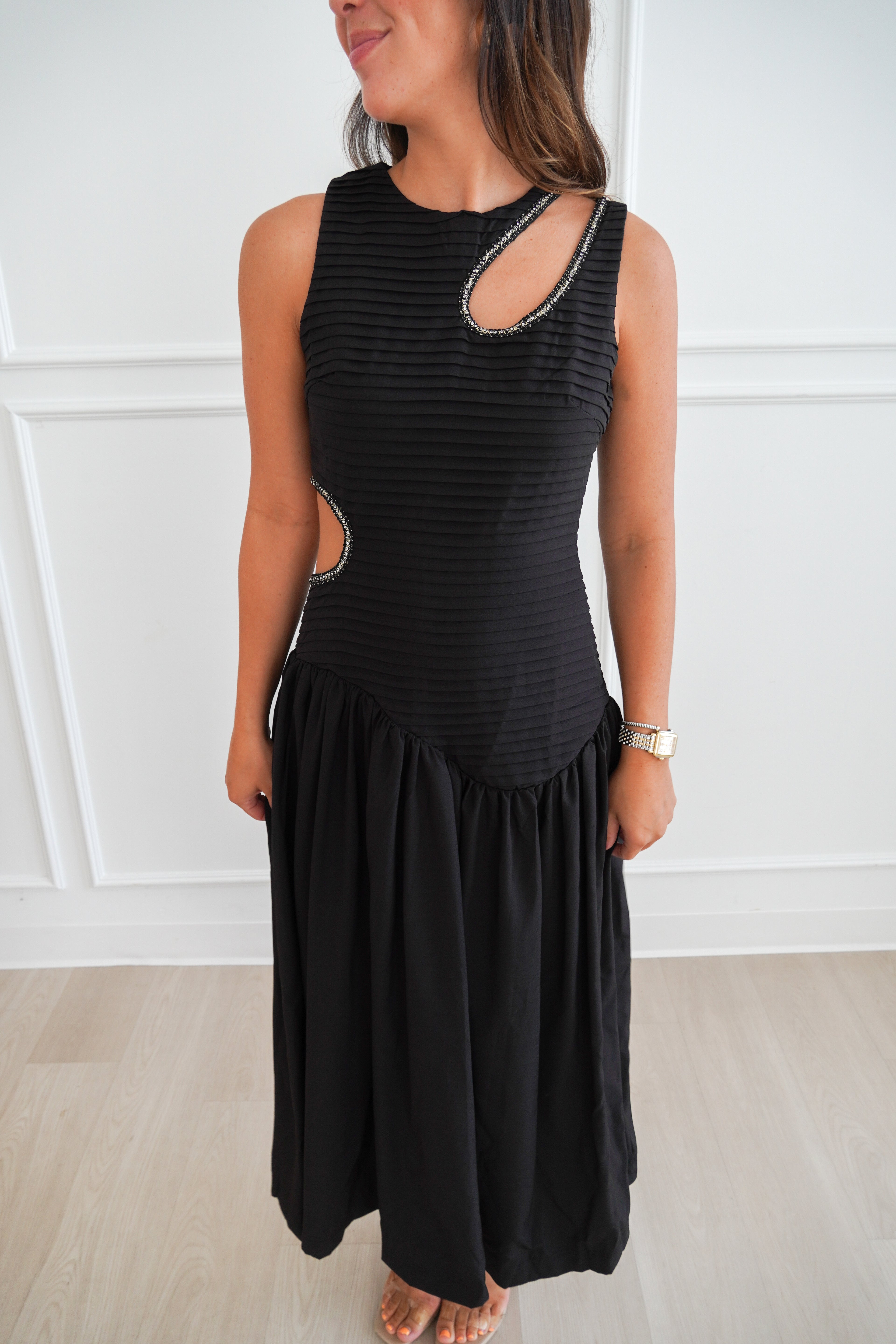 Featuring a drop waist maxi dress that with every detail, from the sleeveless cut to the intricate hollow pleats, is crafted to enhance your style and confidence. This dress is sure to be a head turner at your next event! Luxury and elegance combined!