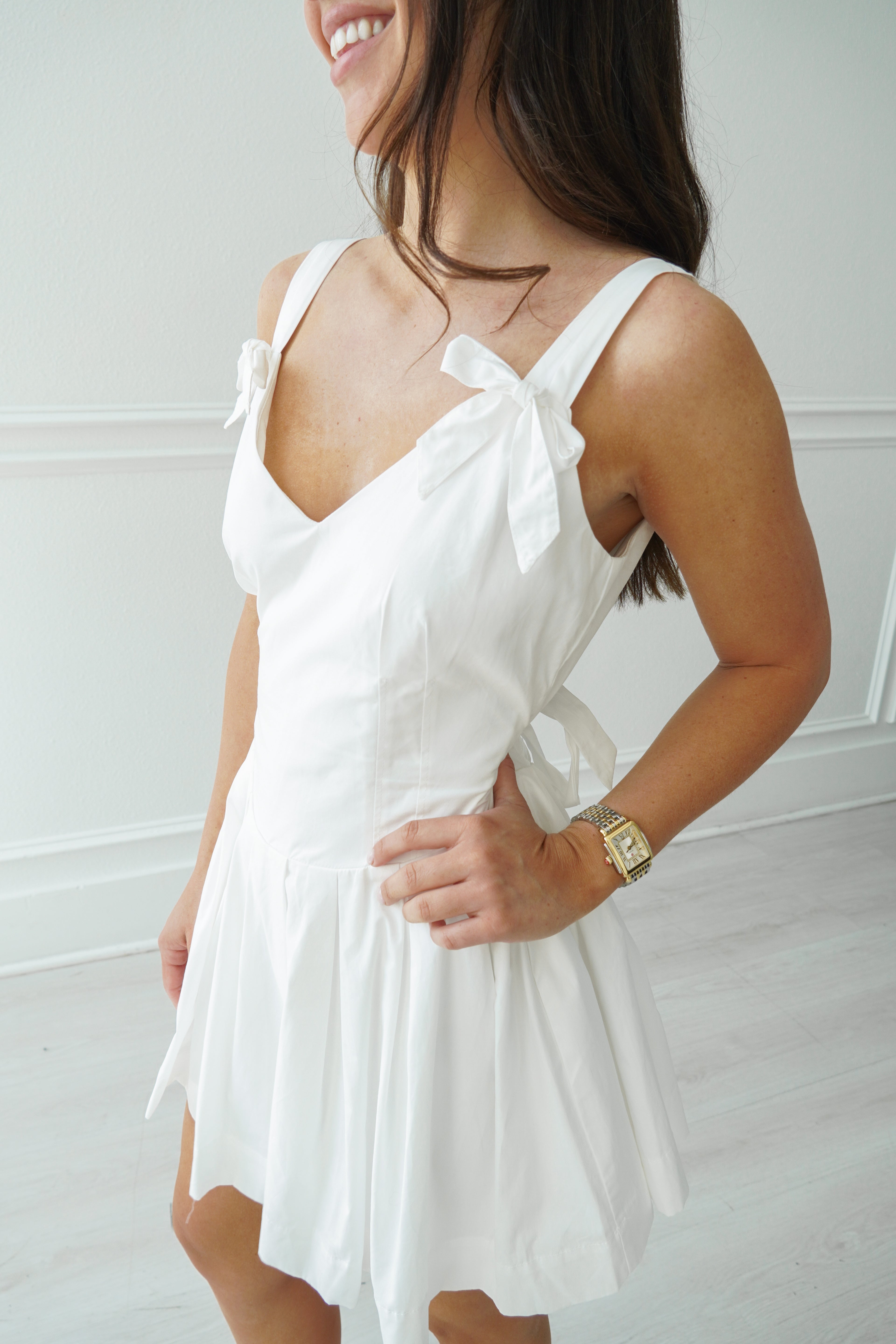 Featuring a v-neckline, bow detailing on the straps, a drop waist and a pleated skirt-- this mini dress is the perfect blend of playful and delicate. So fun and flirty!!