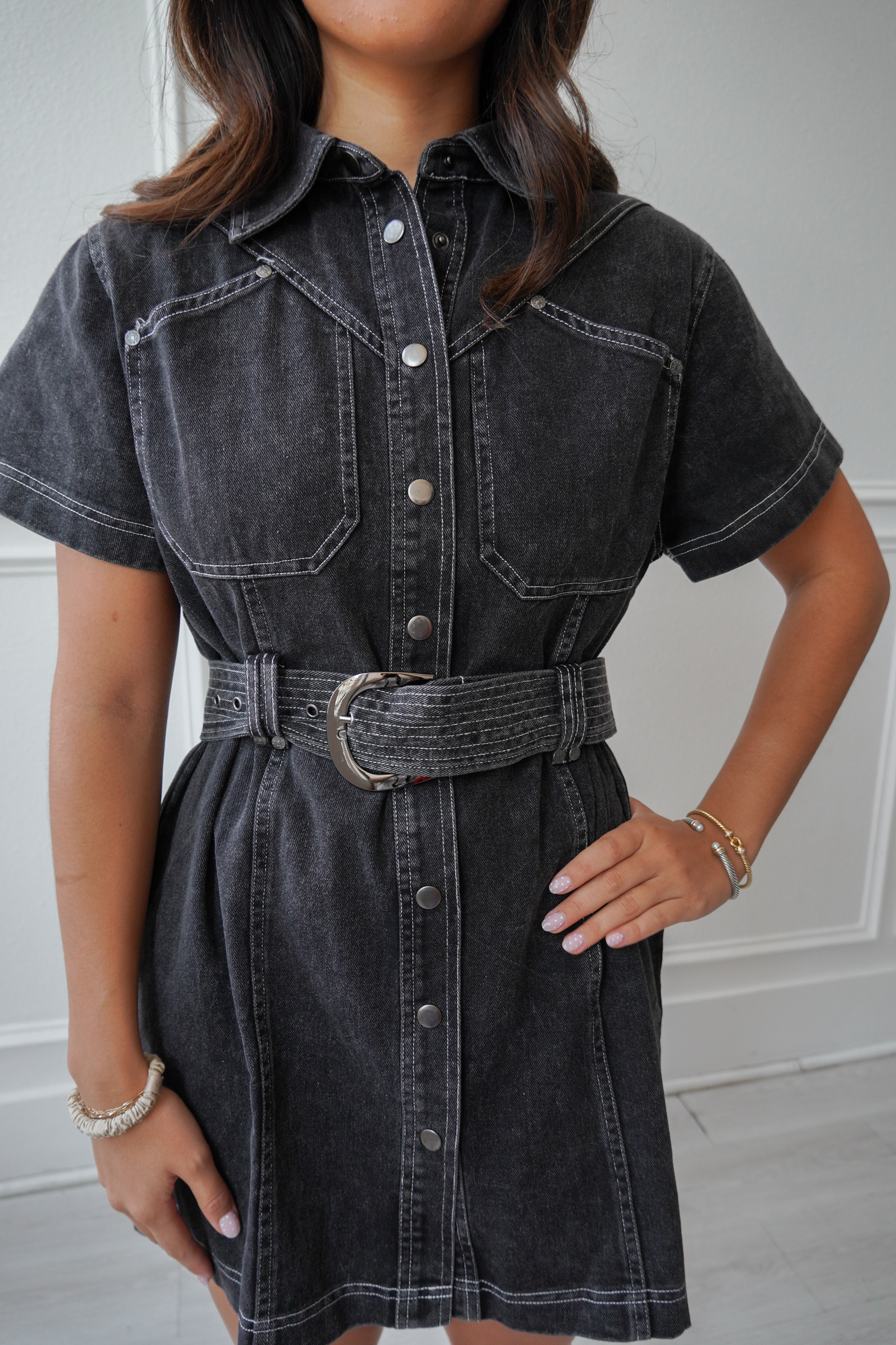 Featuring a black charcoal wash denim, white stitched detailing, & a fun big belt and buckle– this mini dress is perfect for cheering on your favorite team for gamedays! We also love this pick for a country concert, or Fall outing!