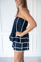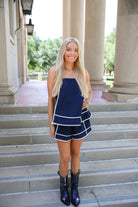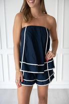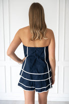 We're loving the white trim on this adorable navy romper! Featuring a strapless neckline, a breathable lightweight cotton fabric and a layered bottom giving the illusion of a set!