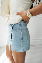 The perfect staple for your closet year around!! We love this asymmetrical skort in a light wash denim!