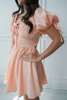 We love all the sweet details on this orange gingham mini dress! Featuring a ruffle neckline, puff sleeves, and an adjustable tie on the front– this dress is a dream!!
