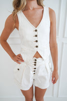 This white denim set is perfect for the neutral gameday!! Featuring a a denim vest paired paired with matching high waisted shorts--this set is adorable and so versatile.