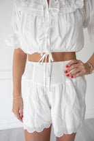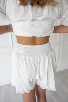 SO many sweet details on this white eyelet set! With puff sleeves & ties on the front– this look is perfect for everything from cheering on your team on gamedays to a fun brunch with the girls!!
