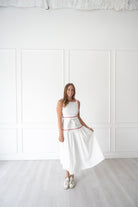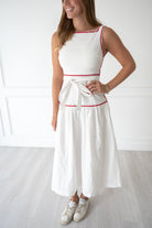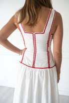 Playful meets classic in this breezy white maxi dress! Detailed with red ric rac stitching, it's the perfect piece for summer days.