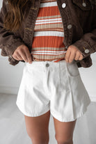 We love the structured, tailored fit of these mid-rise white denim shorts. The vertical seam detailing down the front of each leg adds a polished touch to the casual look. These shorts are perfect for gameday or any fun Summer occasion!