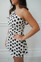 We are in LOVE with this one shoulder polka dot mini dress/ romper! Featuring a drop waist & bubble hem– all this dress needs is your favorite boots & you are gameday ready!