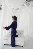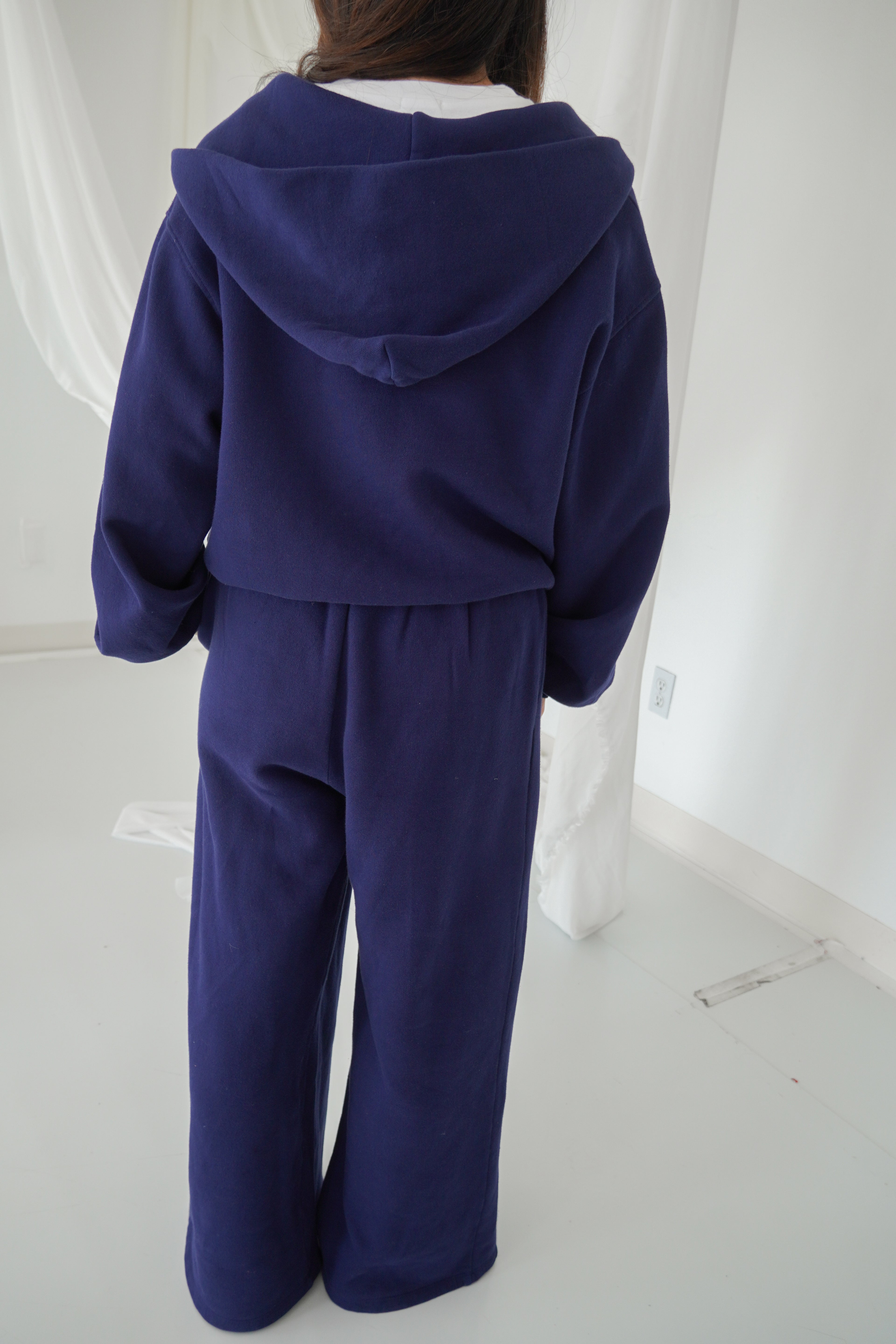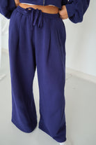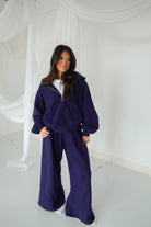 Featuring a navy blue, a zip up cropped jacket and pleated wide leg pants, this set is our go-to for Fall and Winter. So cozy and warm with a fleece lining.