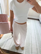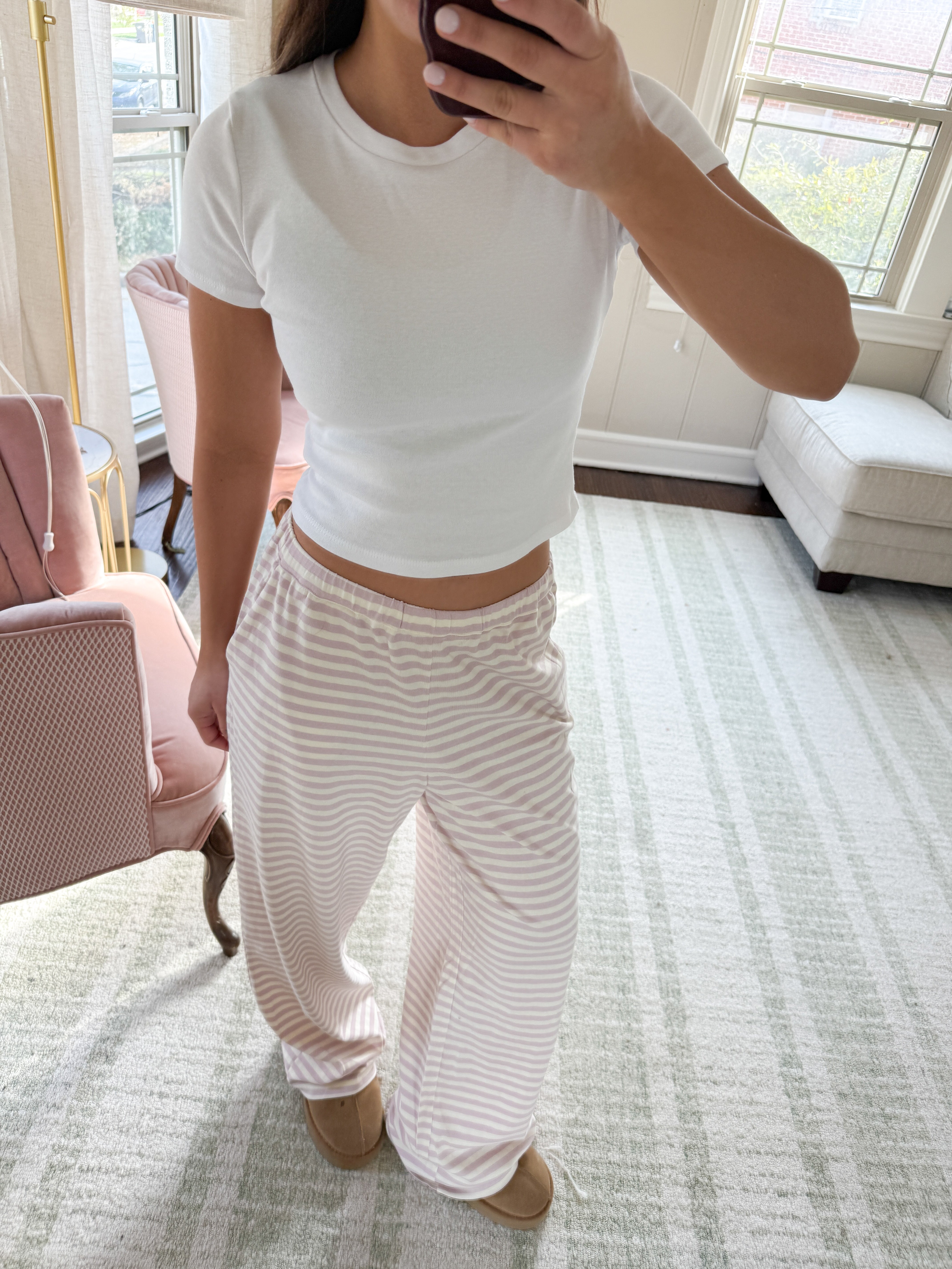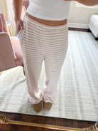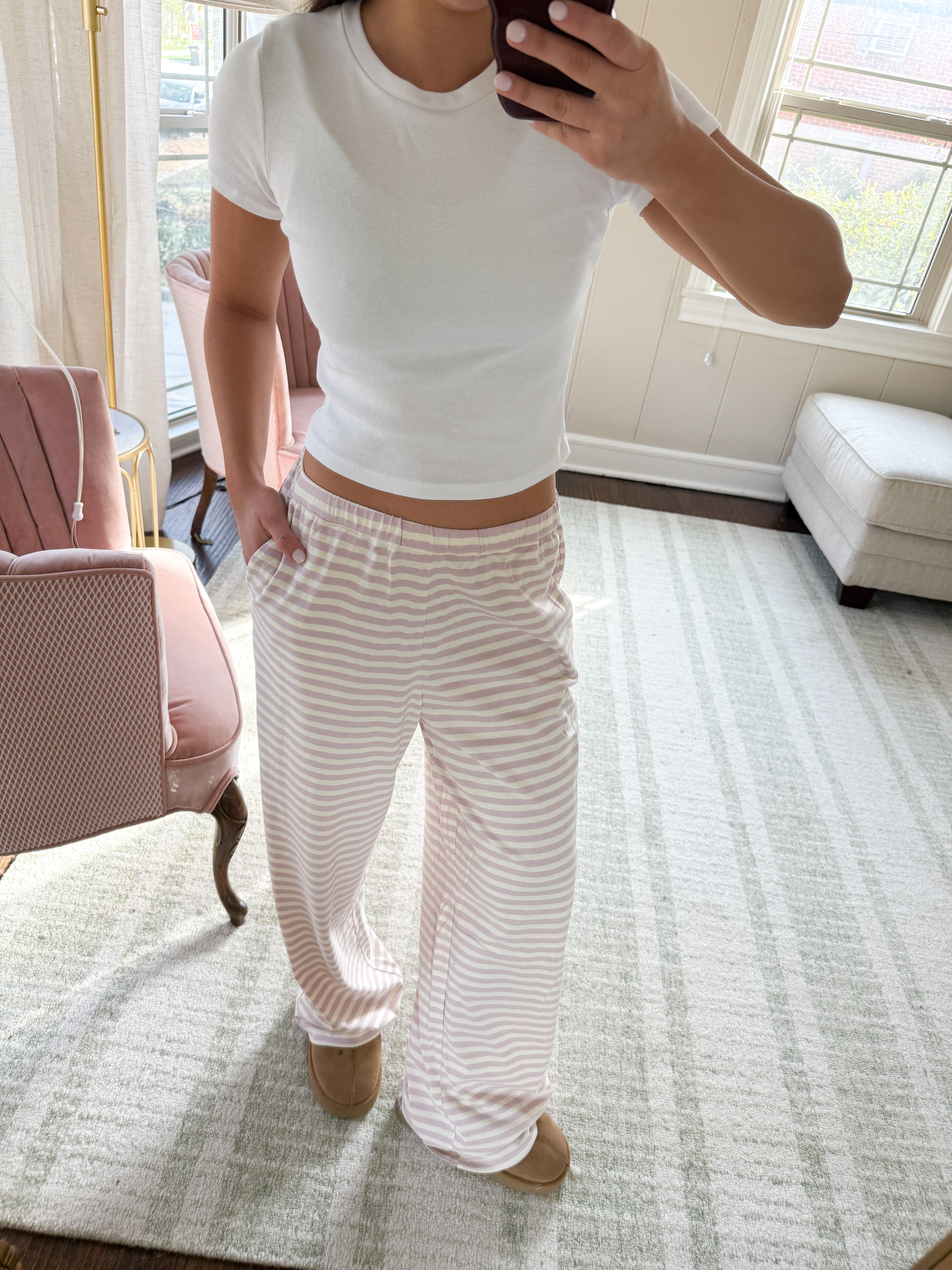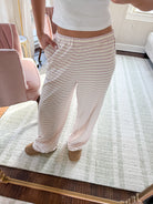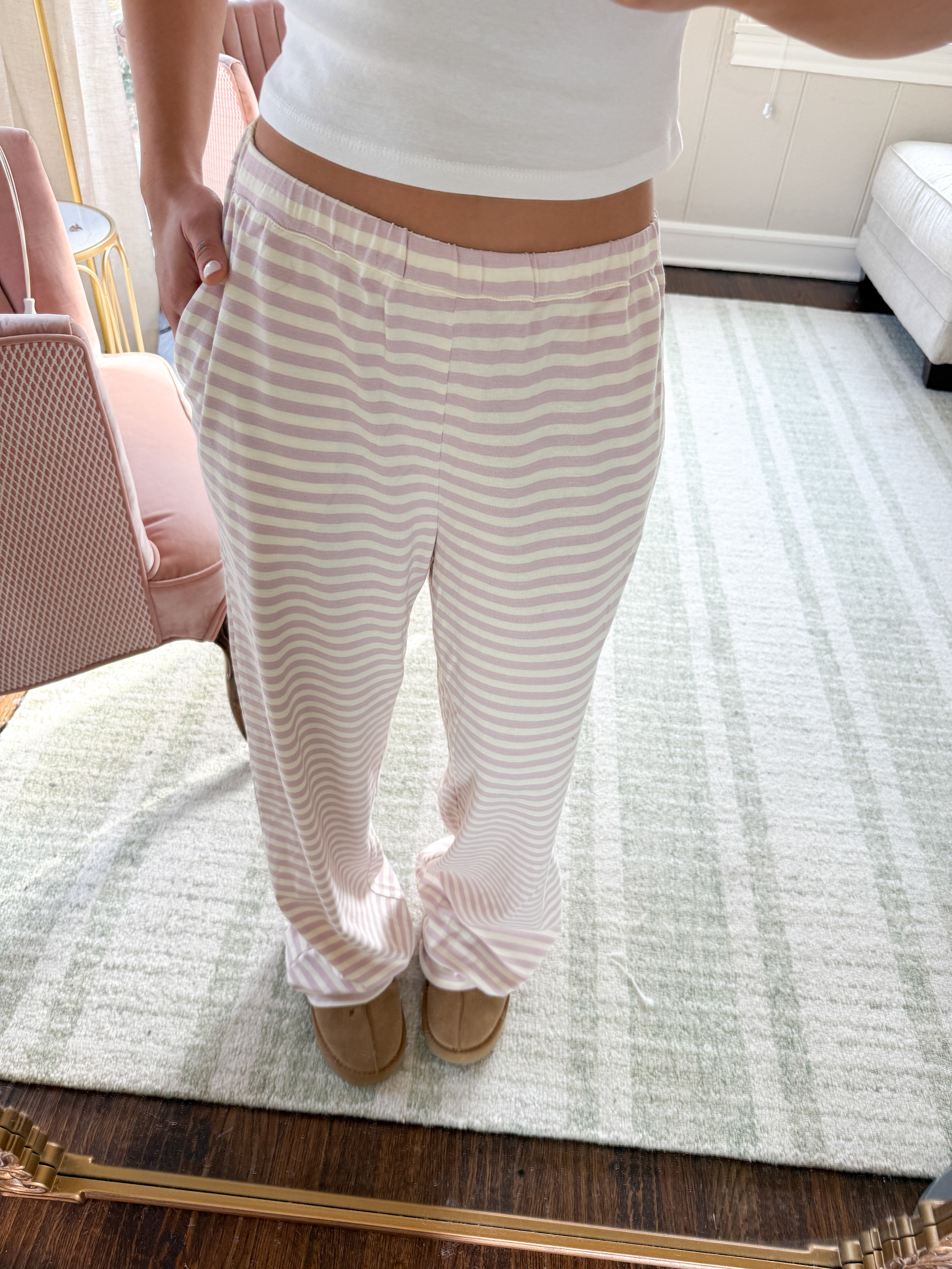 Featuring a subtle pink and ivory stripe, these wide leg pants are so cozy you will never want to take them off! We love the minimal waistband and the relaxed fit. Tall girl approved!