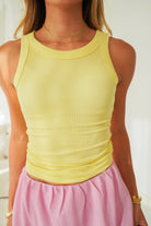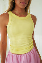 Featuring a vibrant yellow, a scoop high neckline and a soft and stretchy fabric-- this tank is ideal to layer with or pair with your favorite shorts or skirt this season!