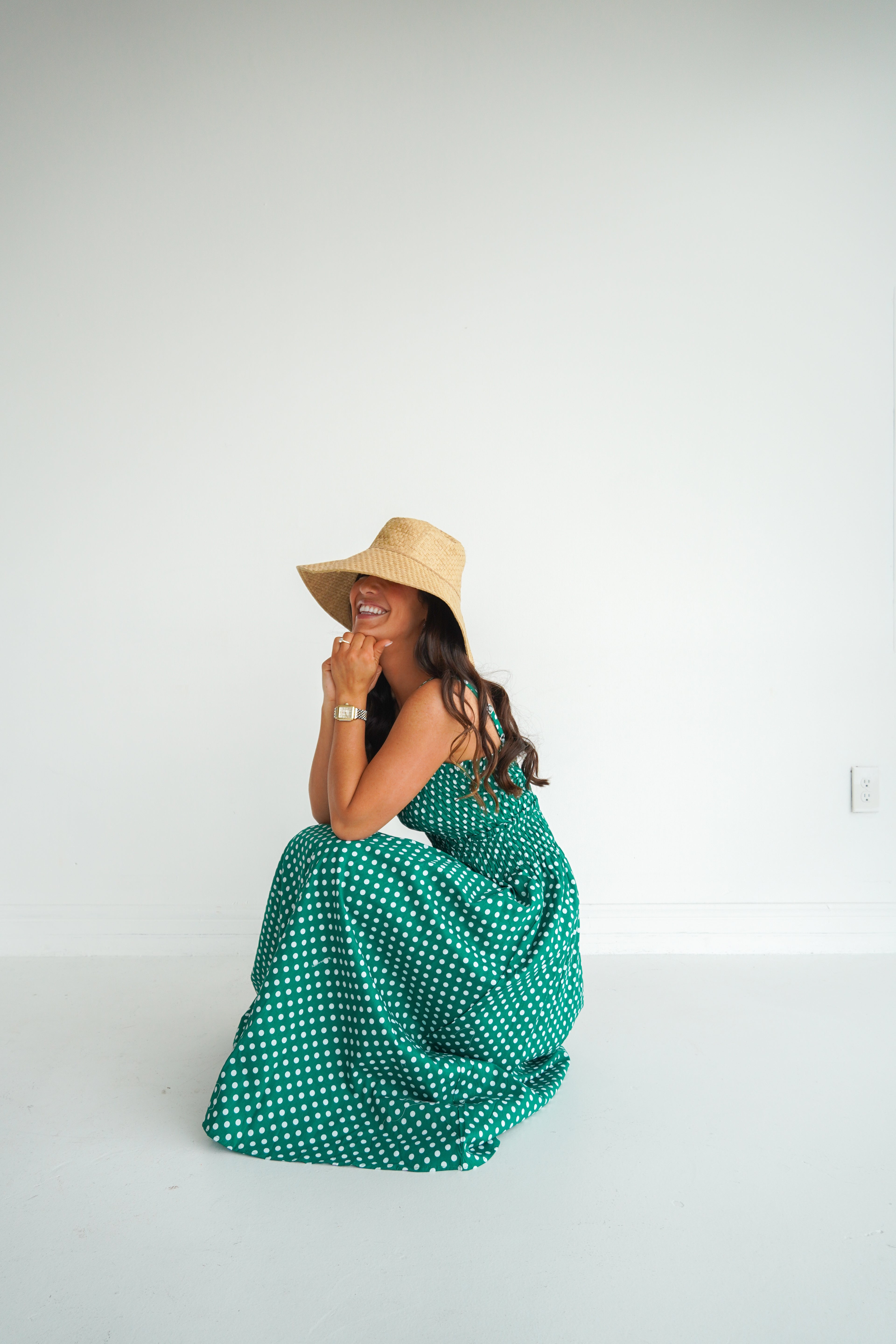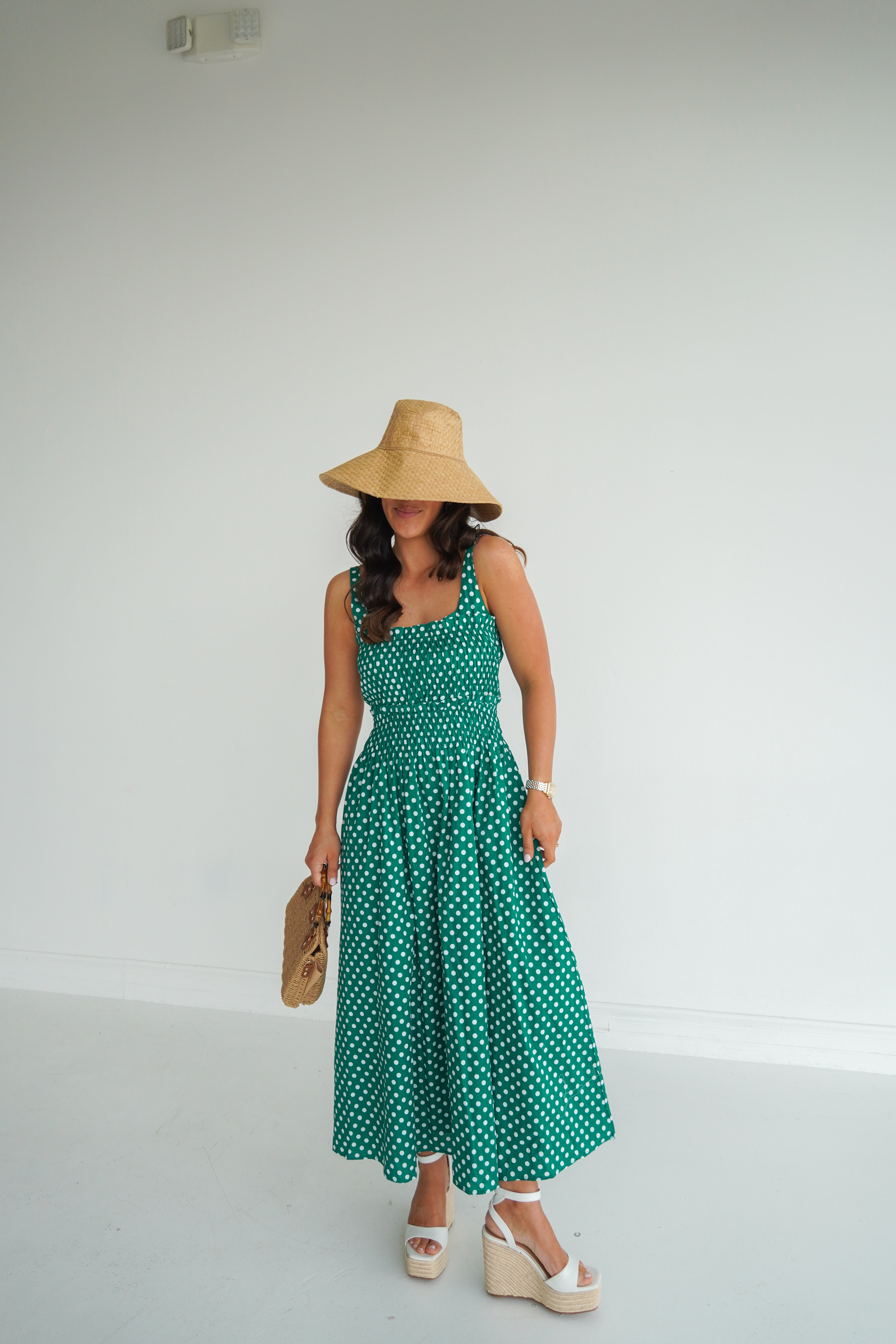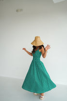Elevate your wardrobe with this charming kelly green and white polka dot maxi dress. Featuring a flattering square neckline and a smocked waist that cinches beautifully, this piece offers both comfort and style. The timeless polka dot pattern and rich green hue make it perfect for casual outings, Masters tournament, or any fun Spring party! A versatile staple that transitions effortlessly from day to night.