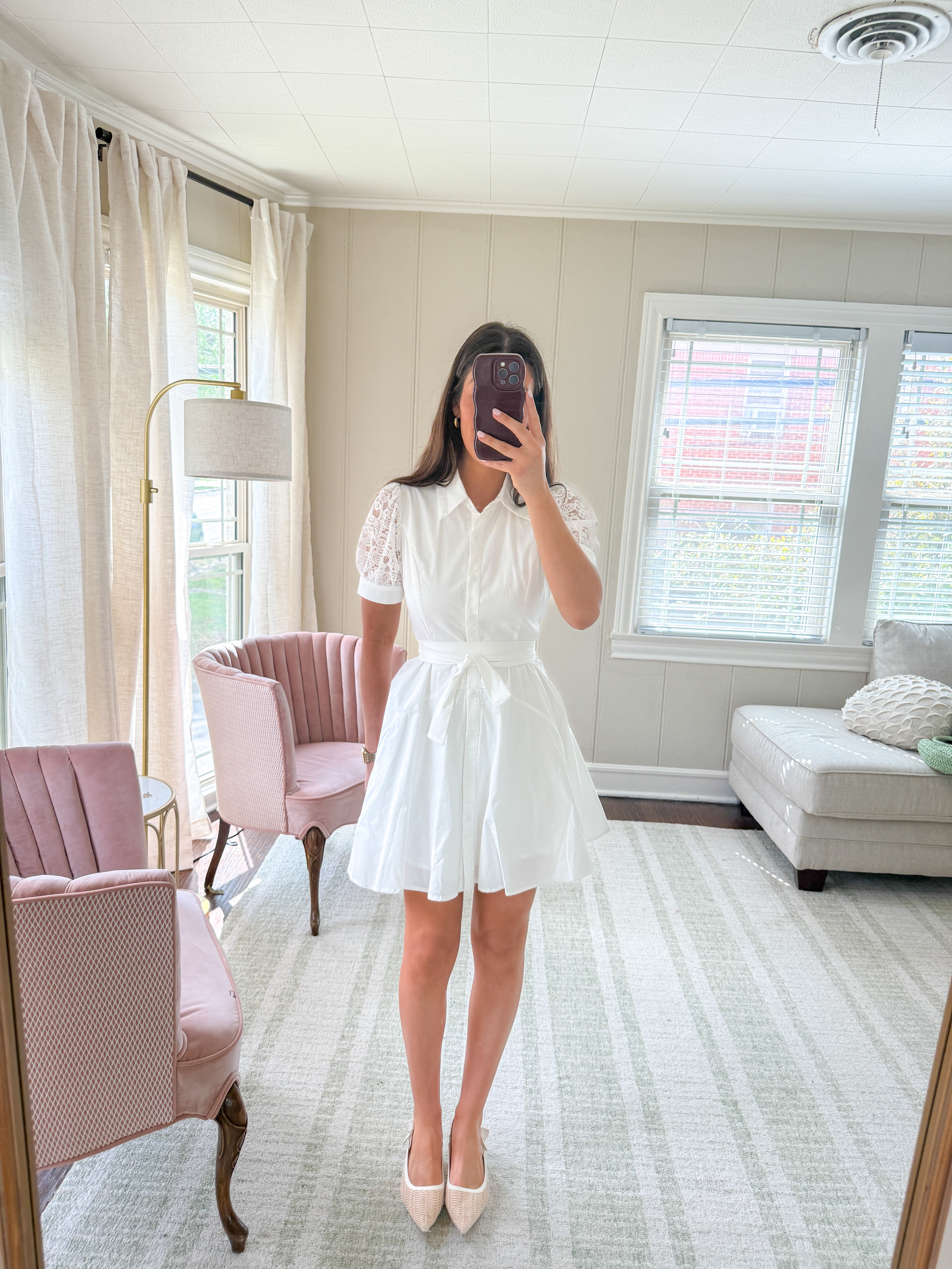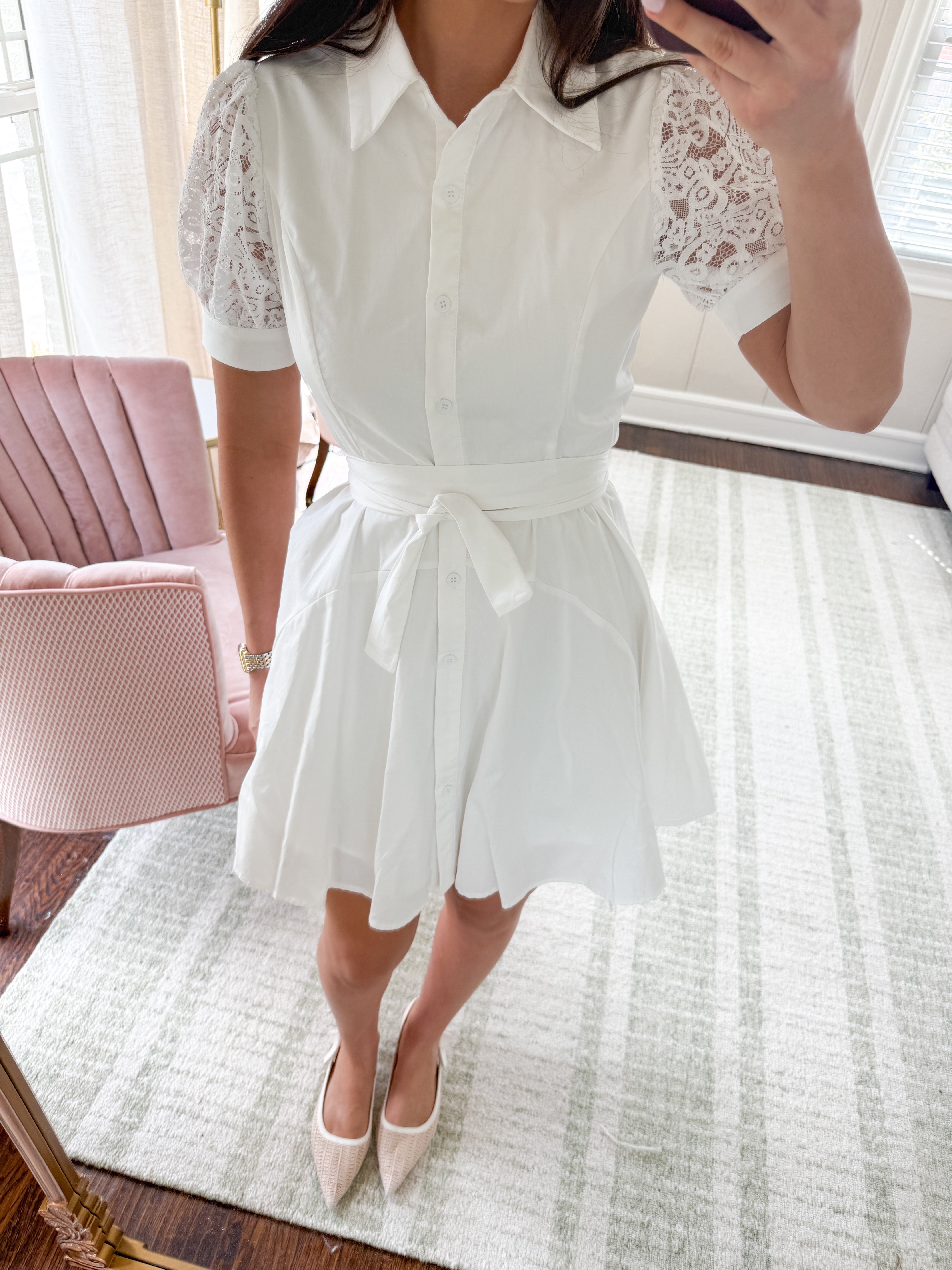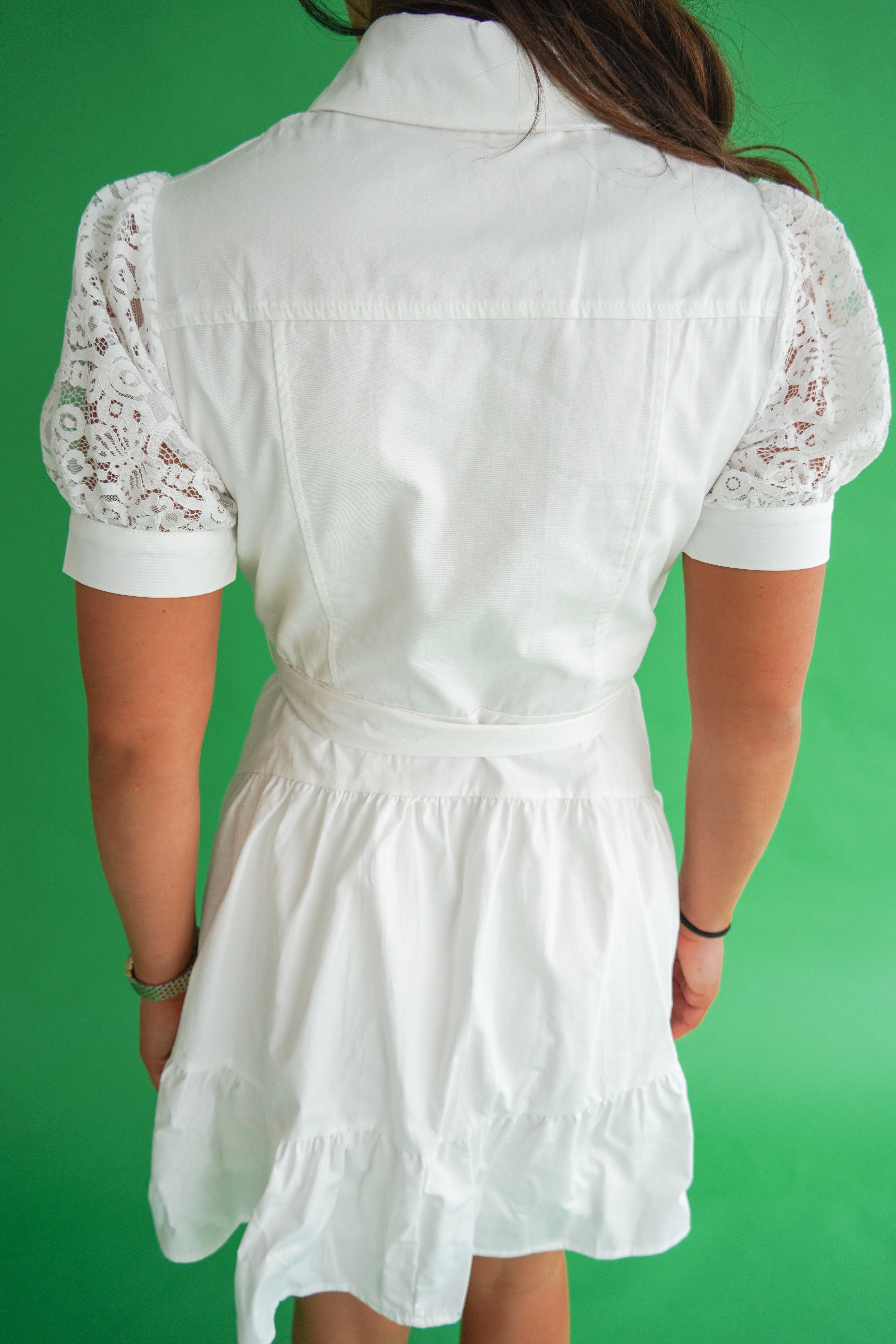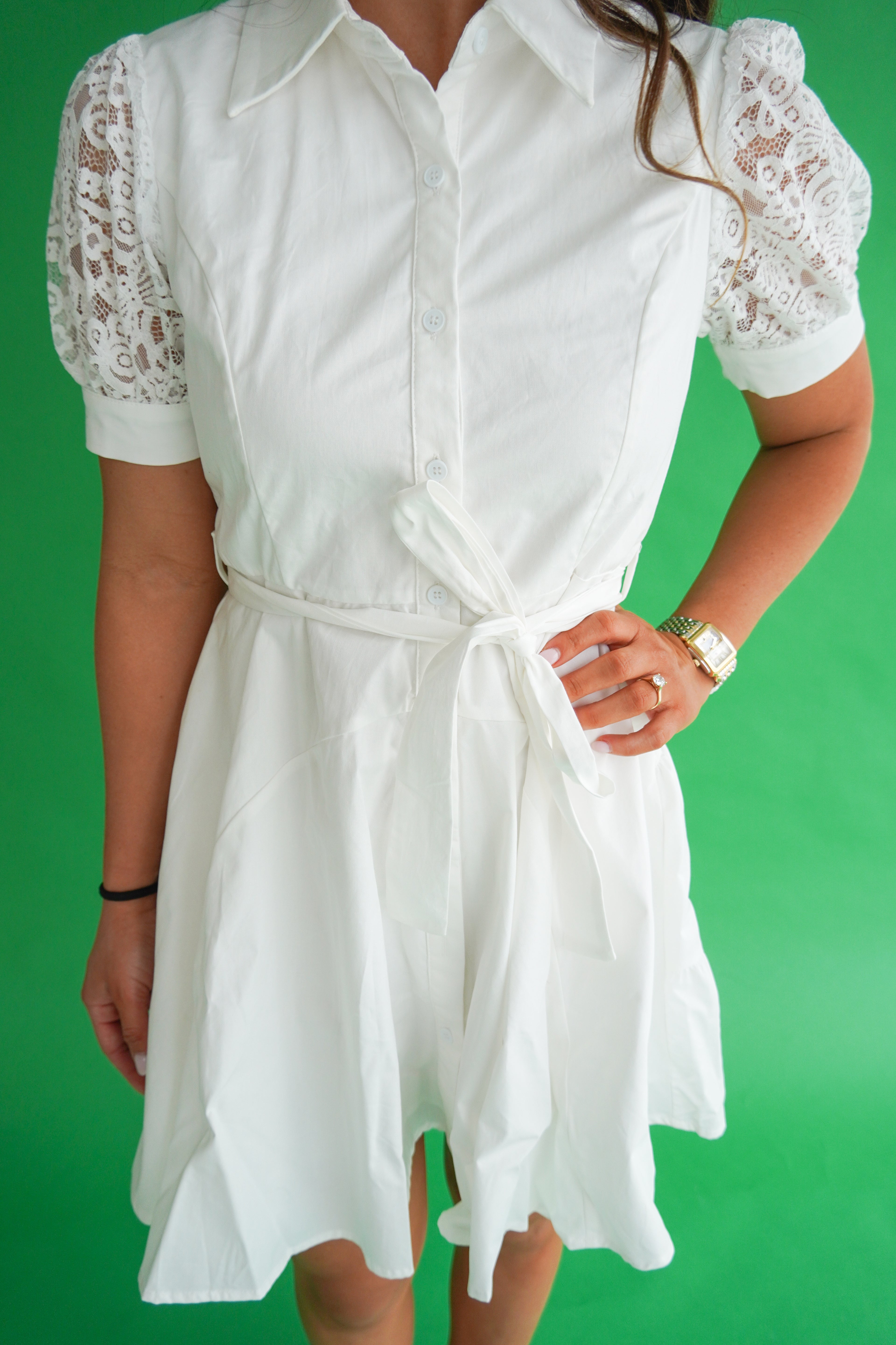 Elevate your everyday style with this classic white mini dress, flattering silhouette with its thoughtfully tailored shape. Delicate lace sleeves add an elegant touch, while the adjustable tie waist lets you customize the fit to perfection. Versatile enough for casual outings or dressed up for special occasions, this timeless piece is a wardrobe essential that works season after season.