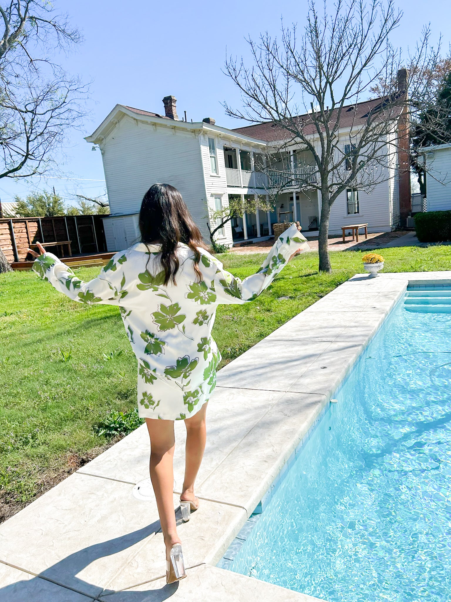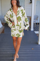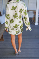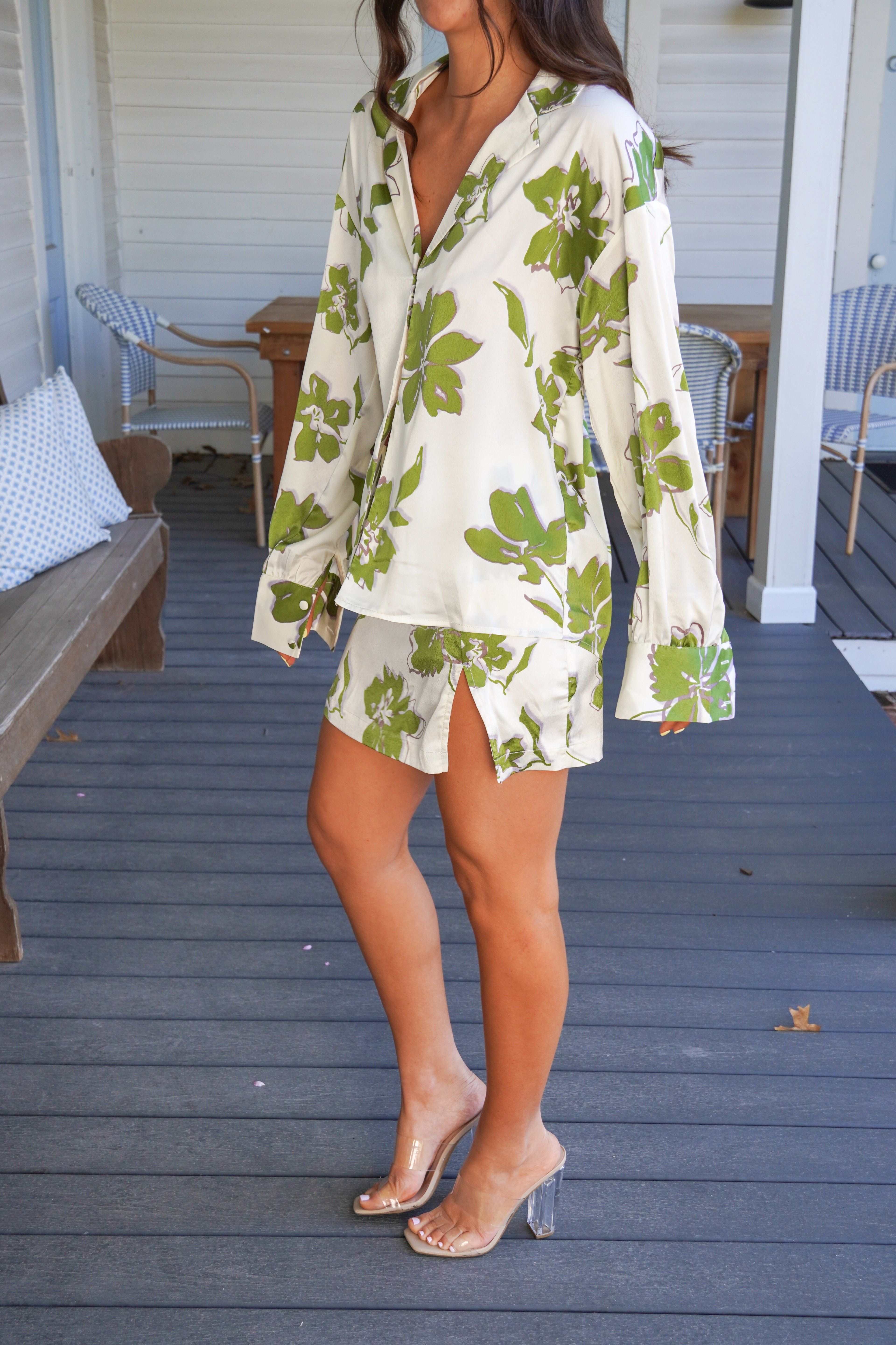 - Featuring a cream and green big floral print, this fun satin set is perfect for your next tropical beach vacation or your Summer uniform!