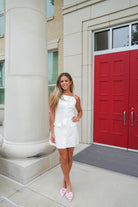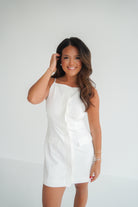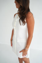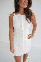 Crisp, clean, and cool– this white mini dress is your go-to for an elevated look. Featuring pocket details on front, and a flattering and subtle silhouette-- it's the perfect blend of preppy and minimalistic charm.