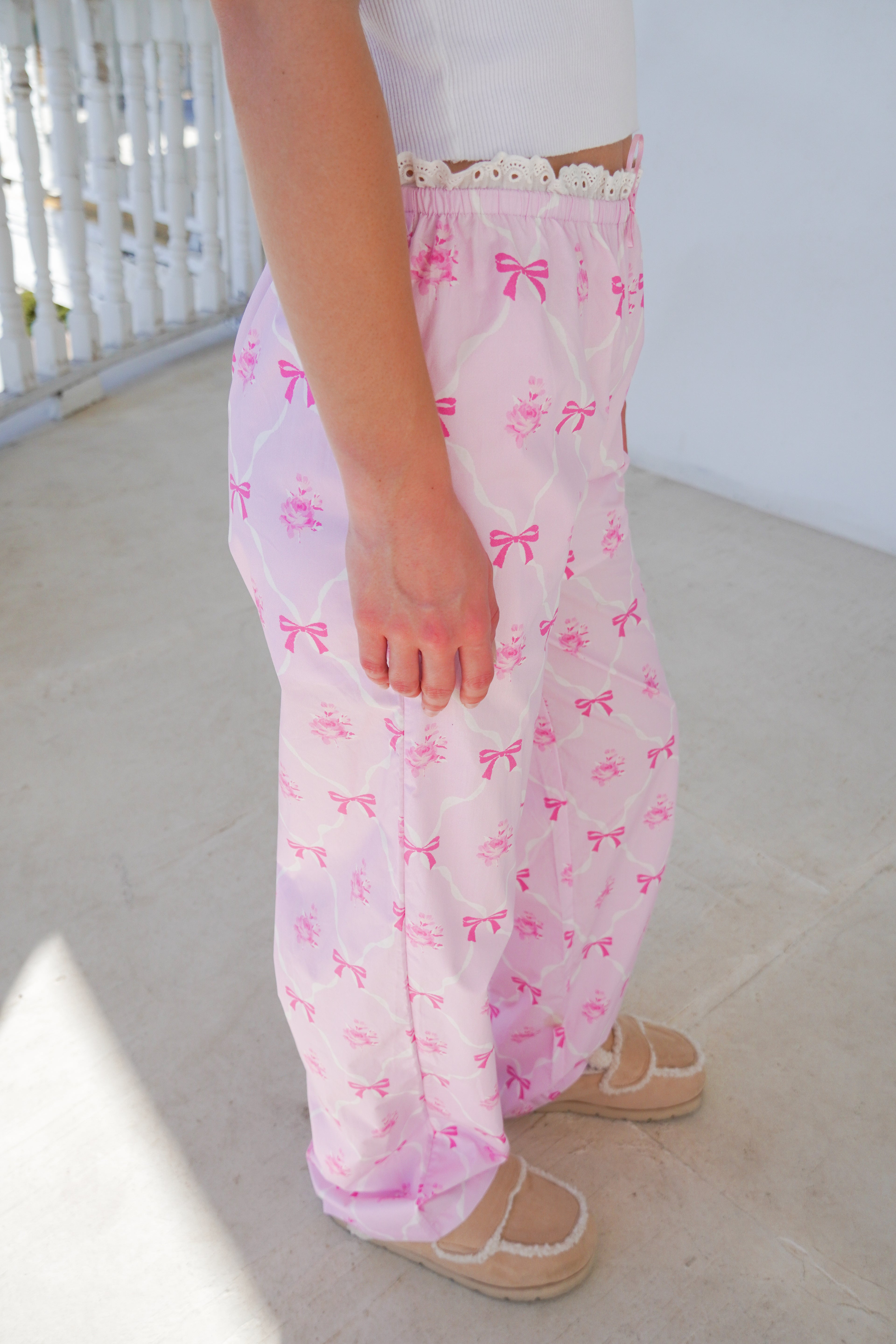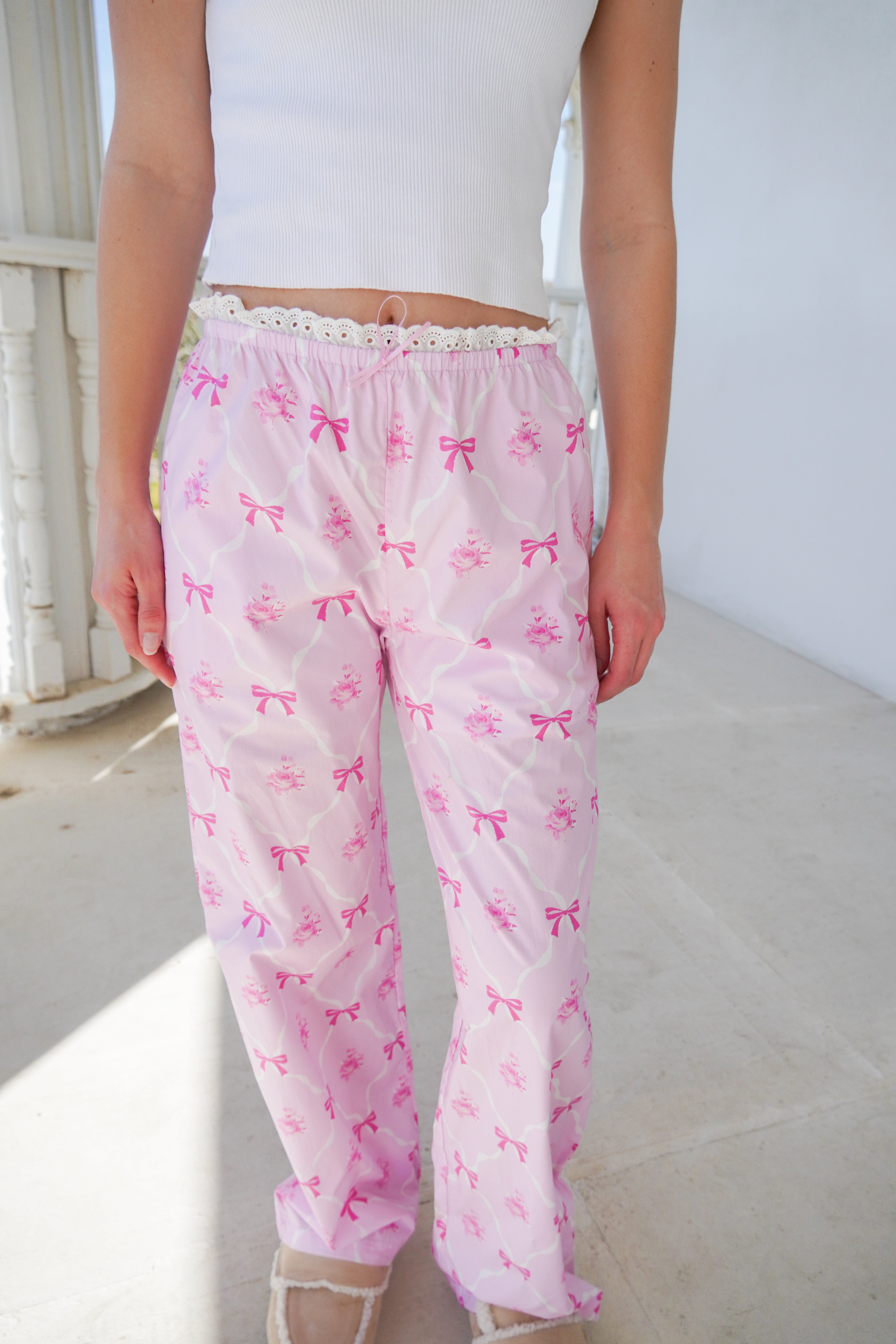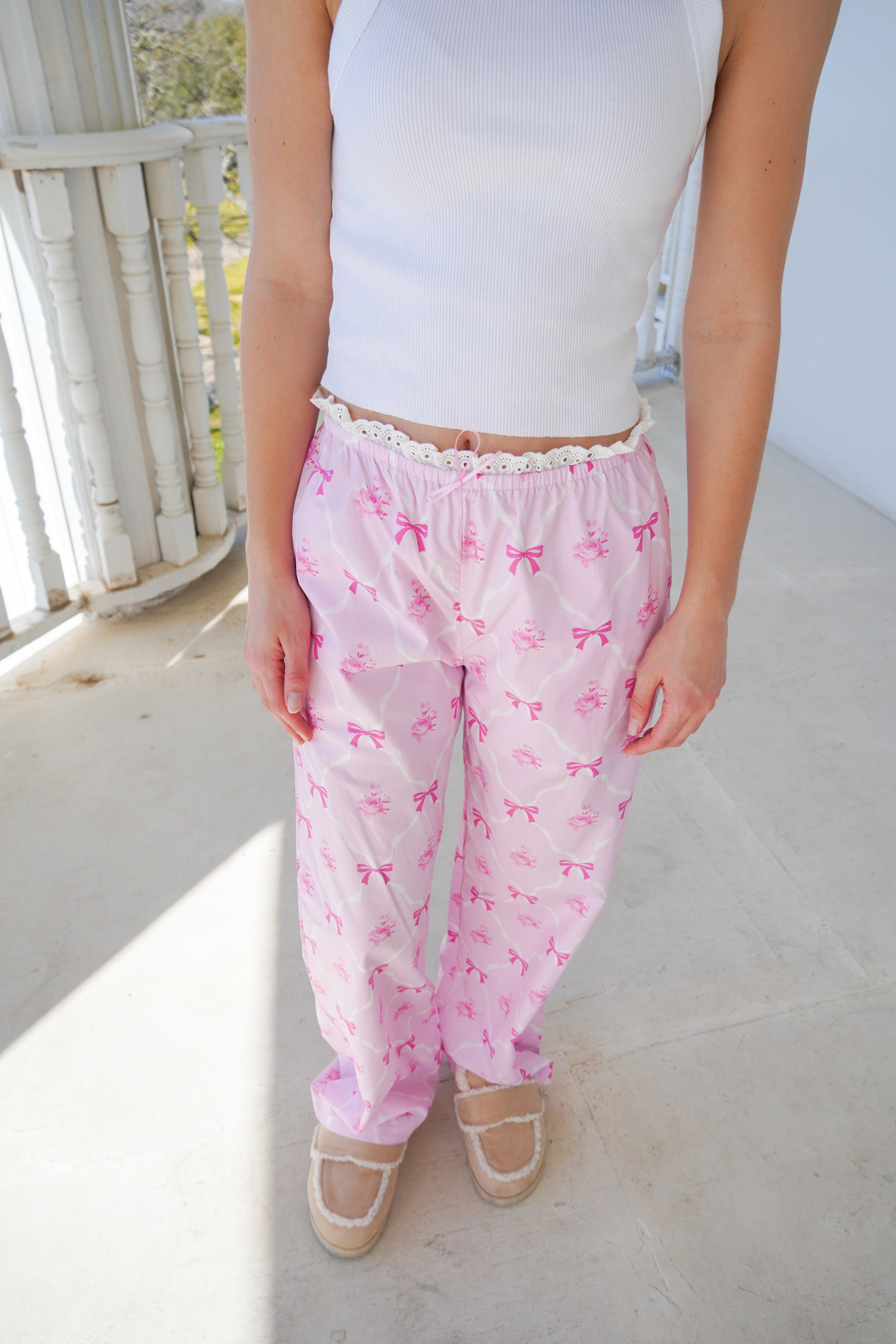 Featuring the cutest pink and white floral print with a lace trim at the waist, these boxer pants are a light cotton perfect for Spring and Summer lounging-- but make it elevated and girly! We are in love!