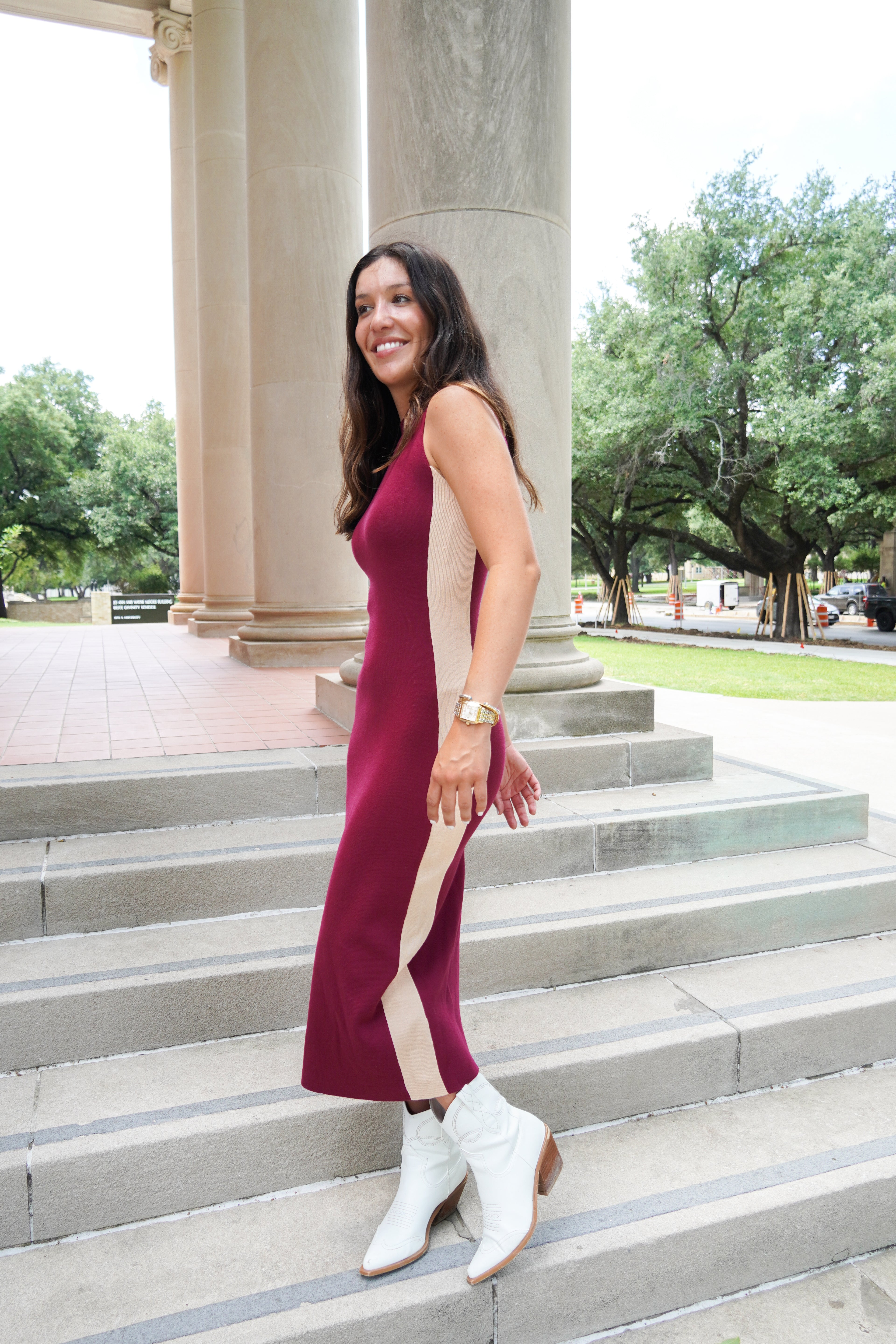 With a mock neck and tan stripes along the sides, this maroon midi dress is perfect for our TXST girls and Aggies! We love styling it with booties for gameday or sneakers to dress it down!