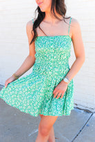 - Featuring a small floral pattern throughout, this kelly green sundress is the dress getting us through the summer! Perfect to throw on and pair with sneakers or sandals for the warmer summer days.