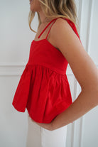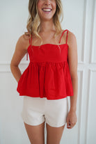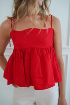 Your new favorite basic in your closet!!!! Featuring a scalloped neckline, bow tied straps, and a flowy hem making it flattering for everyone! The perfect basic with a fun red POP OF COLOR!