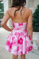 Featuring a halter neckline, drop waist, open back, bubble hem, and gorgeous brocade fabric, this mini dress is so fun and flirty for your next party!!