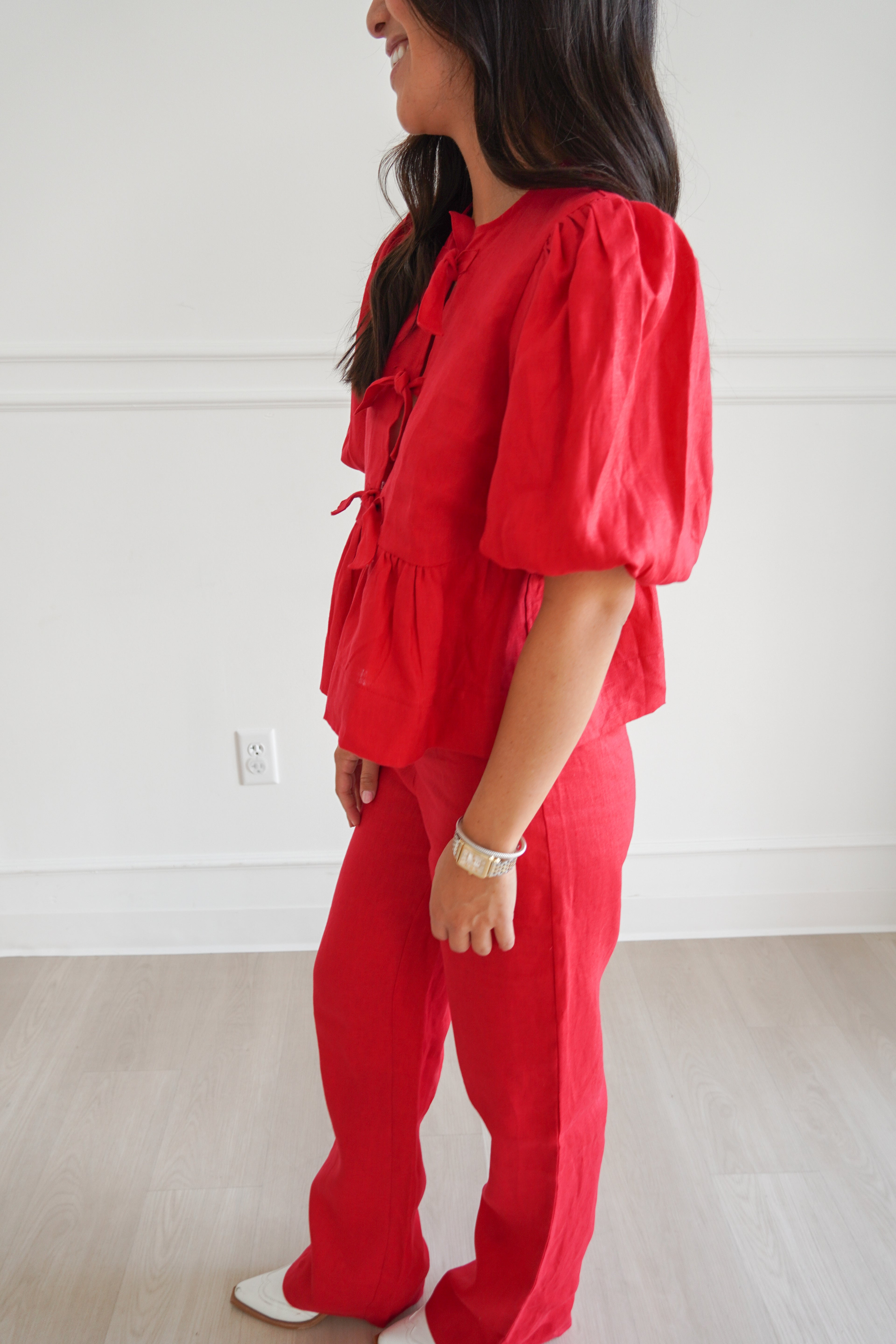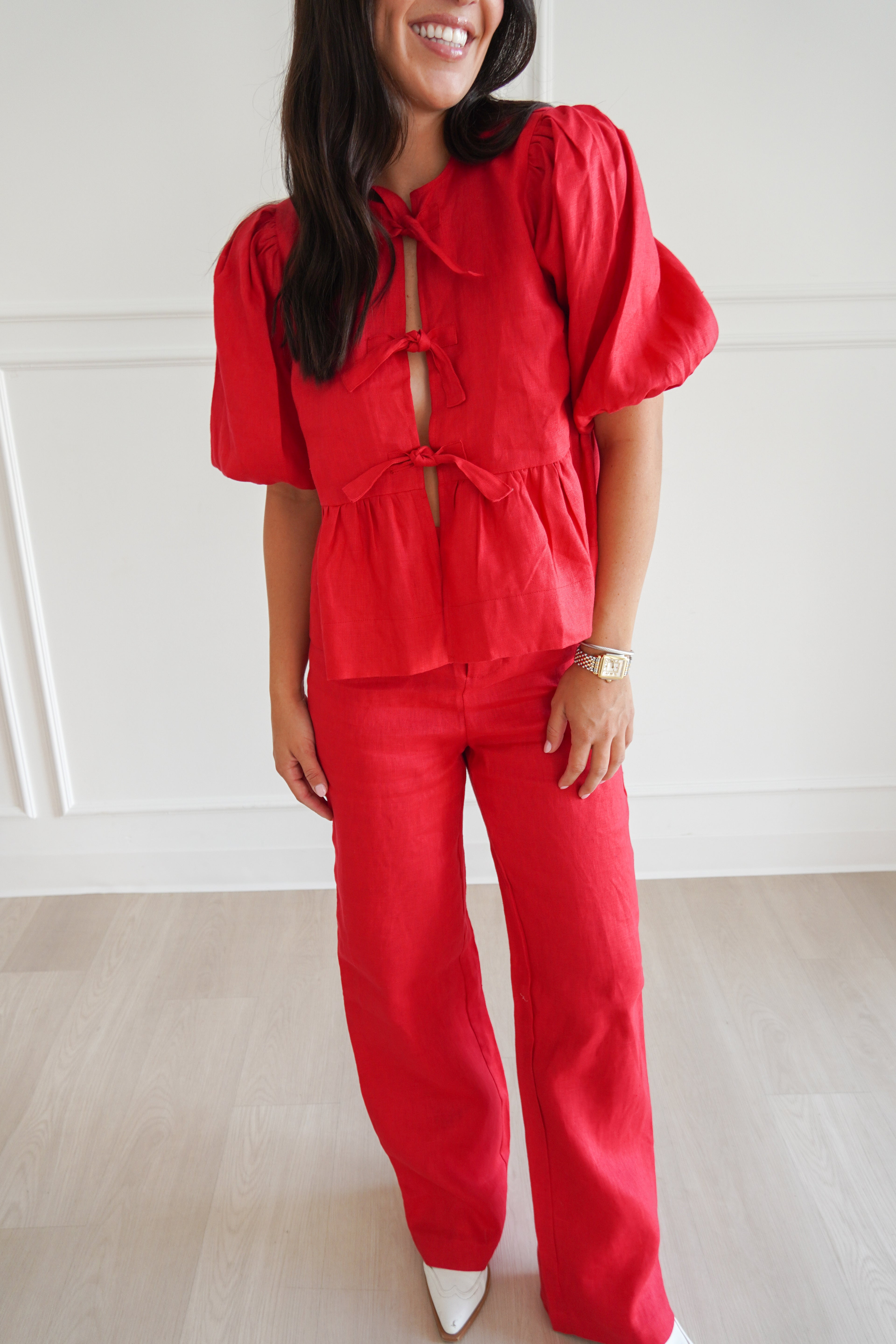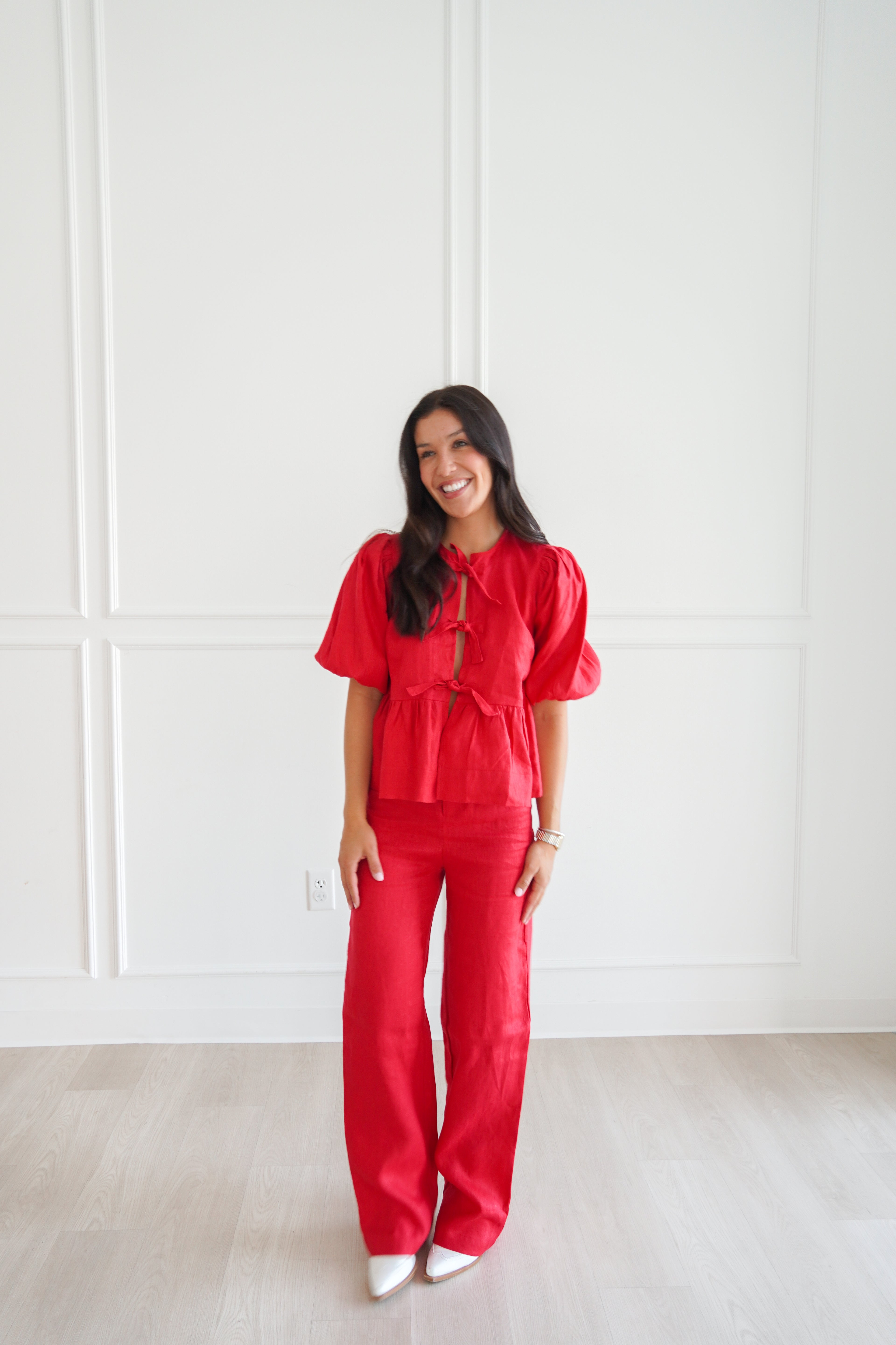Featuring the cutest top with ties along the front and puff sleeves-- the matching straight leg pants make this set to die for!! We are obsessed with this bold and fun set for all year long!