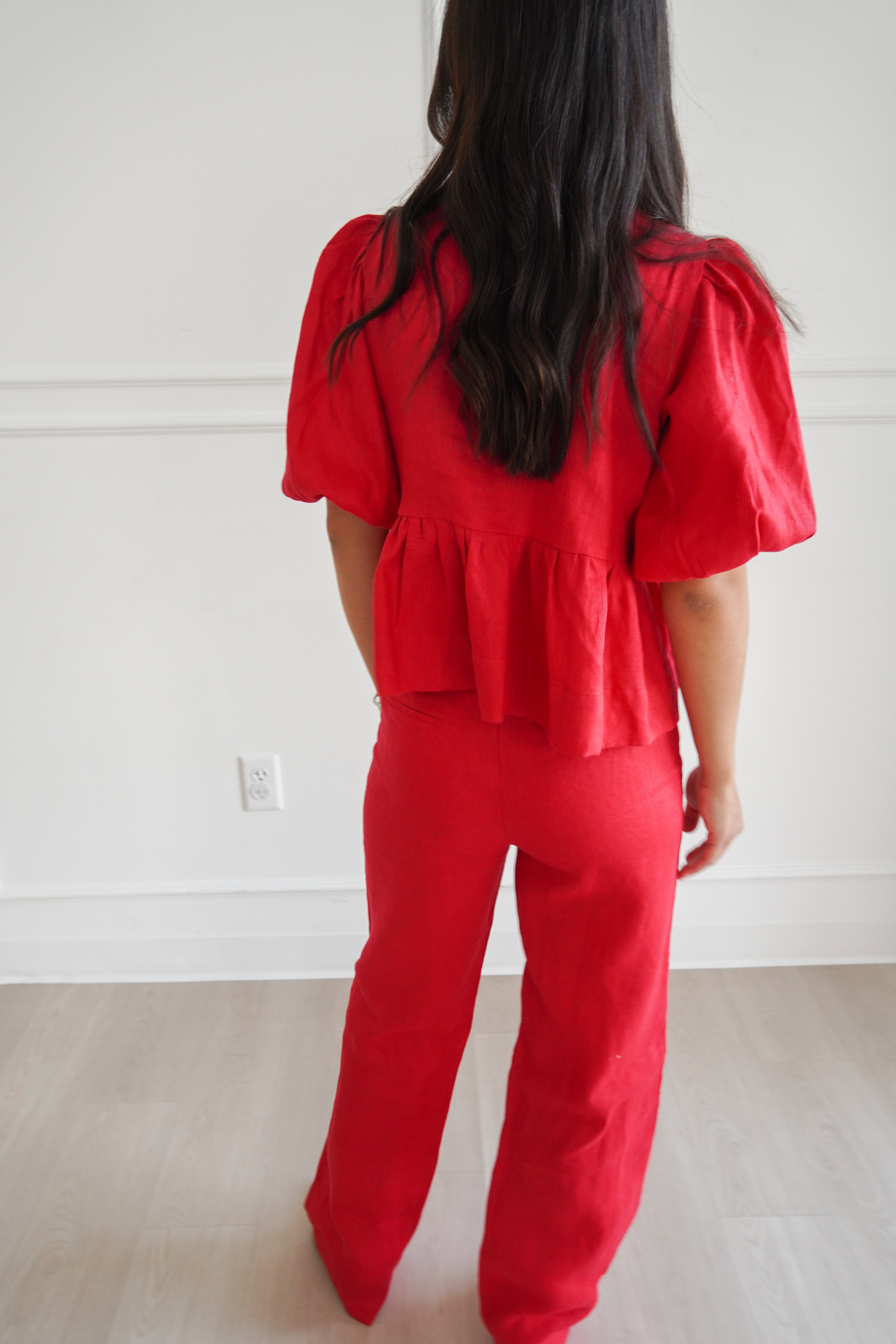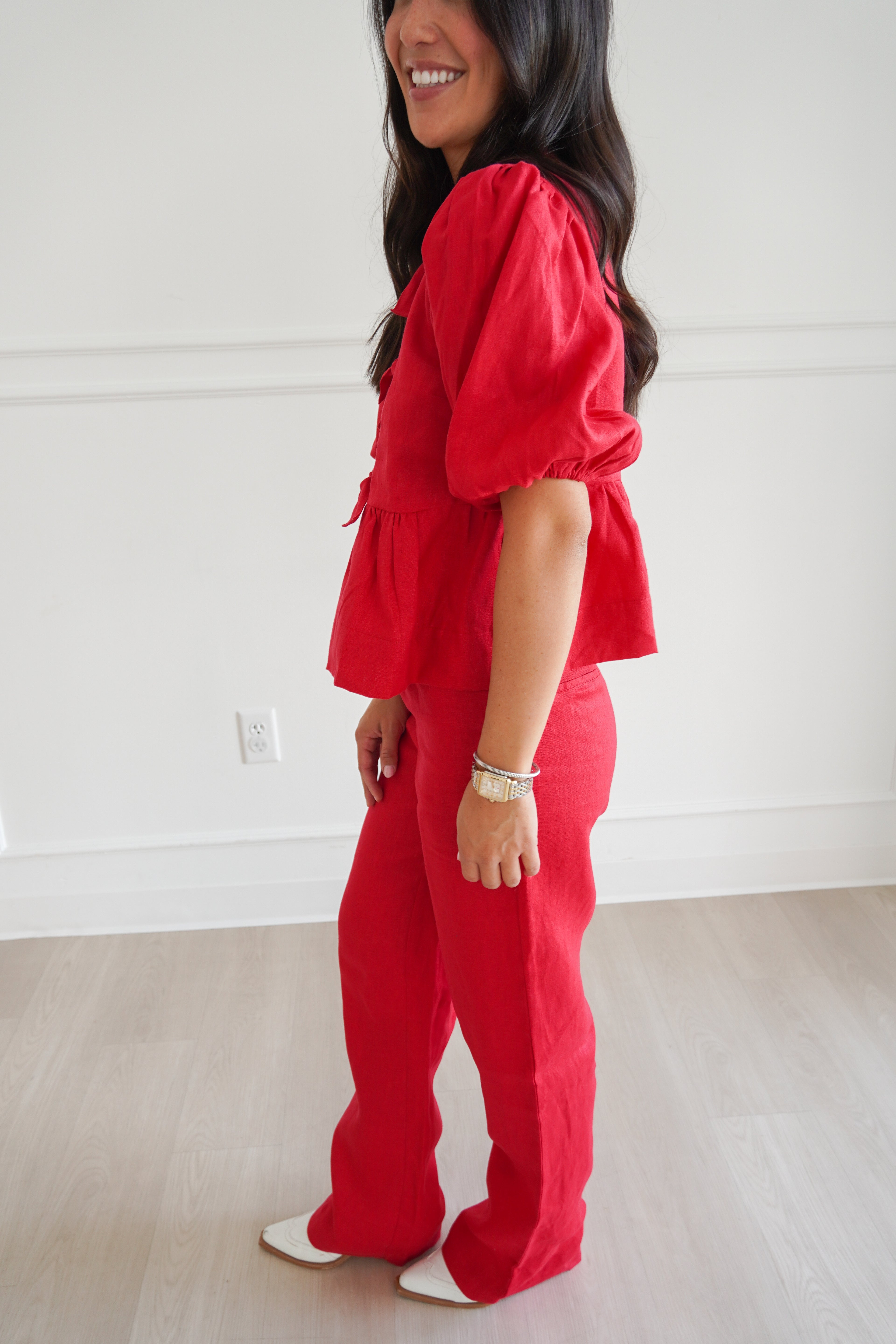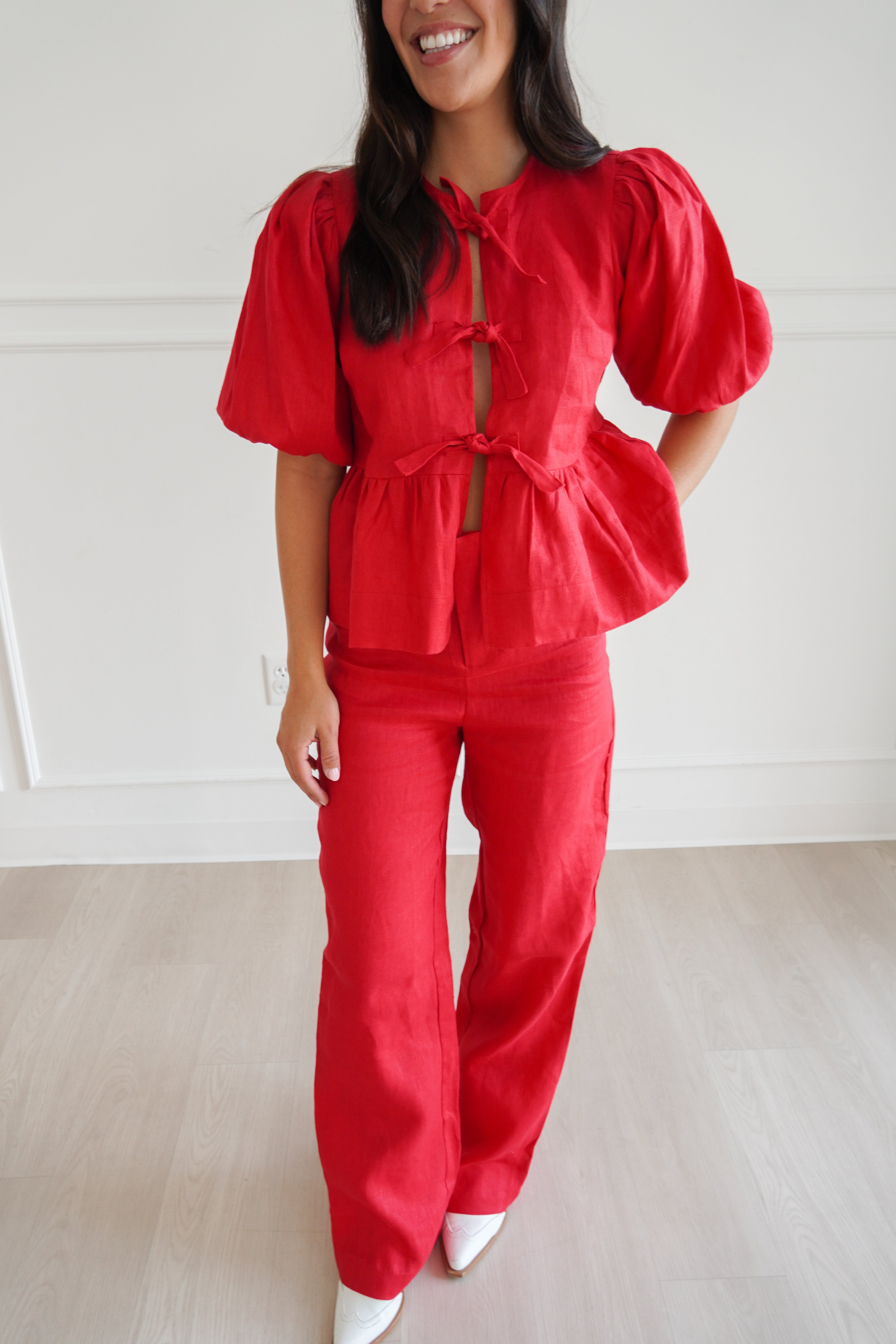 Featuring the cutest top with ties along the front and puff sleeves-- the matching straight leg pants make this set to die for!! We are obsessed with this bold and fun set for all year long!