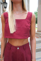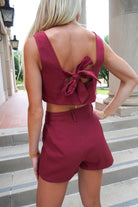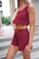 We are obsessed with this maroon set for your next gameday our country concert!!! Featuring a cropped square neck top paired with high waisted white denim shorts!!