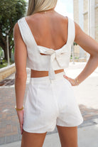 Featuring a square neckline cropped top paired with high waisted white denim shorts-- this set is a perfect neutral for all gameday!
