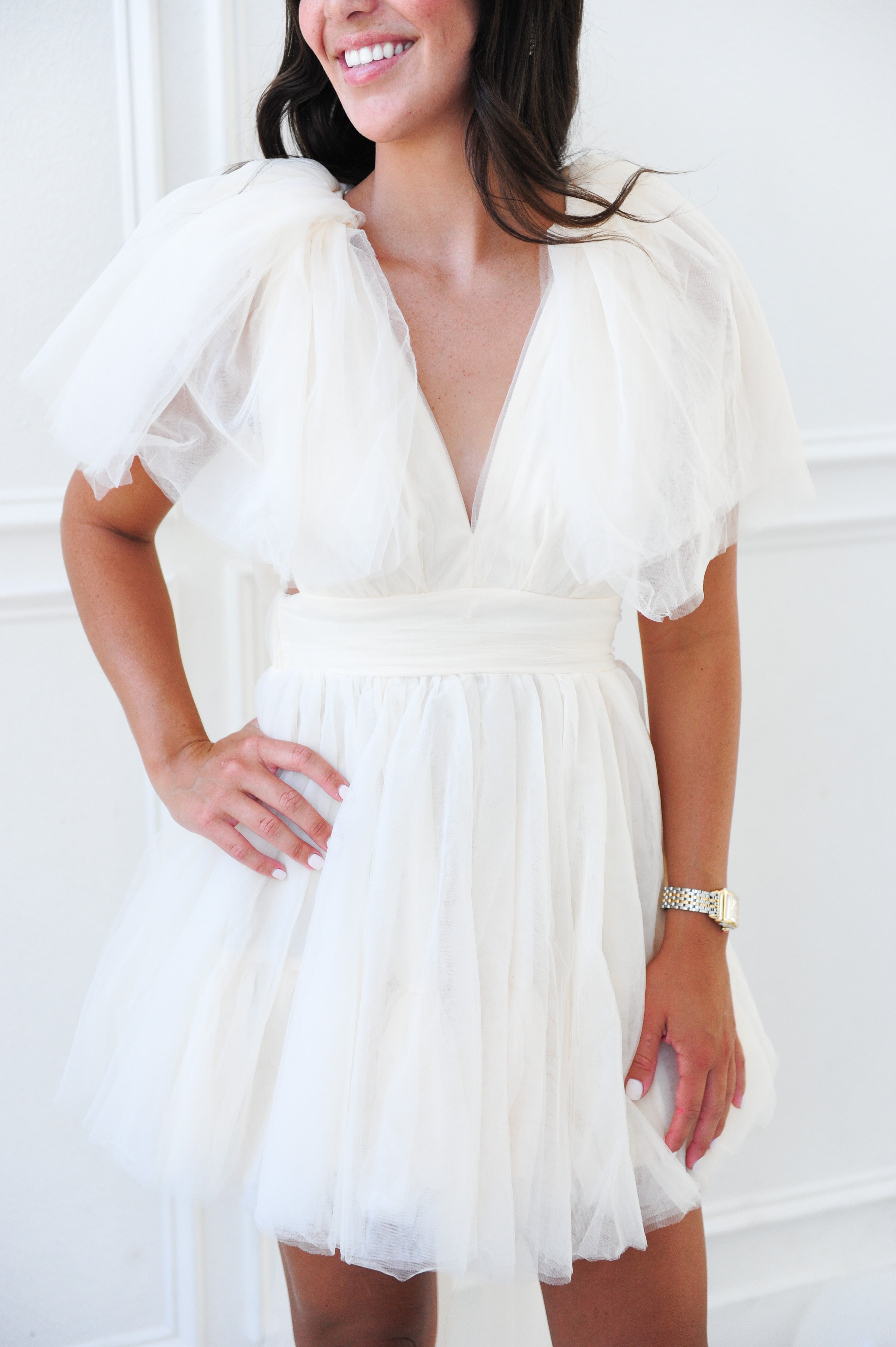 - This dress is sure to turn heads!! With tulle throughout, a tulle bow on the back and a mini train, this dress is made to be the statement!!