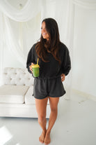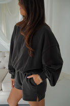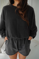 Featuring a charcoal black/gray and an oversized crewneck with matching shorts-- this set is so easy to style and perfect for all the cozy lounge days!