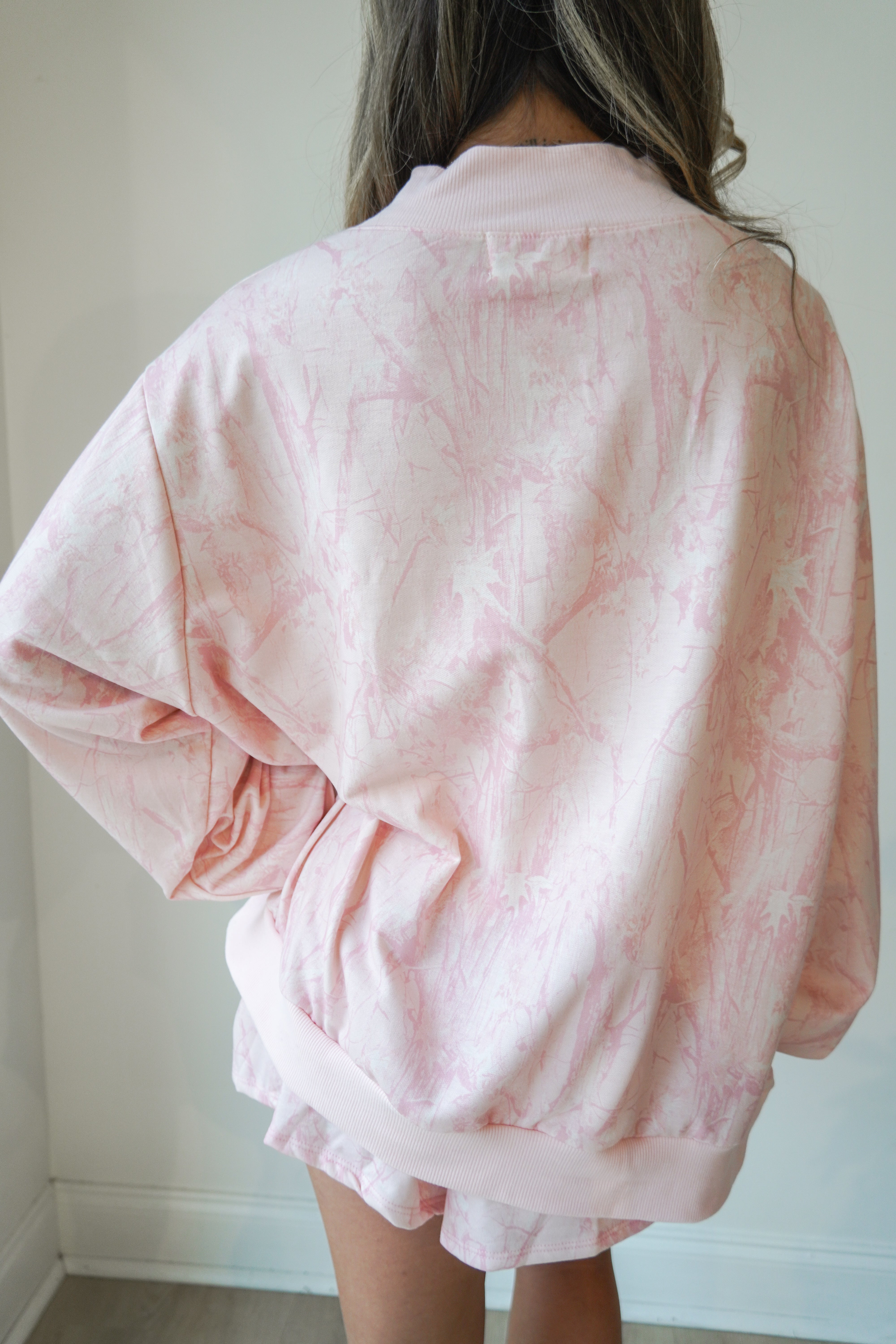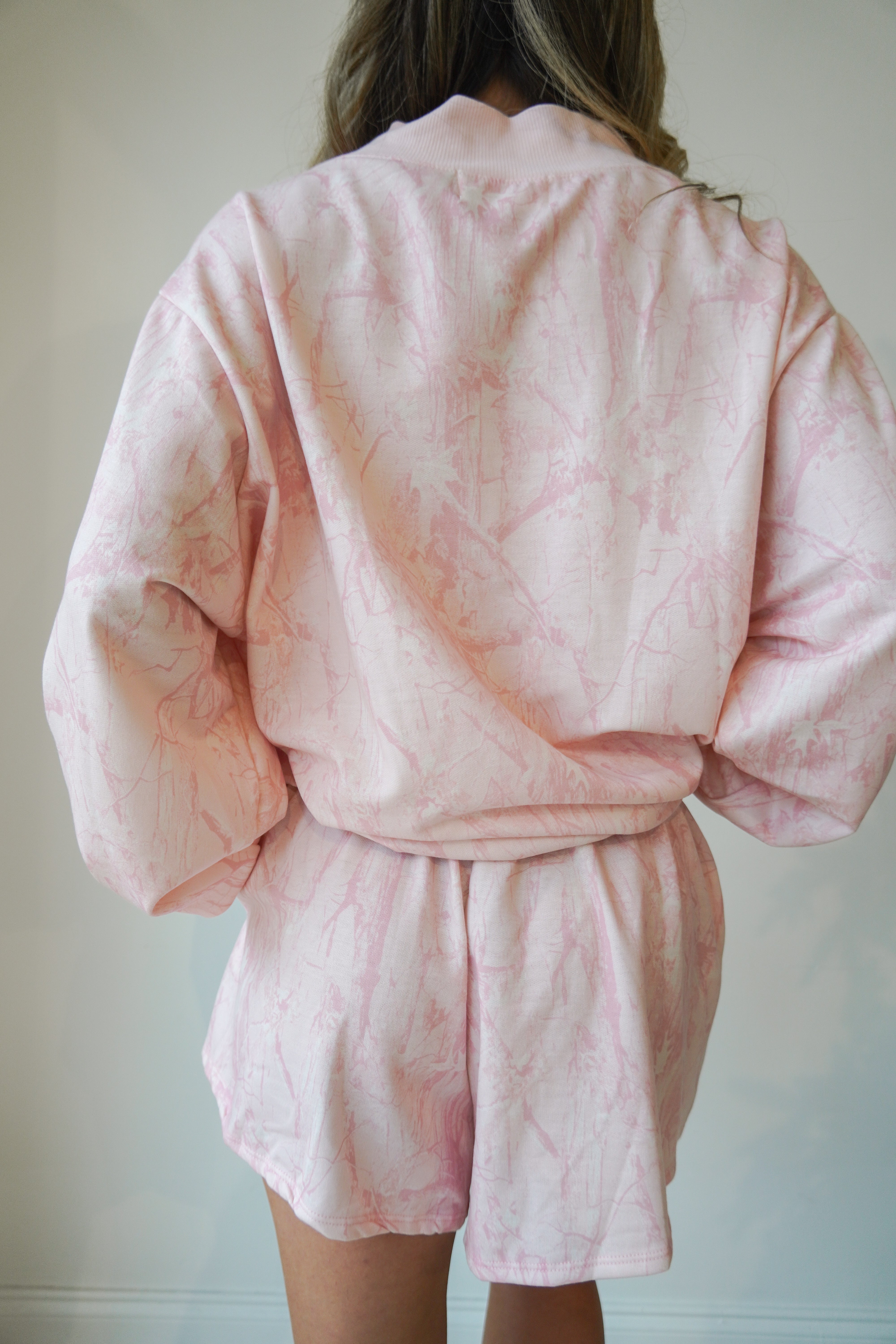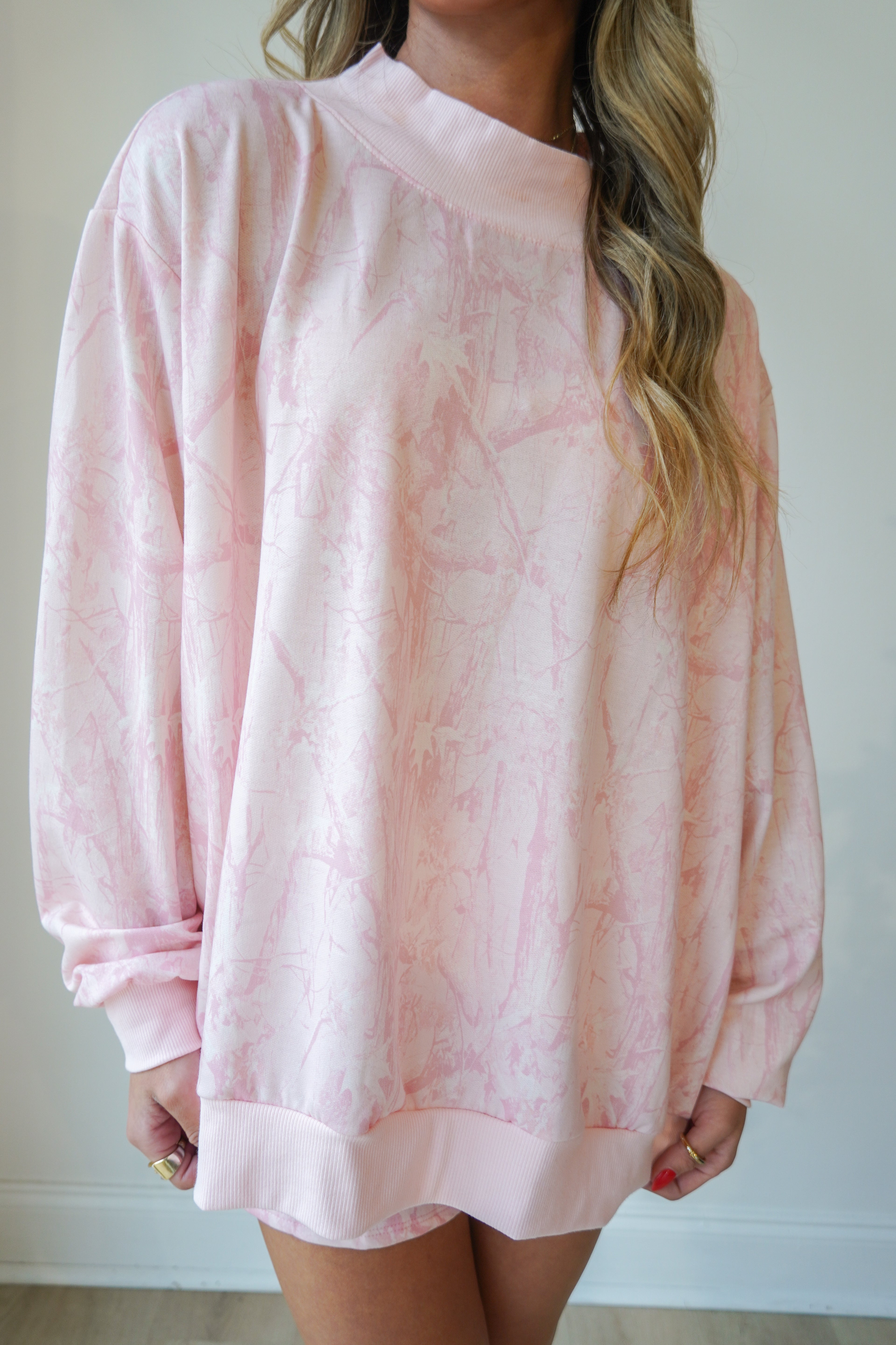 This baby pink camo mock neck is oversized and so cozy-- paired perfectly with the matching flowy shorts. Rib banded hemline and cuffs on the mock neck and the shorts have an elastic waistband with drawstring.