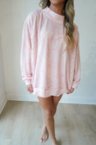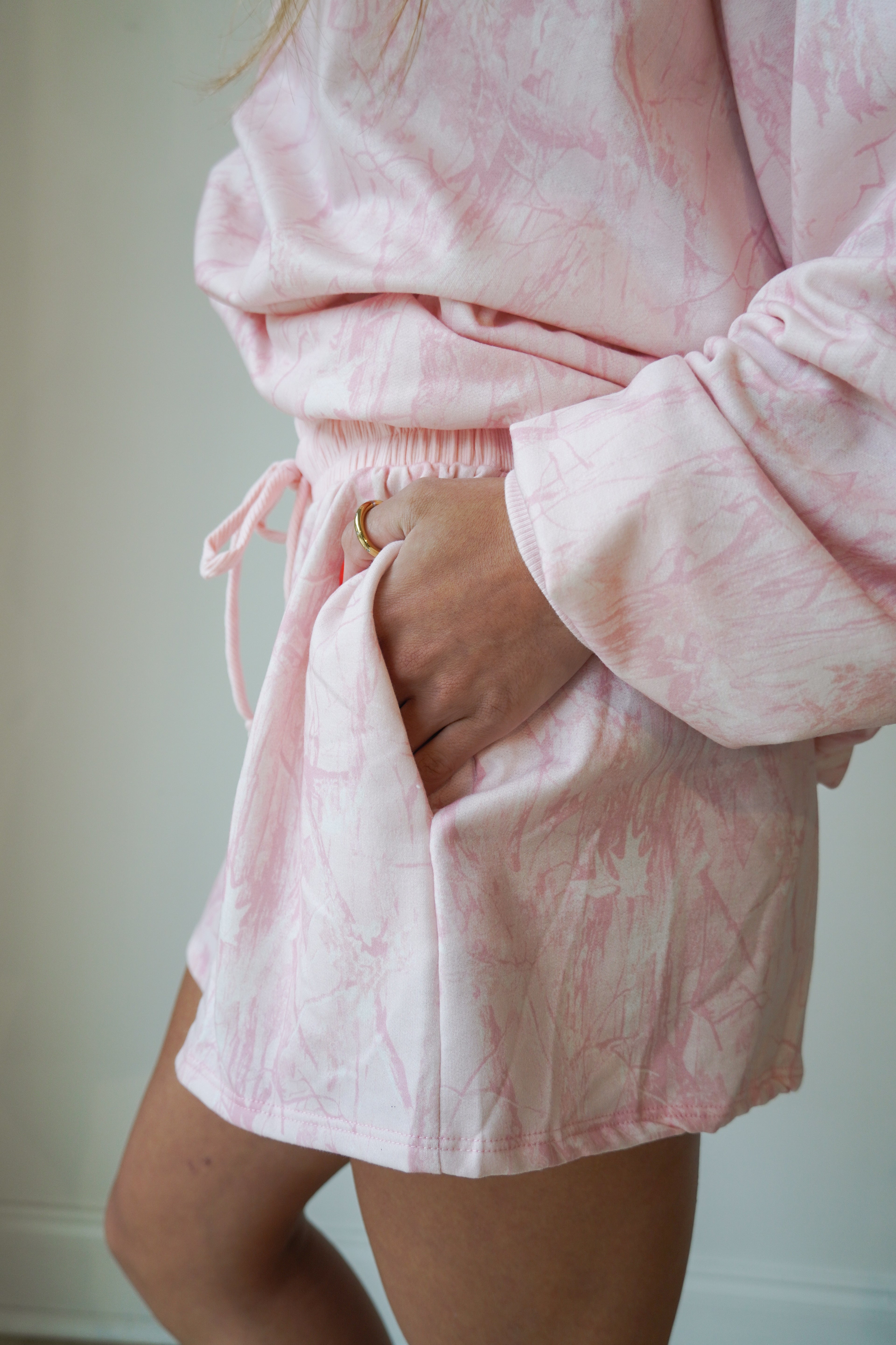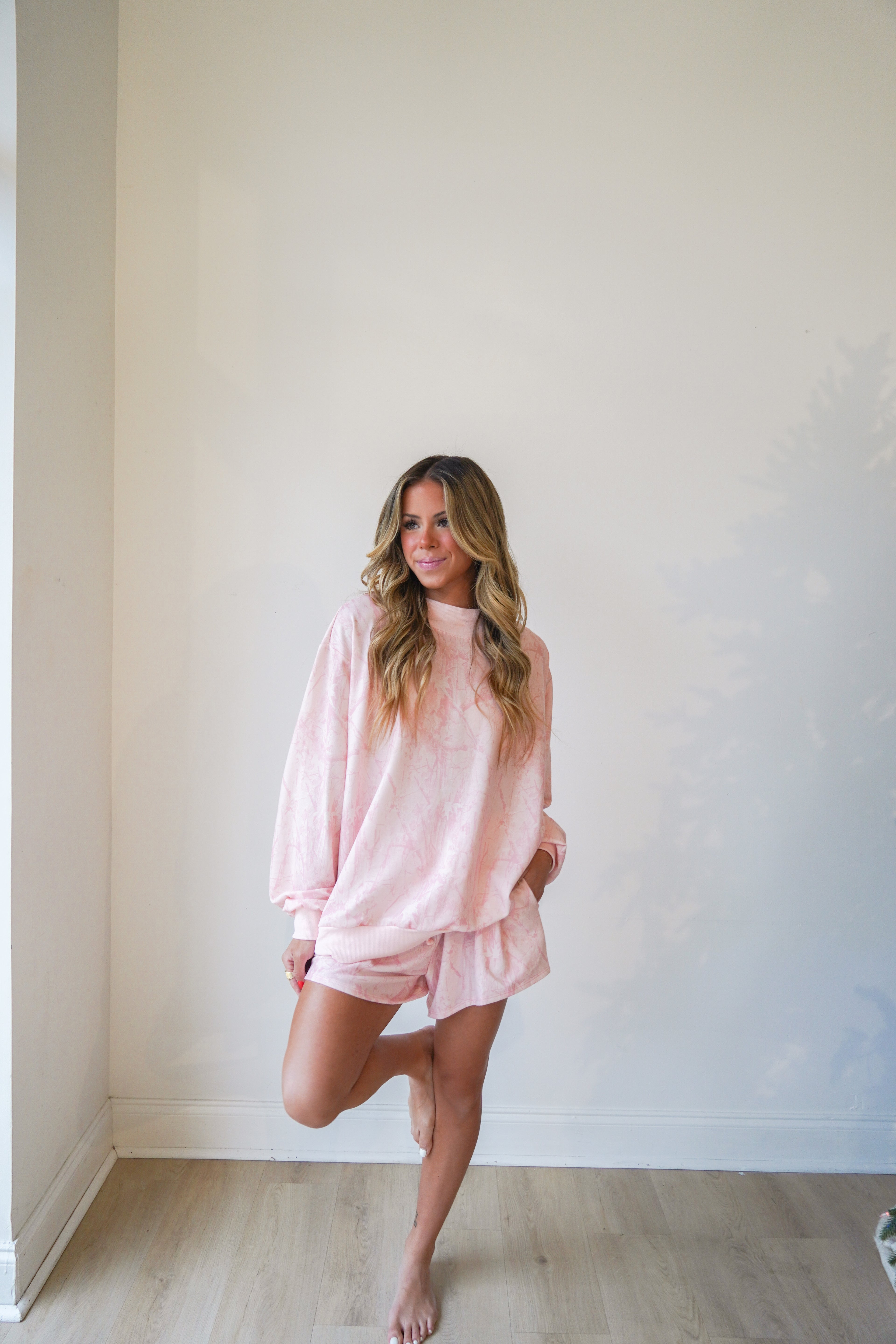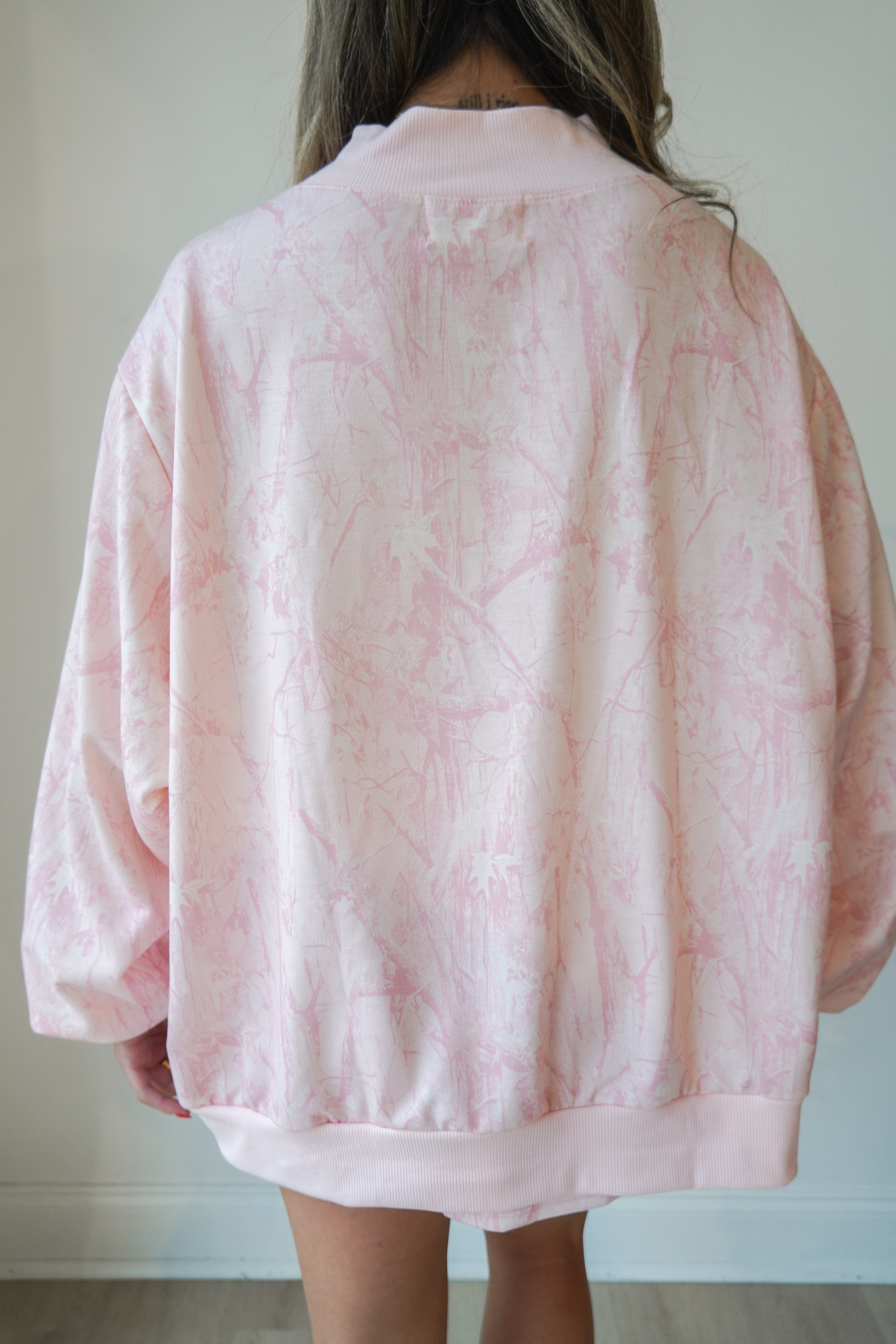This baby pink camo mock neck is oversized and so cozy-- paired perfectly with the matching flowy shorts. Rib banded hemline and cuffs on the mock neck and the shorts have an elastic waistband with drawstring.
