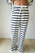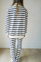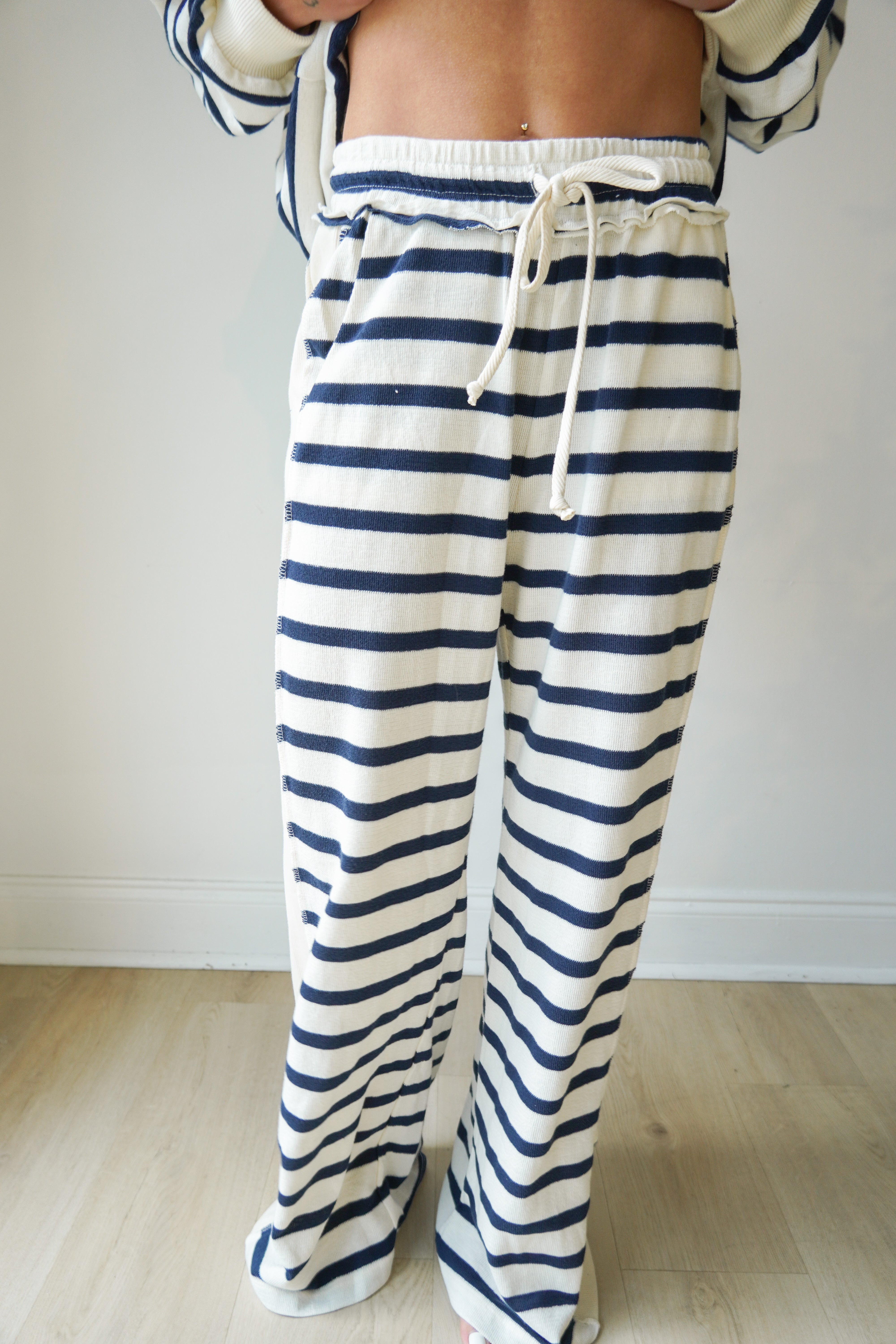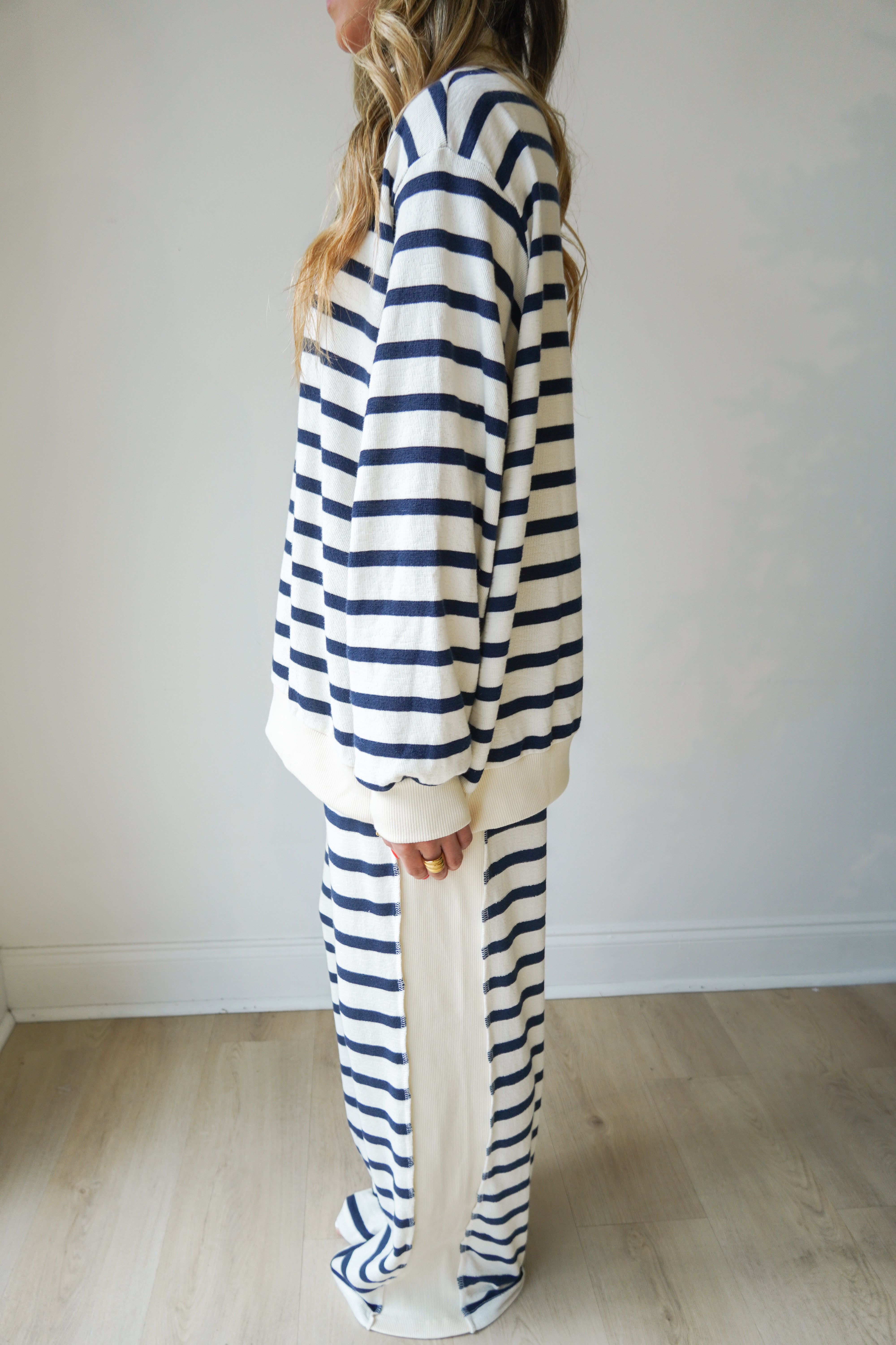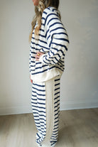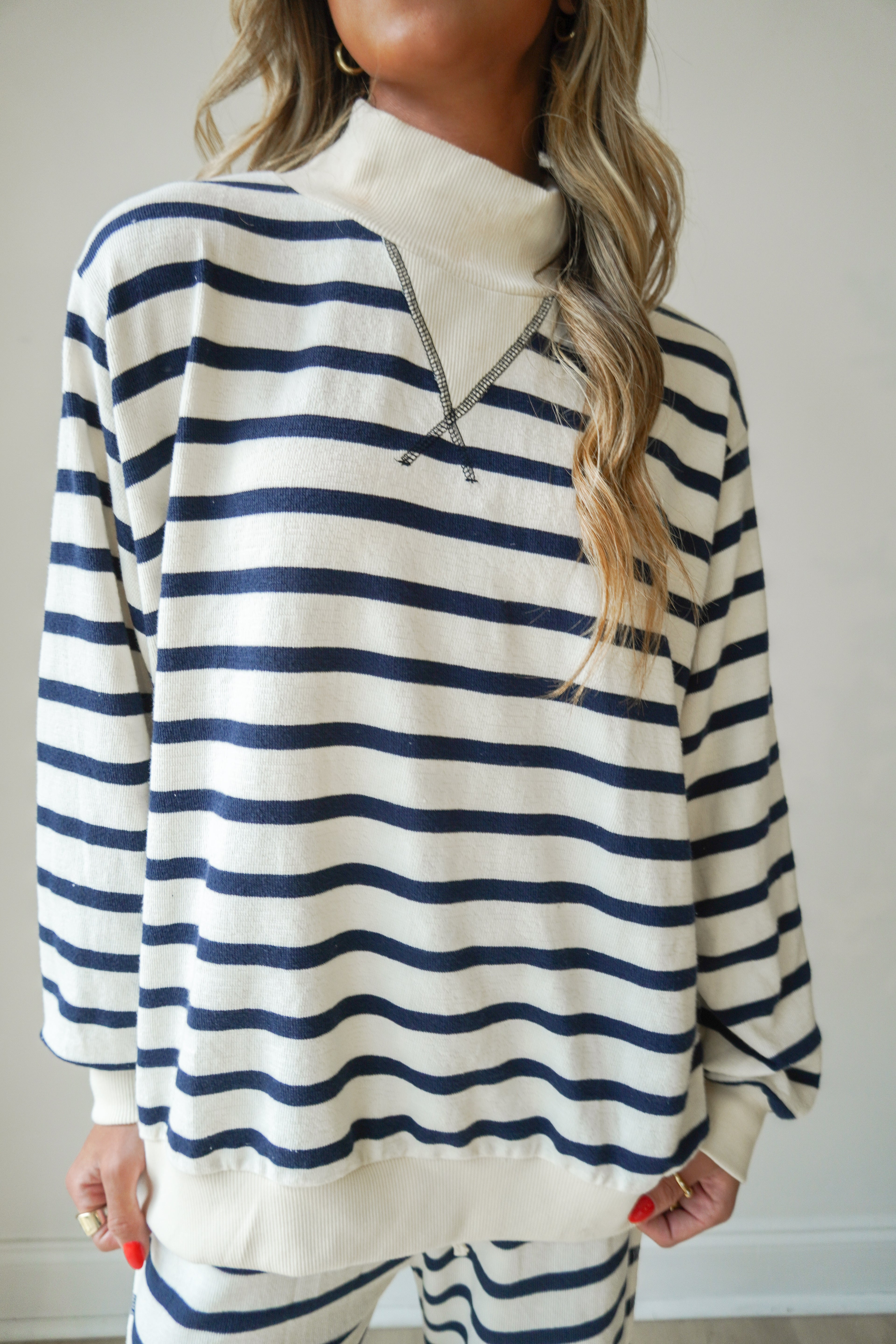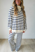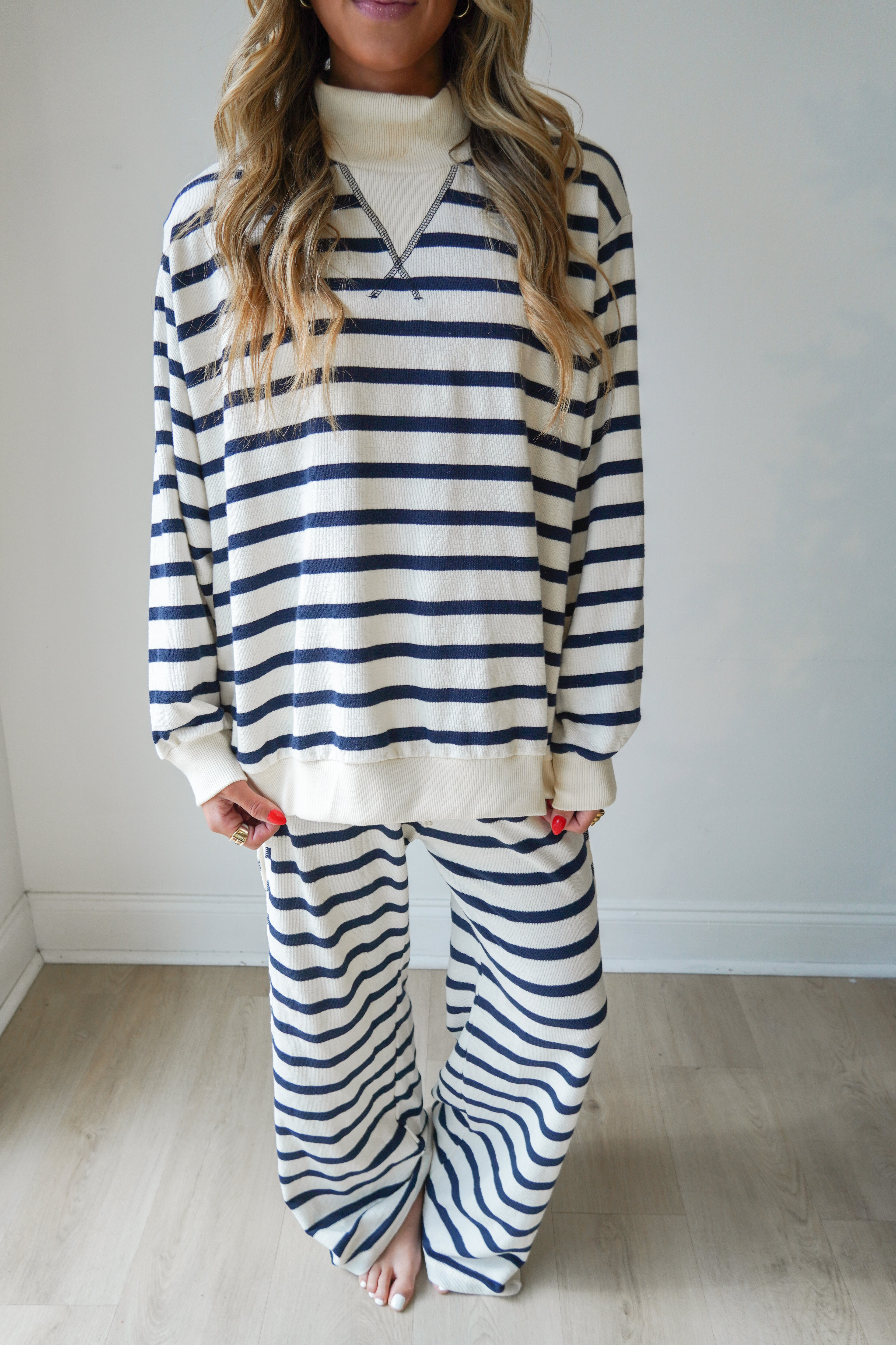 Featuring a navy and ivory striped mockneck with wide leg pants-- this set is chic and sooo cozy!