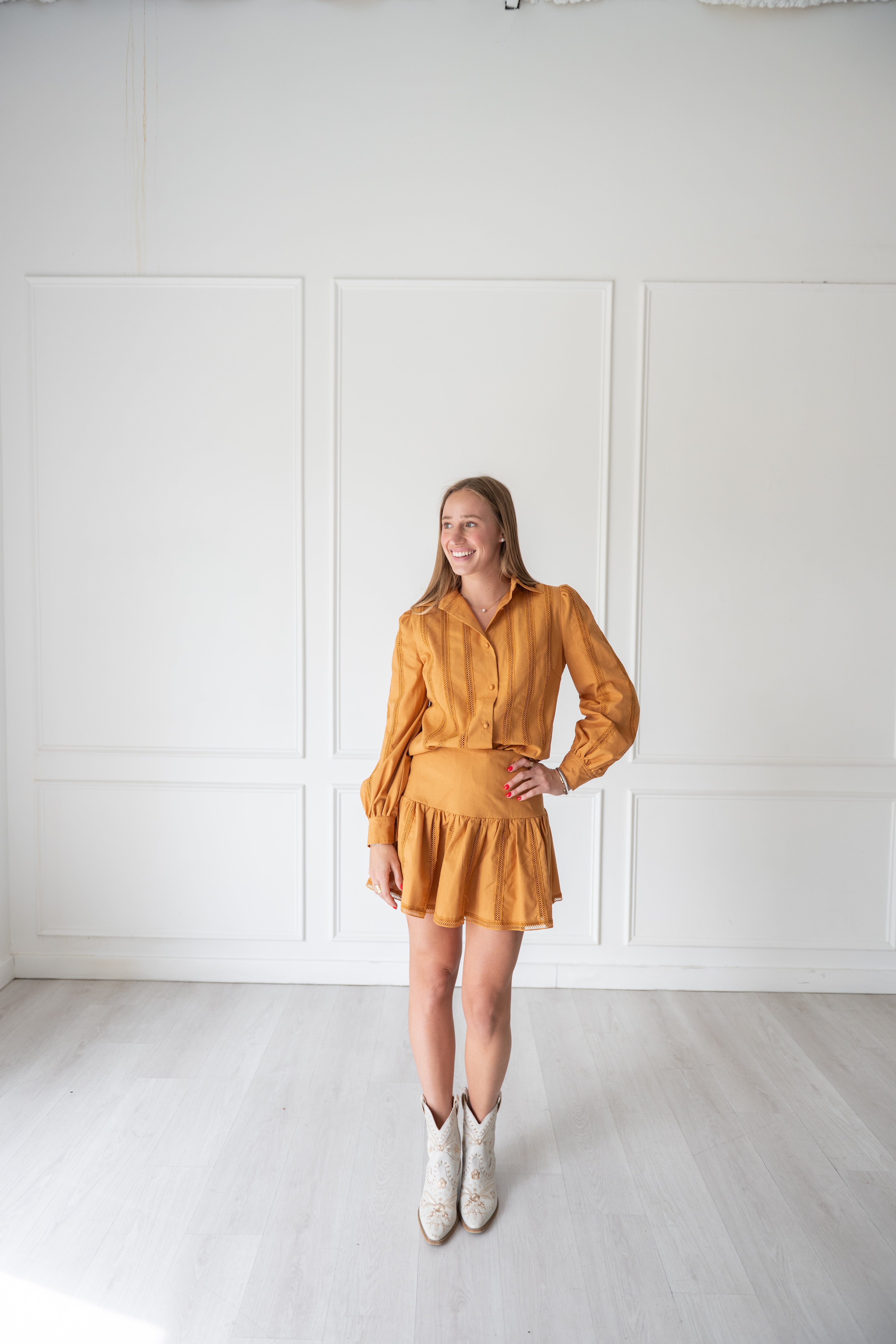 How sweet is this butterscotch set!! Featuring a button down blouse and a high-waisted mini skirt with lace inset stripes– this set is refined and elevated. We love the billowy sleeves with wide cuffs that give the top that cute vintage-inspired look.