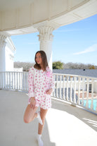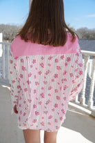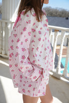 Featuring the prettiest white and pink floral print, an oversized button up collared top and shorts to match-- this set is easy to throw on and go while still looking put together and so girly!