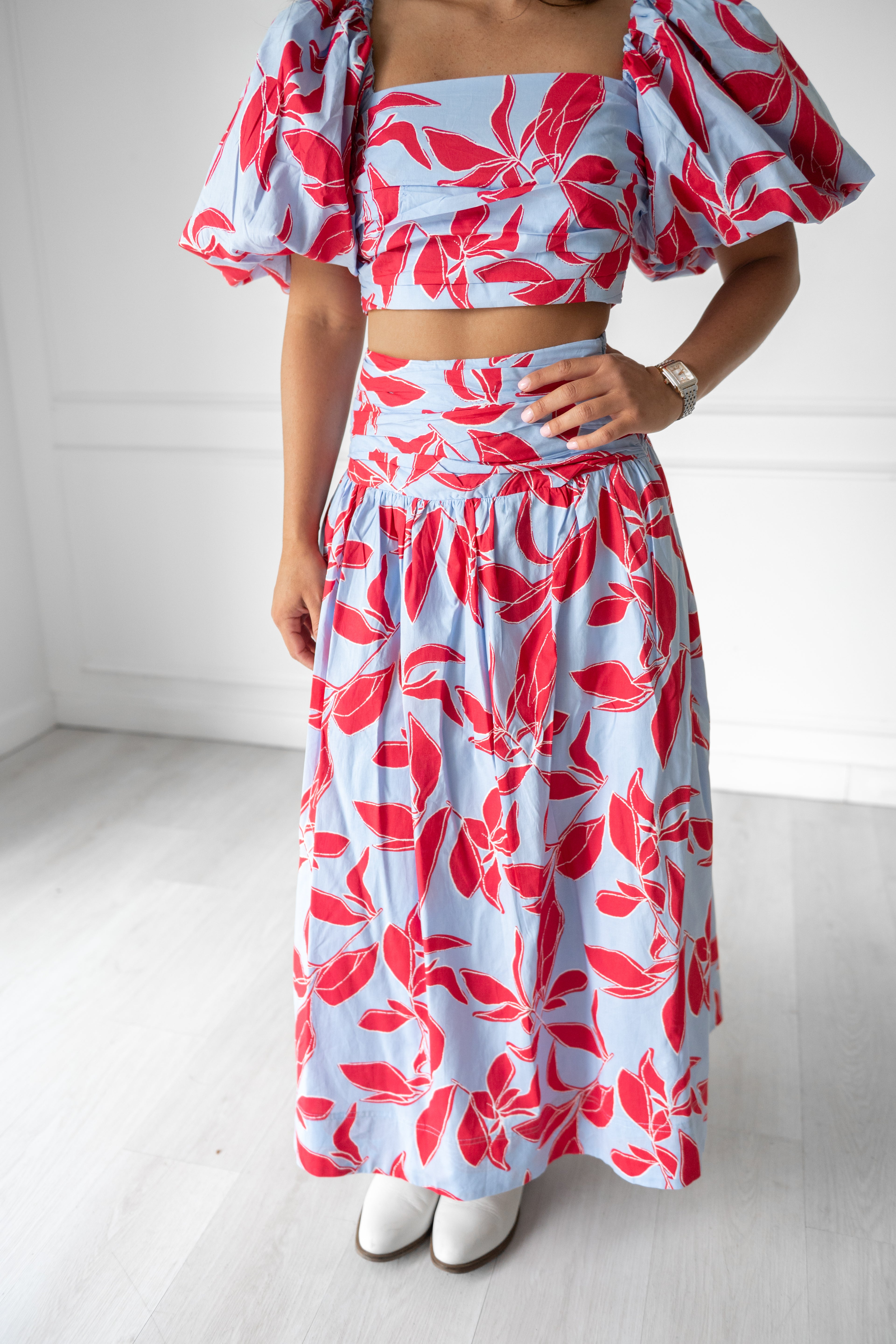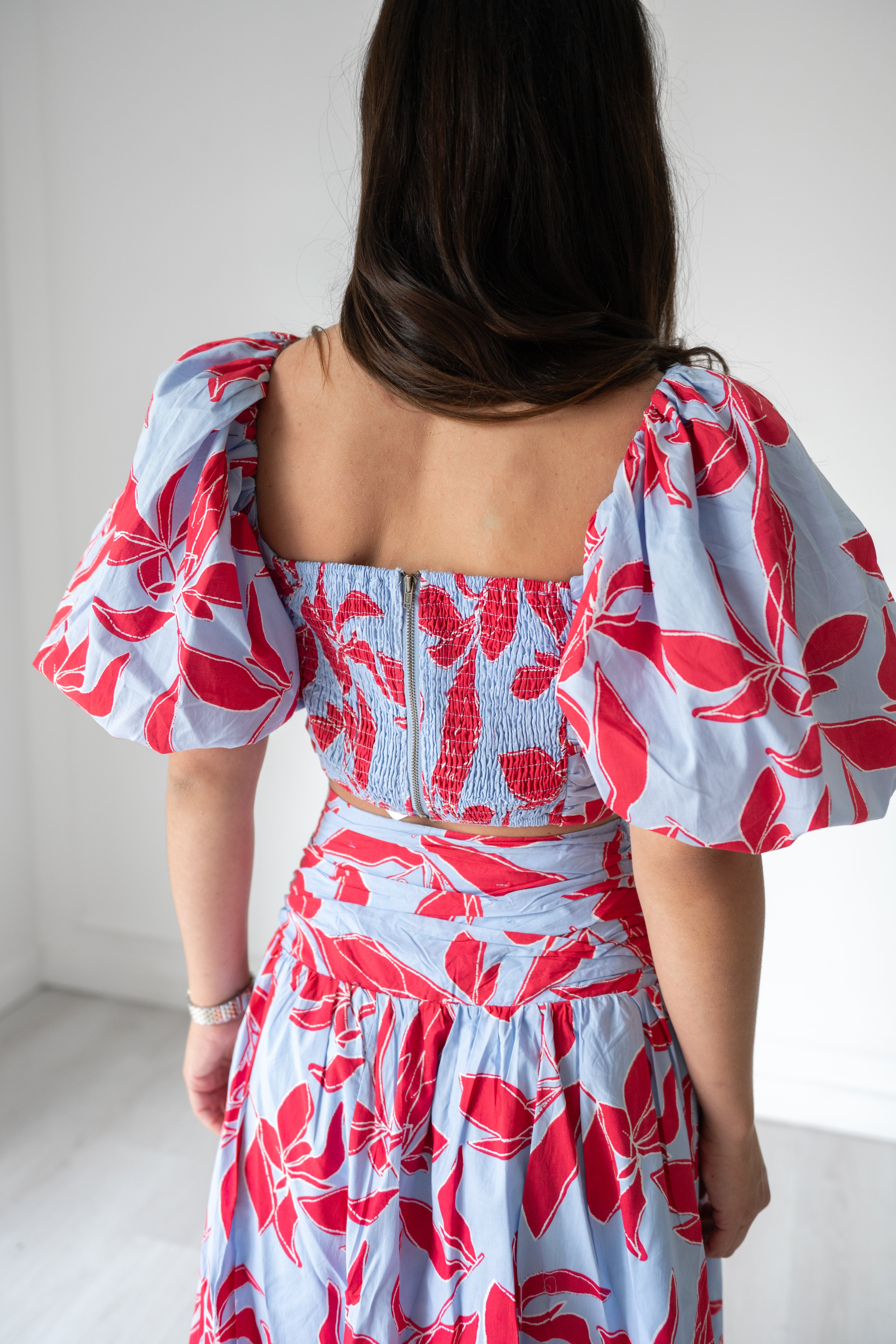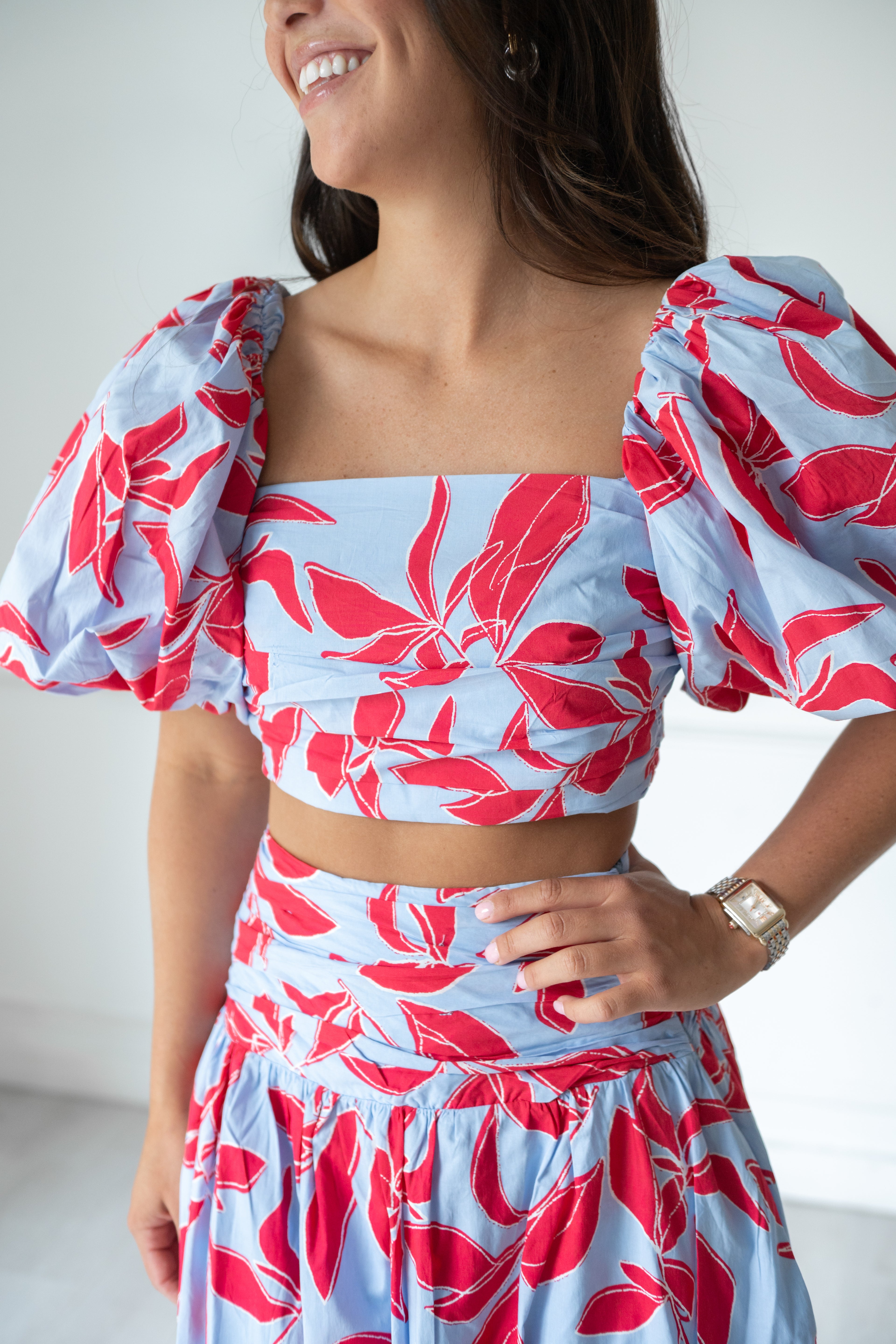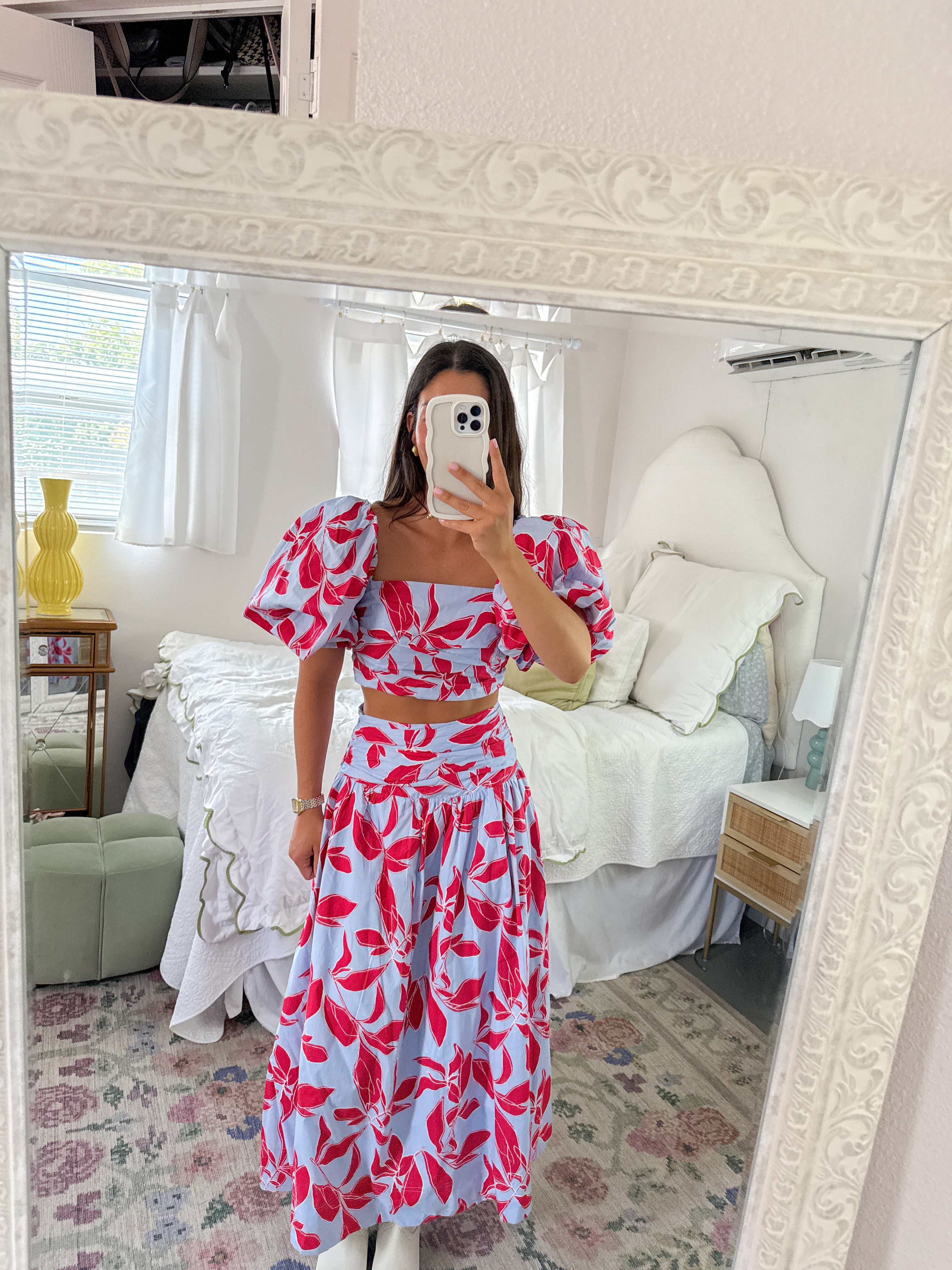 We are OBSESSED with this adorable maxi set!! Featuring a ruched top with fun puff sleeves and a flowy maxi skirt– this look is perfect for our Ole Miss girls or a fancy brunch with friends!