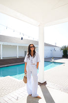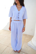 Featuring a baby blue and white seersucker! With adjustable bows, v-neckline, an elastic waistband, and button detailing. We are absolutely obsessed!! The perfect beachy set.