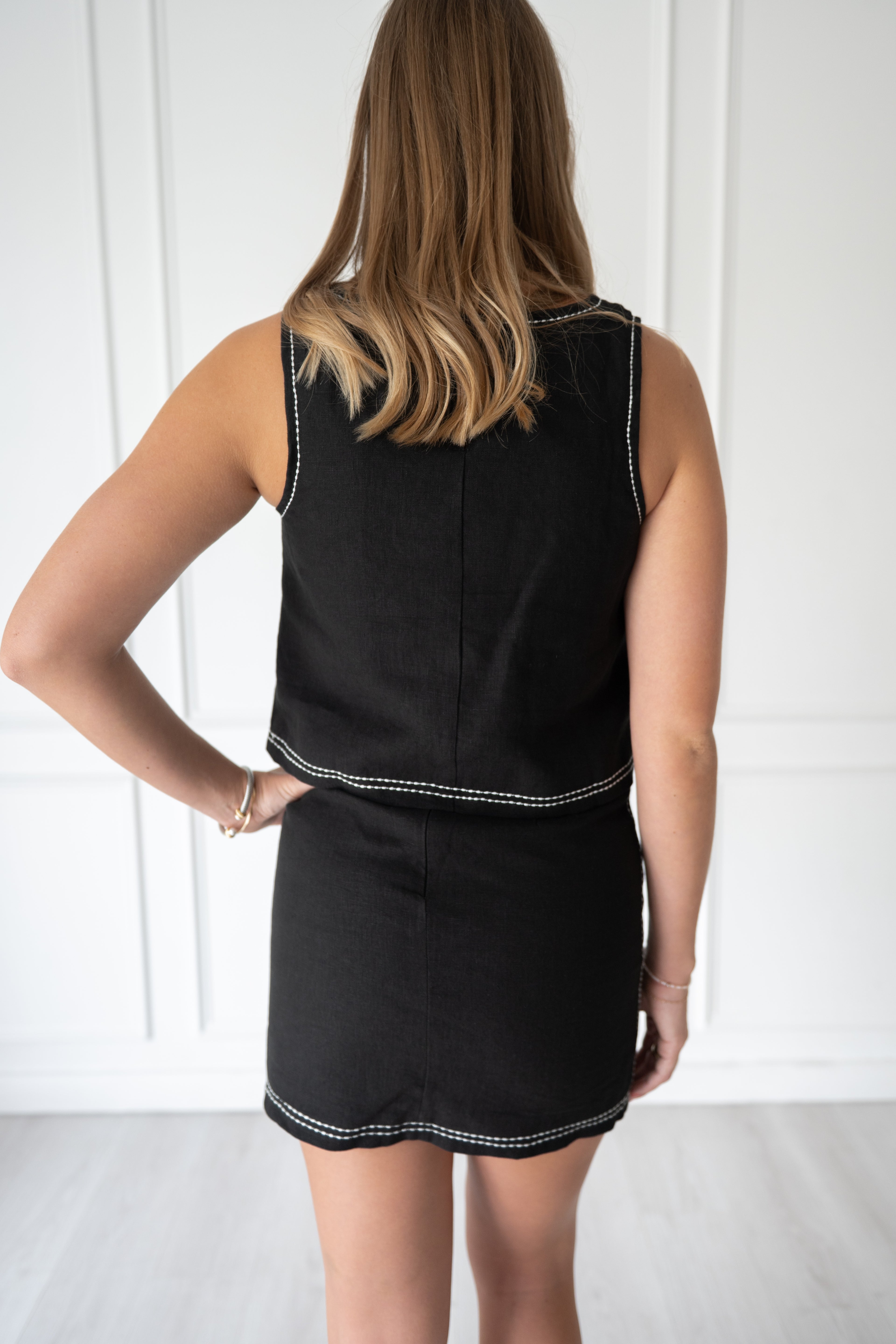 We are obsessed with this stunning linen set!!! Featuring fun white stitching, a square neckline, and a mini skirt– this outfit will have you looking chic an elevated all while feeling cool all gameday long!